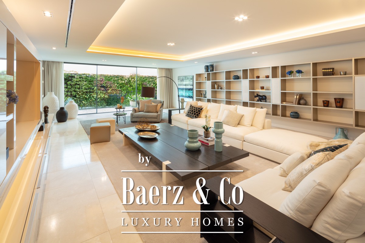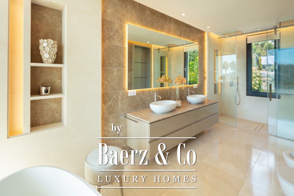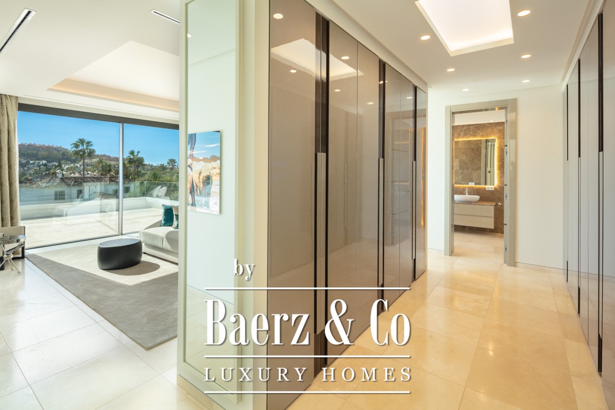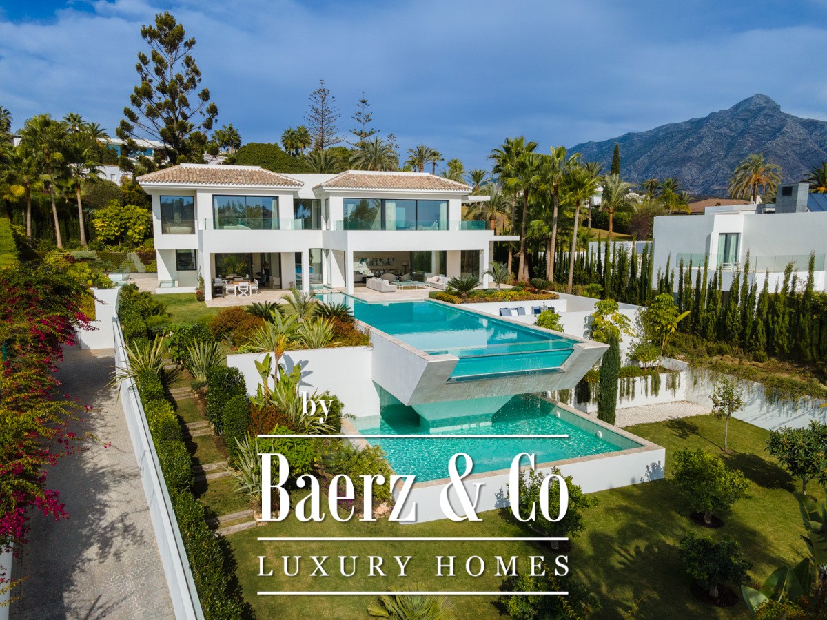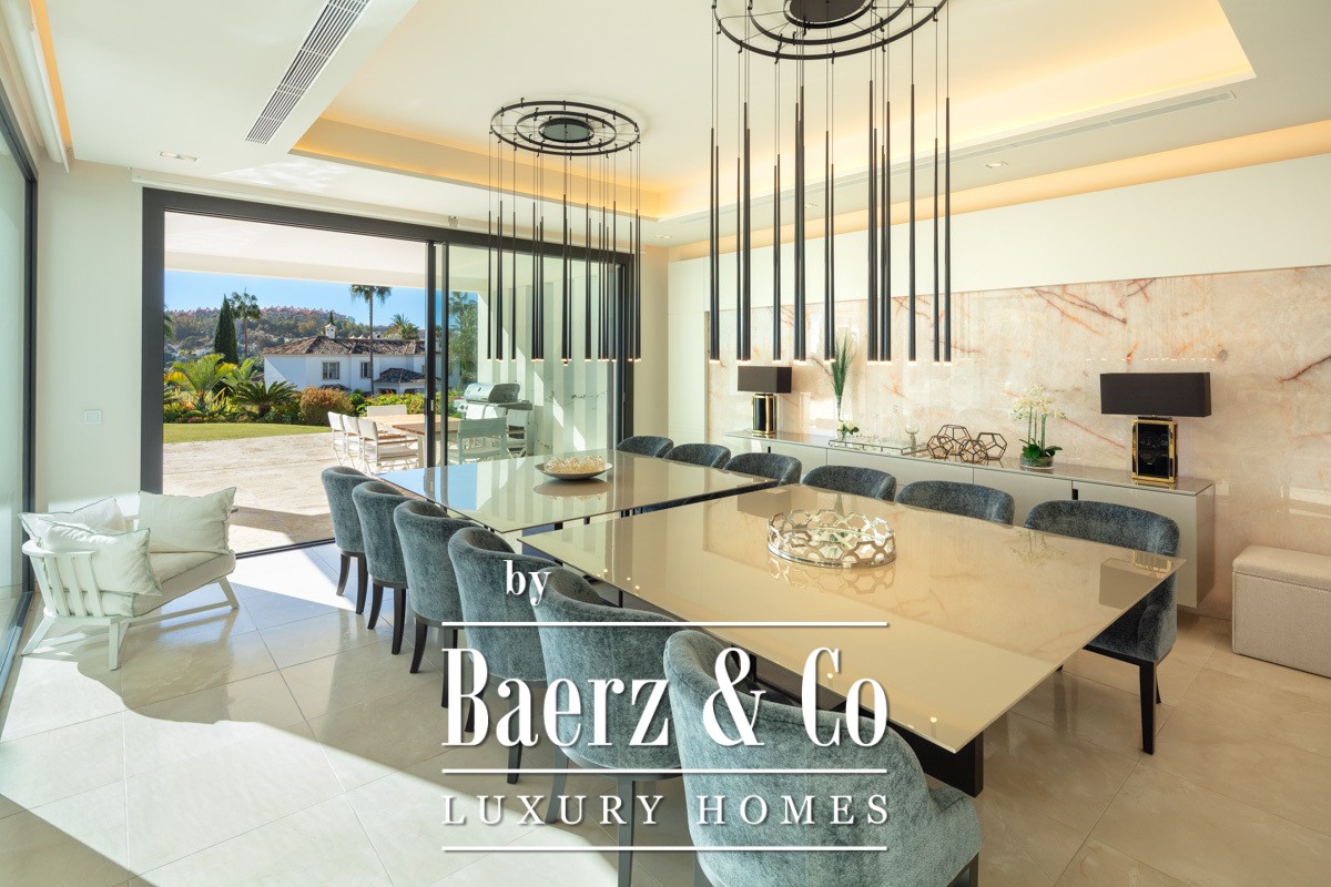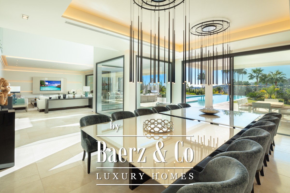 Villa Marbella is gelegen in de vooraanstaande wijk La Cerquilla en biedt een uniek uitzicht over de befaamde Golfvallei. Deze villa in Marbella beslaat 921 m² en ligt op een royaal perceel van 2.104 m². De woning combineert moeiteloos een markant eigentijds design met de ingetogen luxe van natuurlijk licht en royale ruimtes. Bij binnenkomst zorgt een entreehal met dubbele hoogte direct voor een verfijnd gevoel van thuiskomen, waarna u wordt geleid naar een open leefruimte waar hoogwaardige materialen en maatwerk meubilair de toon zetten. De woonkamer geeft toegang tot terrassen met zowel overdekte als open delen en biedt een panoramisch uitzicht op tropische tuinen, een infinity pool en de greens van Los Naranjos Golf, vergezeld door verre berg- en zeezichten.