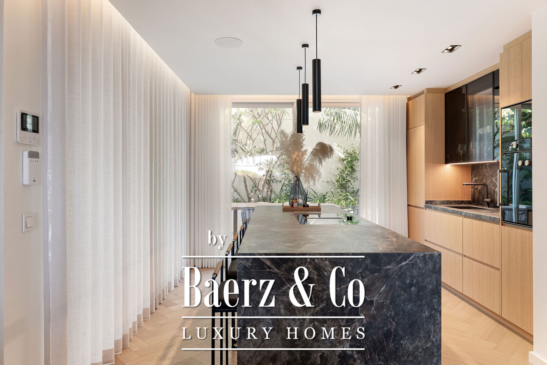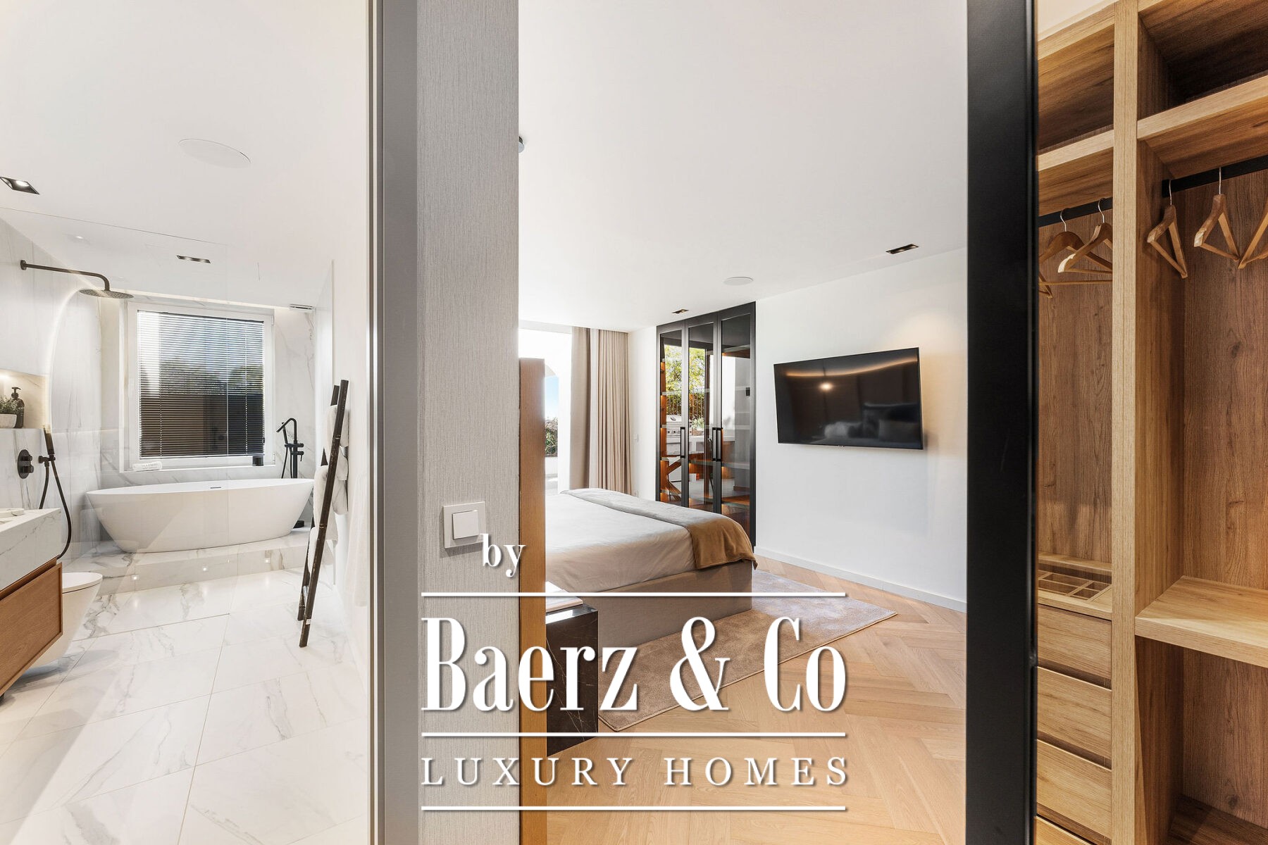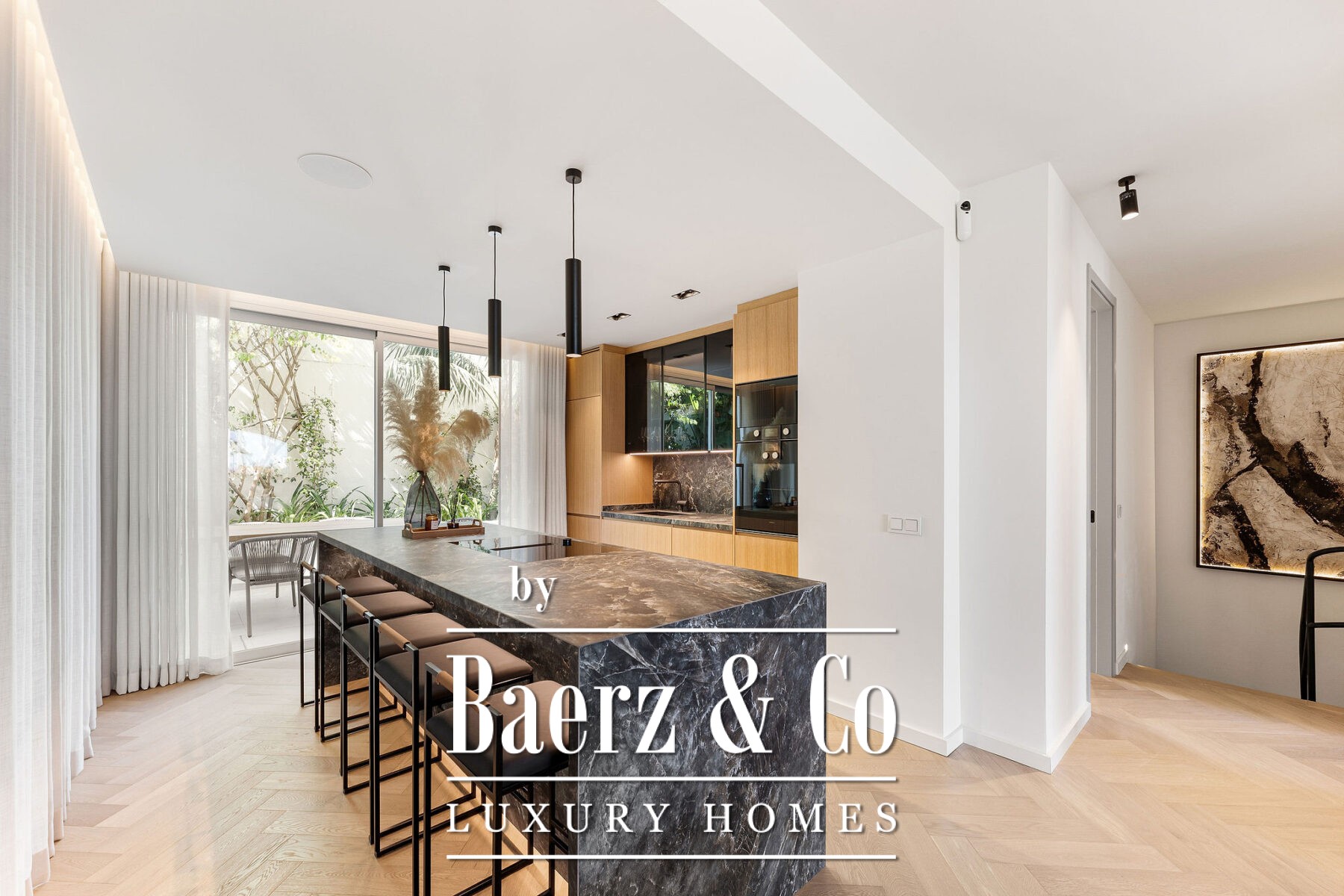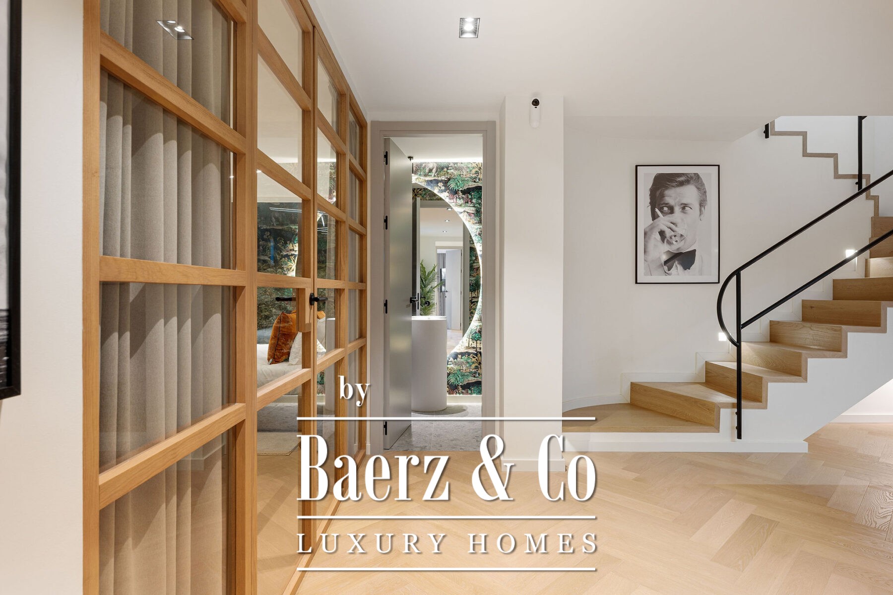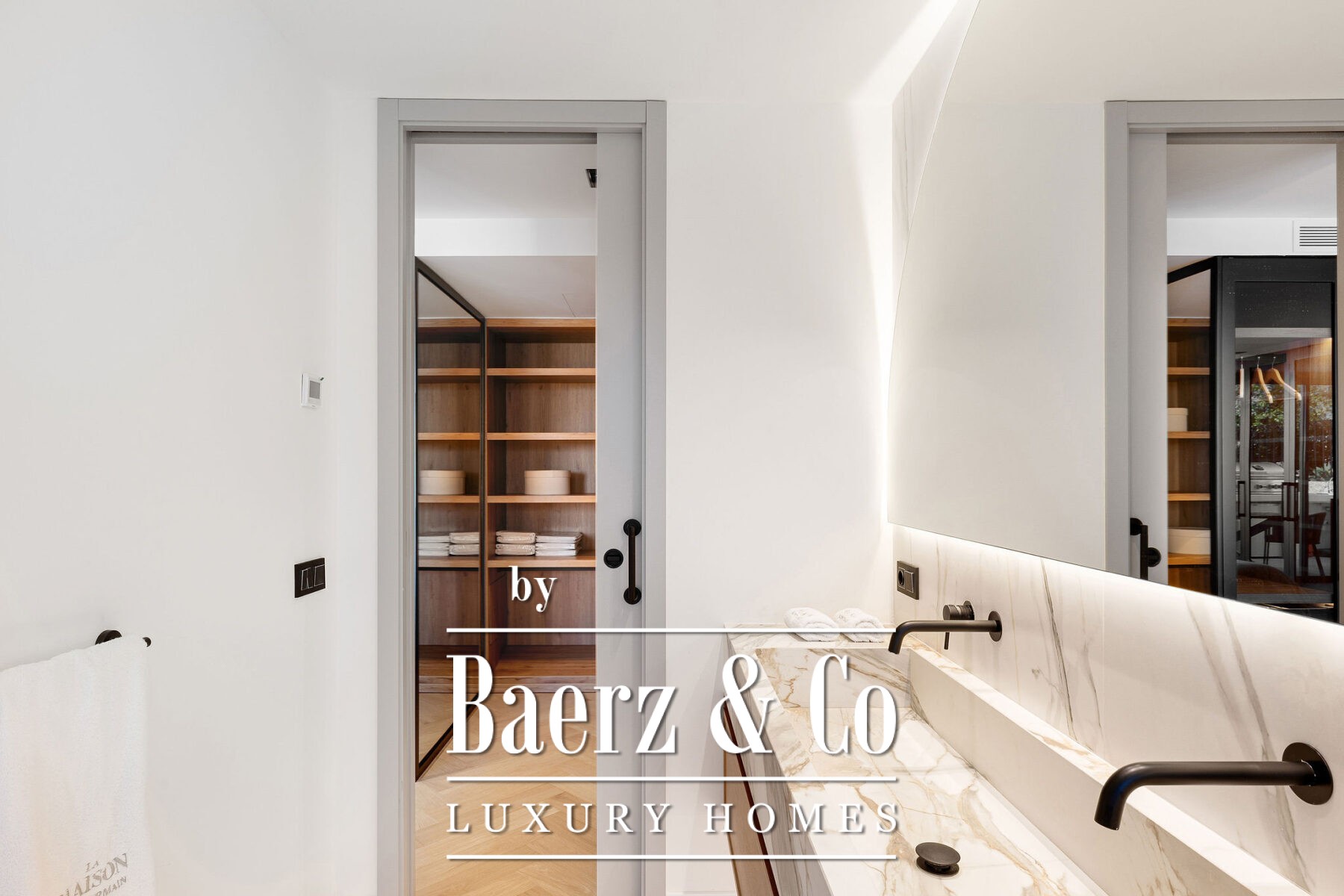 Op de begane grond accentueert natuurlijk licht het open leef- en eetgedeelte en de ultramoderne Gaggenau-keuken, allemaal voorzien van hoogwaardige hout- en marmeren accenten. Visgraatvloeren en een neutraal palet zorgen voor warmte en een ingetogen, verfijnde sfeer. Aansluitend aan de living nodigt het privéterras uit tot diners in de open lucht en momenten van rust en privacy. De royale mastersuite beschikt over een ruime inloopkast, een vrijstaand bad met uitzicht op het terras en een en-suite badkamer. Een extra slaapkamer op deze verdieping creëert flexibele mogelijkheden voor familie of gasten.