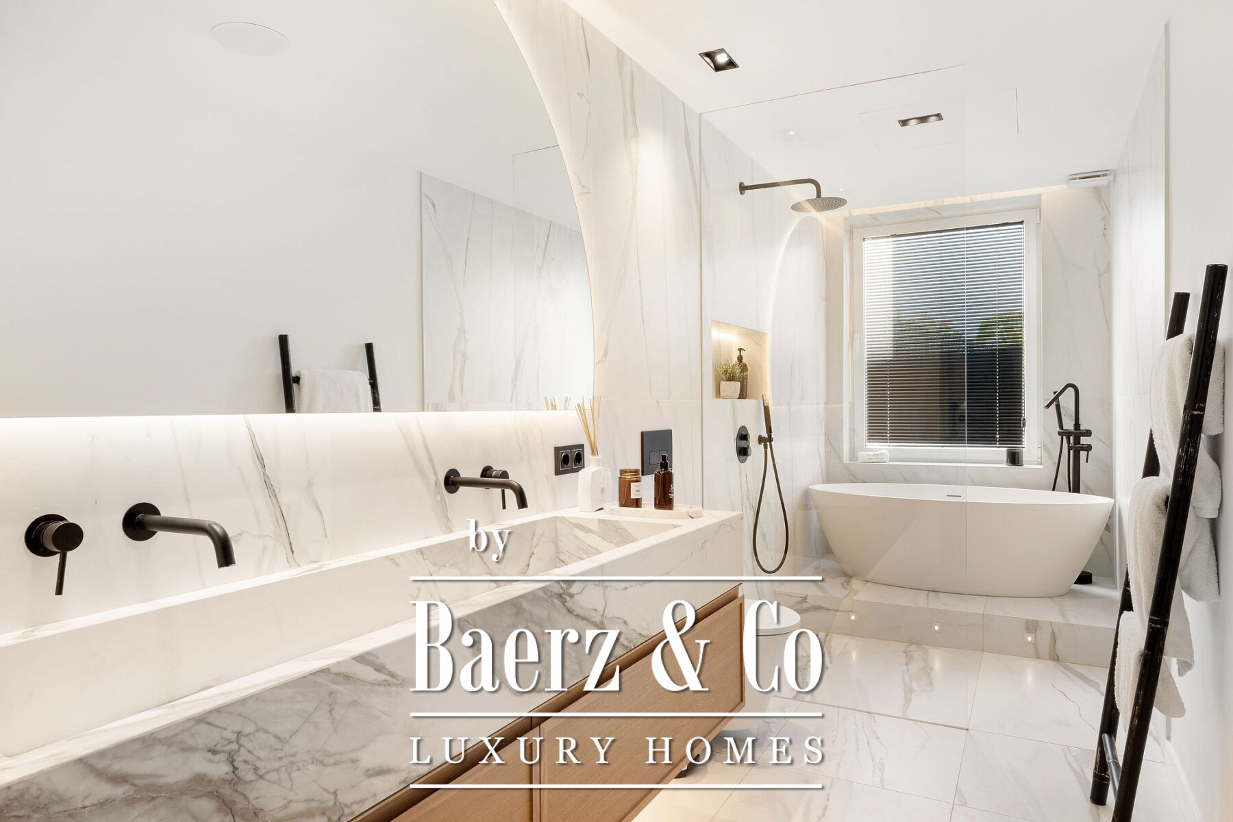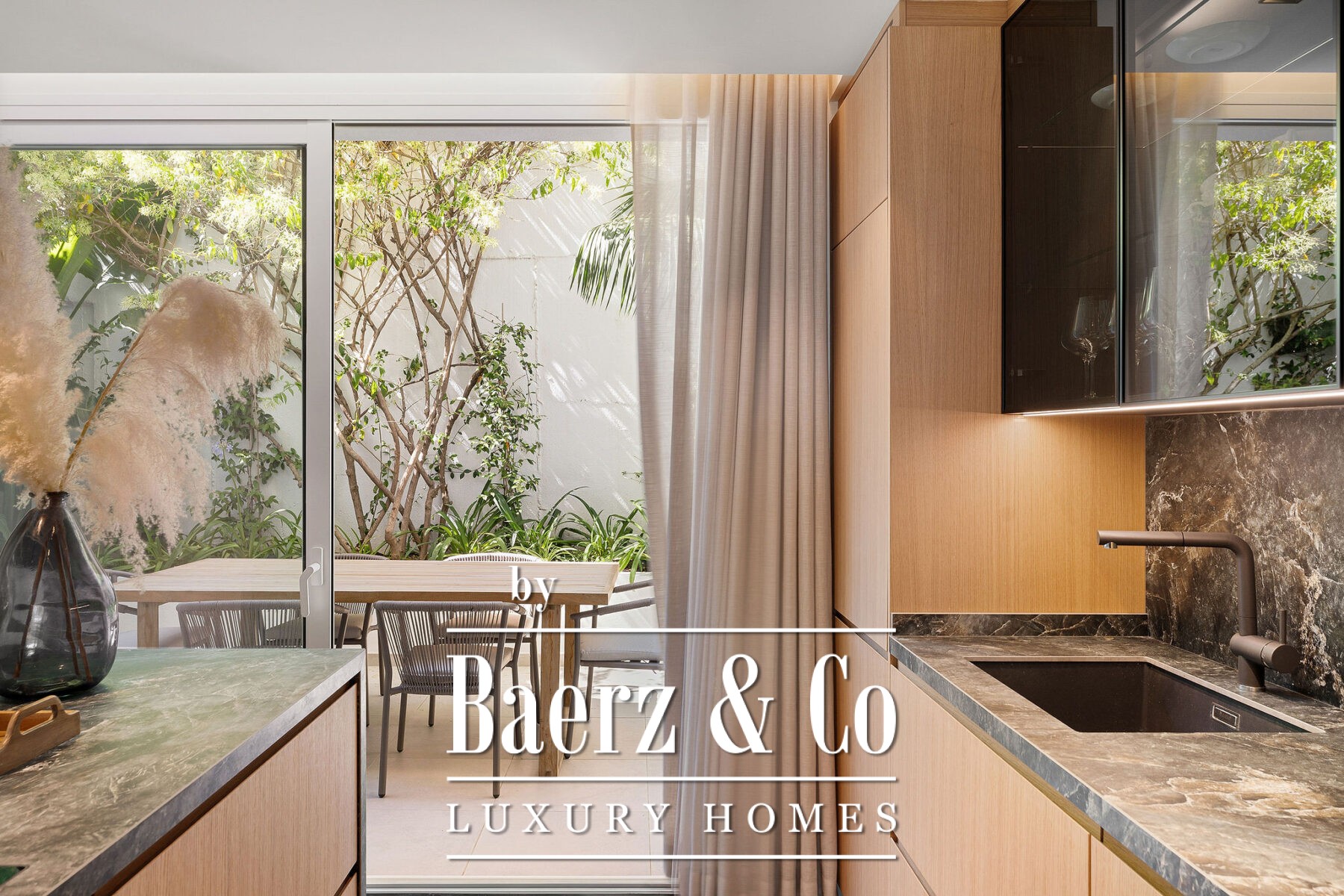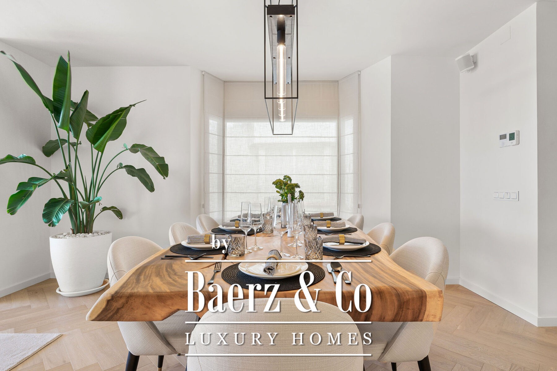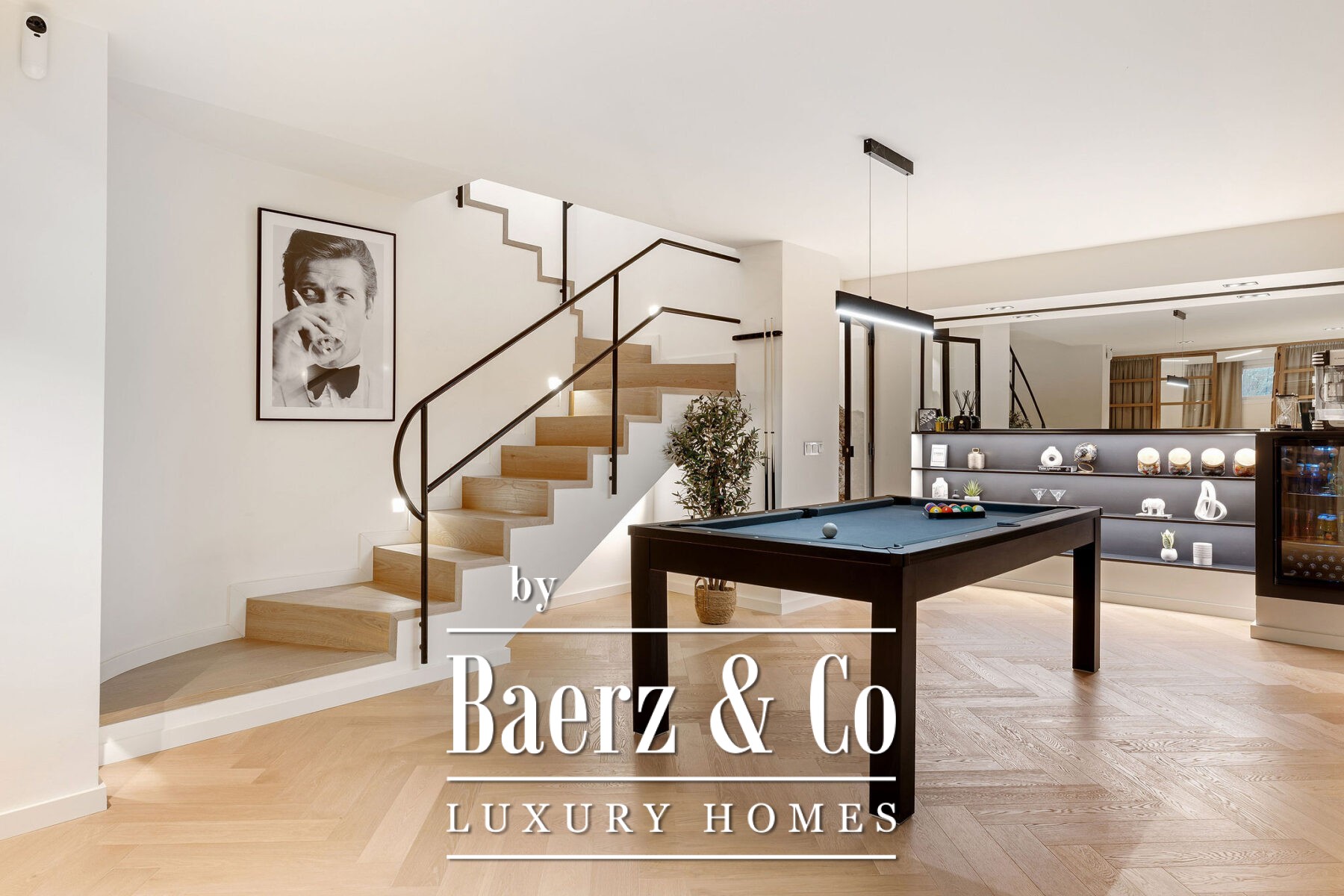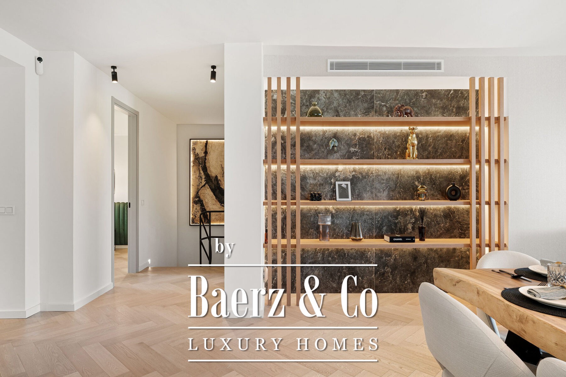 Op de begane grond accentueert natuurlijk licht het open leef- en eetgedeelte en de ultramoderne Gaggenau-keuken, allemaal voorzien van hoogwaardige hout- en marmeren accenten. Visgraatvloeren en een neutraal palet zorgen voor warmte en een ingetogen, verfijnde sfeer. Aansluitend aan de living nodigt het privéterras uit tot diners in de open lucht en momenten van rust en privacy. De royale mastersuite beschikt over een ruime inloopkast, een vrijstaand bad met uitzicht op het terras en een en-suite badkamer. Een extra slaapkamer op deze verdieping creëert flexibele mogelijkheden voor familie of gasten.