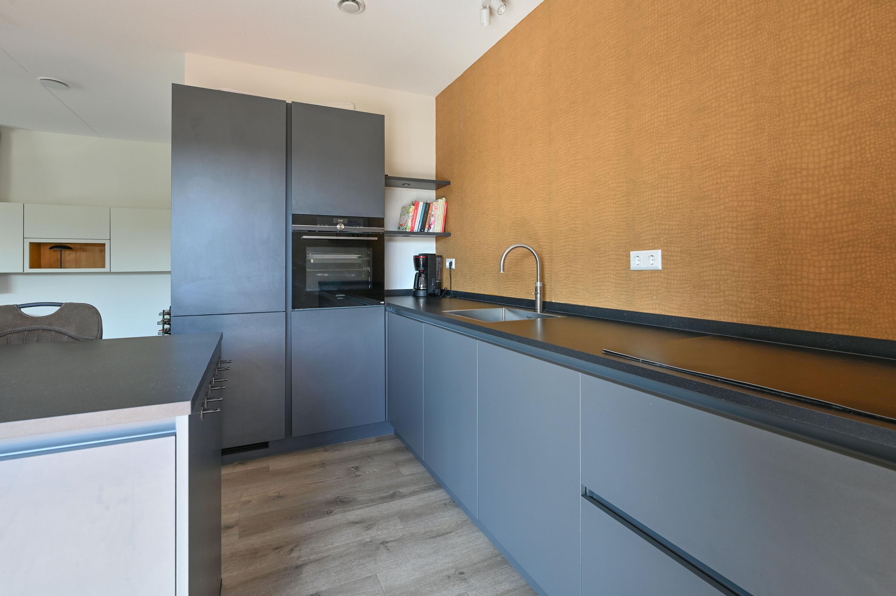Aan het einde van de hal betreedt u via een paneeldeur met melkglas en extra zijraam de royale woonkamer met open keuken. Grote ramen rondom, voorzien van handmatig en elektrisch bedienbare zonneschermen, zorgen voor een prachtig lichtspel en een weids uitzicht. De moderne keuken in antracietgrijs heeft een stijlvol kunststof werkblad, een ruim eiland met lades en een gezellige zitbar. Hoogwaardige Siemens-inbouwapparatuur – waaronder vaatwasser, inductiekookplaat met geïntegreerde afzuiging, combi-stoomoven en koel-/vriescombinatie – maken koken hier een genot. De woonkamer is ruim opgezet en biedt de mogelijkheid om diverse zithoeken te creëren of af en toe de zithoek te veranderen van opzet. Via openslaande deuren in de keuken stapt u de achtertuin in, waar een elektrisch zonnescherm voor schaduw zorgt op zonnige dagen. De eetkamer sluit naadloos aan op de keuken, met daarachter de sfeervolle zithoek. Ook vanuit hier leiden openslaande deuren naar de zonnige zijtuin op het zuiden. De gehele begane grond is voorzien van een onderhoudsvriendelijke pvc-vloer in warme houtlook met comfortabele vloerverwarming. Alle ramen en buitendeuren zijn uitgerust met horren – een detail dat bijdraagt aan het wooncomfort.