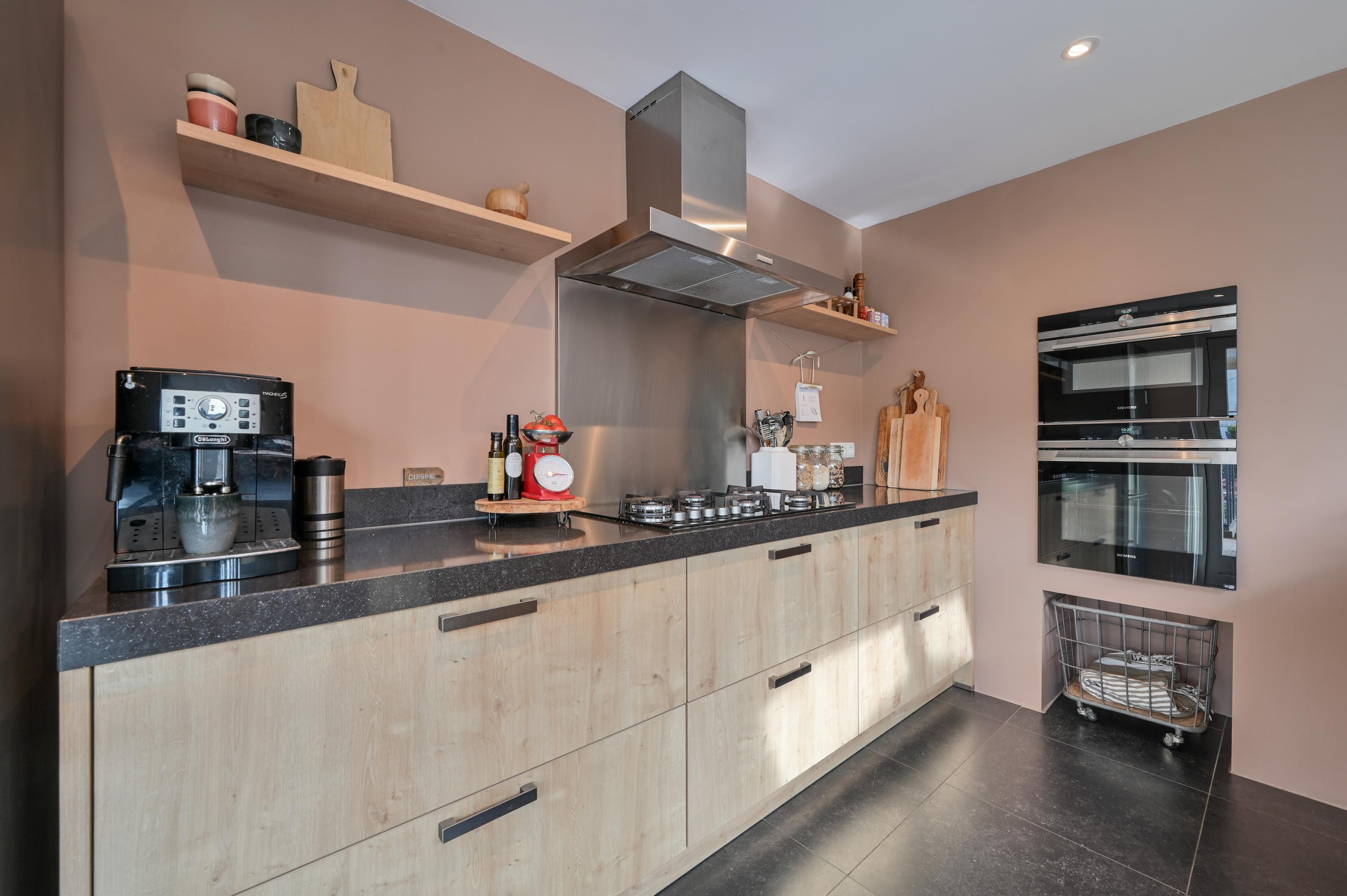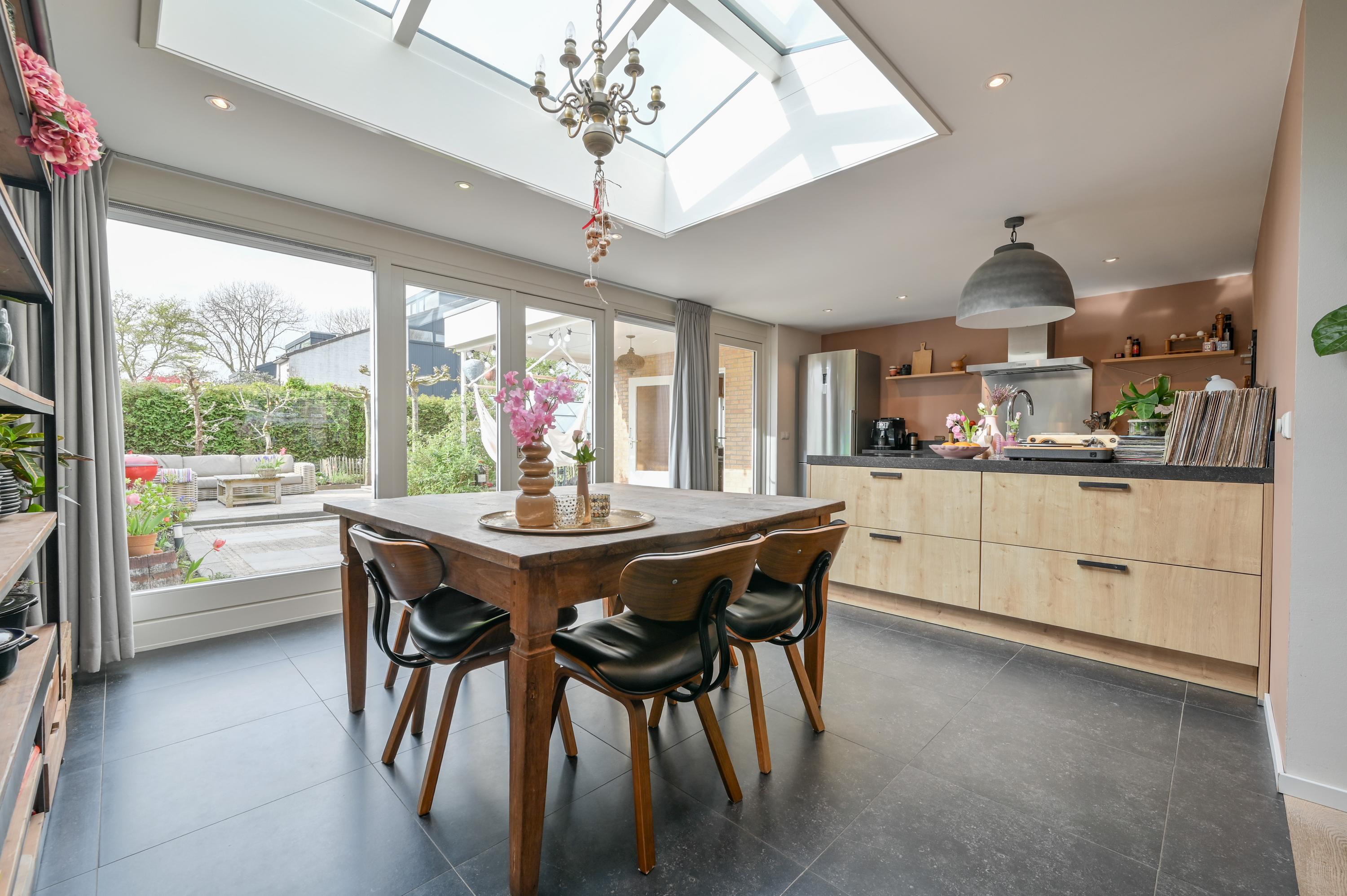 Aan de achterzijde is de woning uitgebouwd, waardoor een royale leefkeuken is ontstaan die echt het middelpunt van het huis vormt. Dankzij de lichtstraat valt hier de hele dag door, een prachtige en natuurlijke lichtinval naar binnen. De tegelvloer met vloerverwarming zorgt voor comfort in elk seizoen. De keuken is praktisch én luxe ingericht met een spoeleiland voorzien van vaatwasser en een Grohe kokendwaterkraan. Aan de andere zijde bevindt zich het kookgedeelte met een 5-pits gaskookplaat, oven en combi-oven. De leefkeuken is ruim genoeg voor een grote eettafel en vormt daarmee de ideale plek voor lange diners en gezellige momenten met familie en vrienden. Vanuit de openslaande deuren in het eetgedeelte én via een aparte loopdeur is er directe toegang tot de tuin, waardoor binnen en buiten moeiteloos in elkaar overlopen.