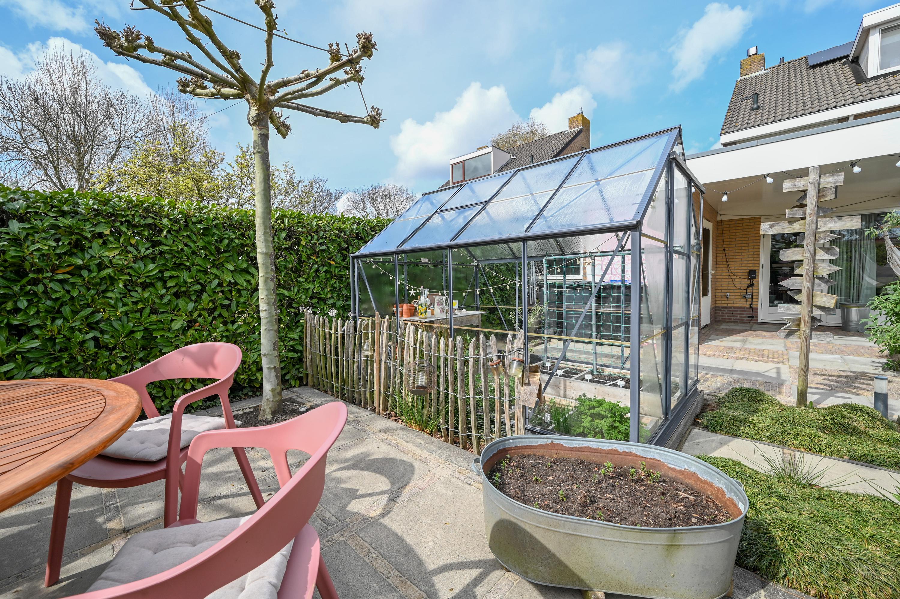De tuin zelf is met zorg en sfeer aangelegd, met een mix van terrassen, borders en groen. Een klein kasje geeft ruimte voor eigen teelt en hobby’s, terwijl de fruitbomen zorgen voor een speels en natuurlijk karakter. Door de indeling zijn er verschillende plekken om te zitten, steeds met een andere beleving van zon en privacy.