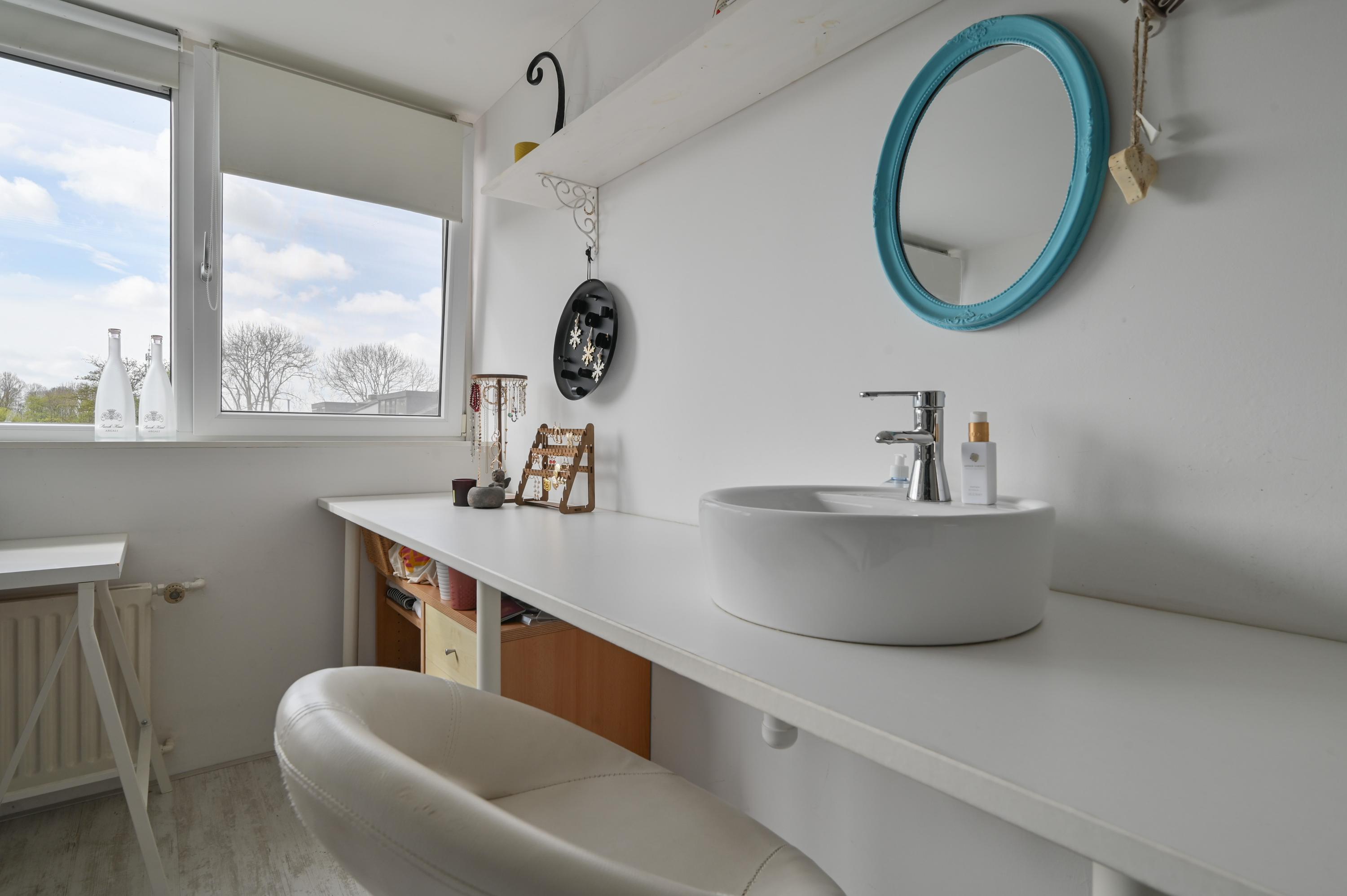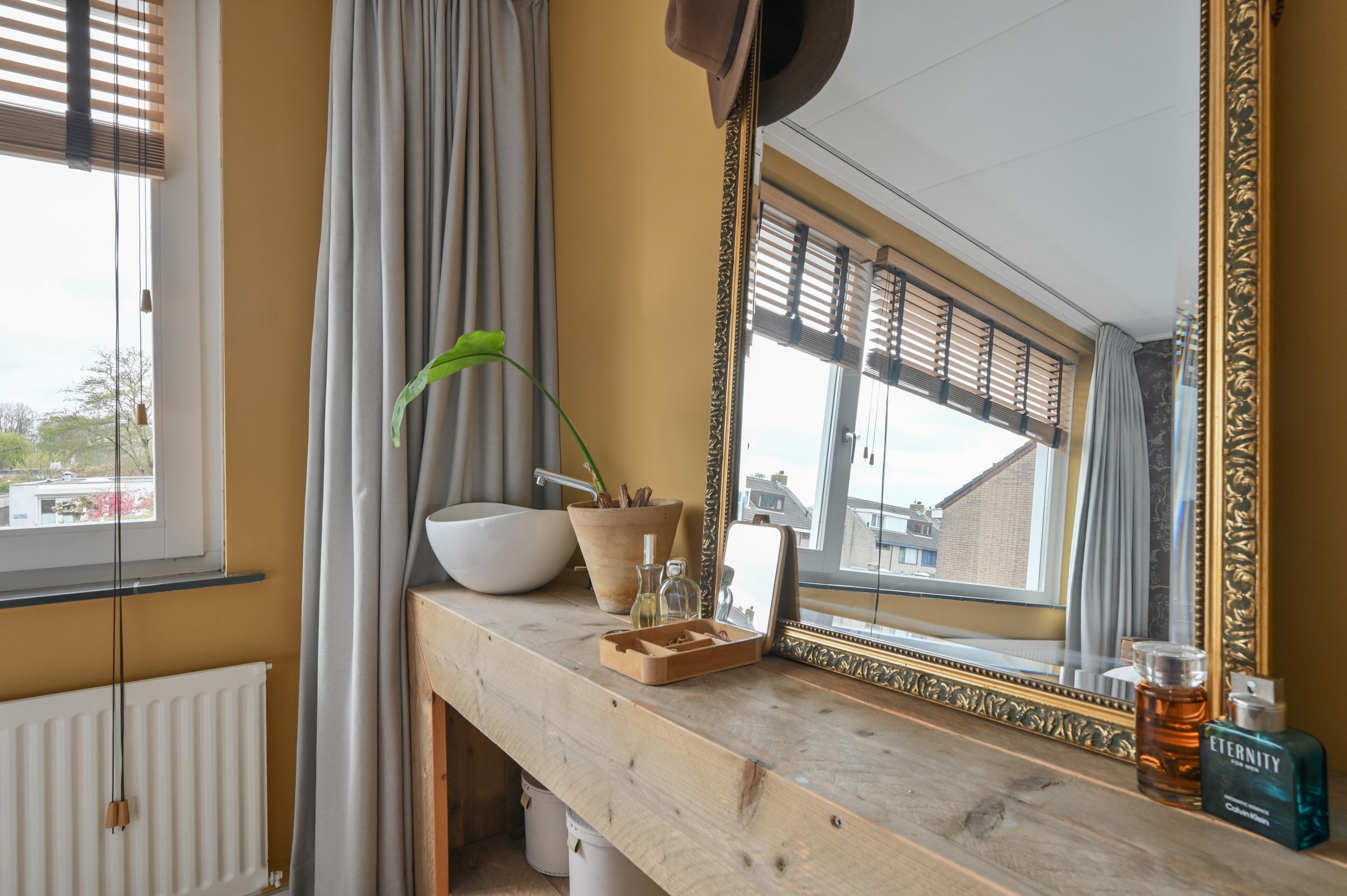 De slaapkamer op deze verdieping is speels ingedeeld. Een hoog raam zorgt voor een mooie lichtinval, terwijl de dakkapel extra ruimte en comfort toevoegt. De kamer beschikt daarnaast over een vaste spiegelkast en een inbouwschuifkast in het schuine gedeelte, waardoor de ruimte optimaal benut wordt. Ook is er een handige wastafel aanwezig en een vrij uitzicht richting de weilanden, wat ook hier weer dat gevoel van ruimte en vrijheid versterkt.