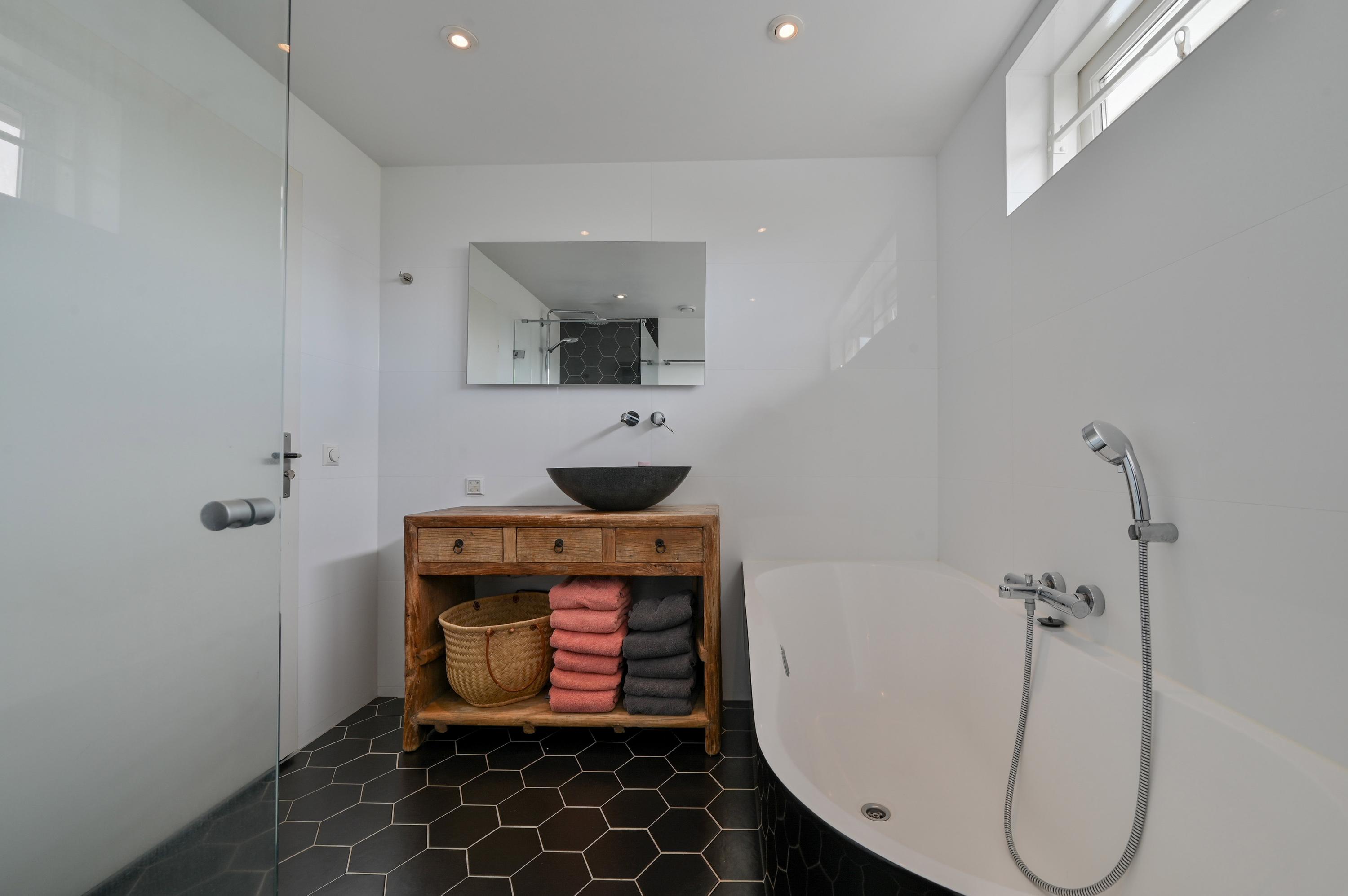 De badkamer is compleet en verzorgd uitgevoerd en is ruim van opzet. De vloer is voorzien van vloerverwarming, wat zorgt voor extra comfort en een aangename temperatuur. Hier vind je een ligbad, toilet, inloopdouche met glazen deur en zowel een stort- als handdouche. Het wastafelmeubel met spiegel met infraroodpaneel maakt de ruimte modern en praktisch in gebruik.
