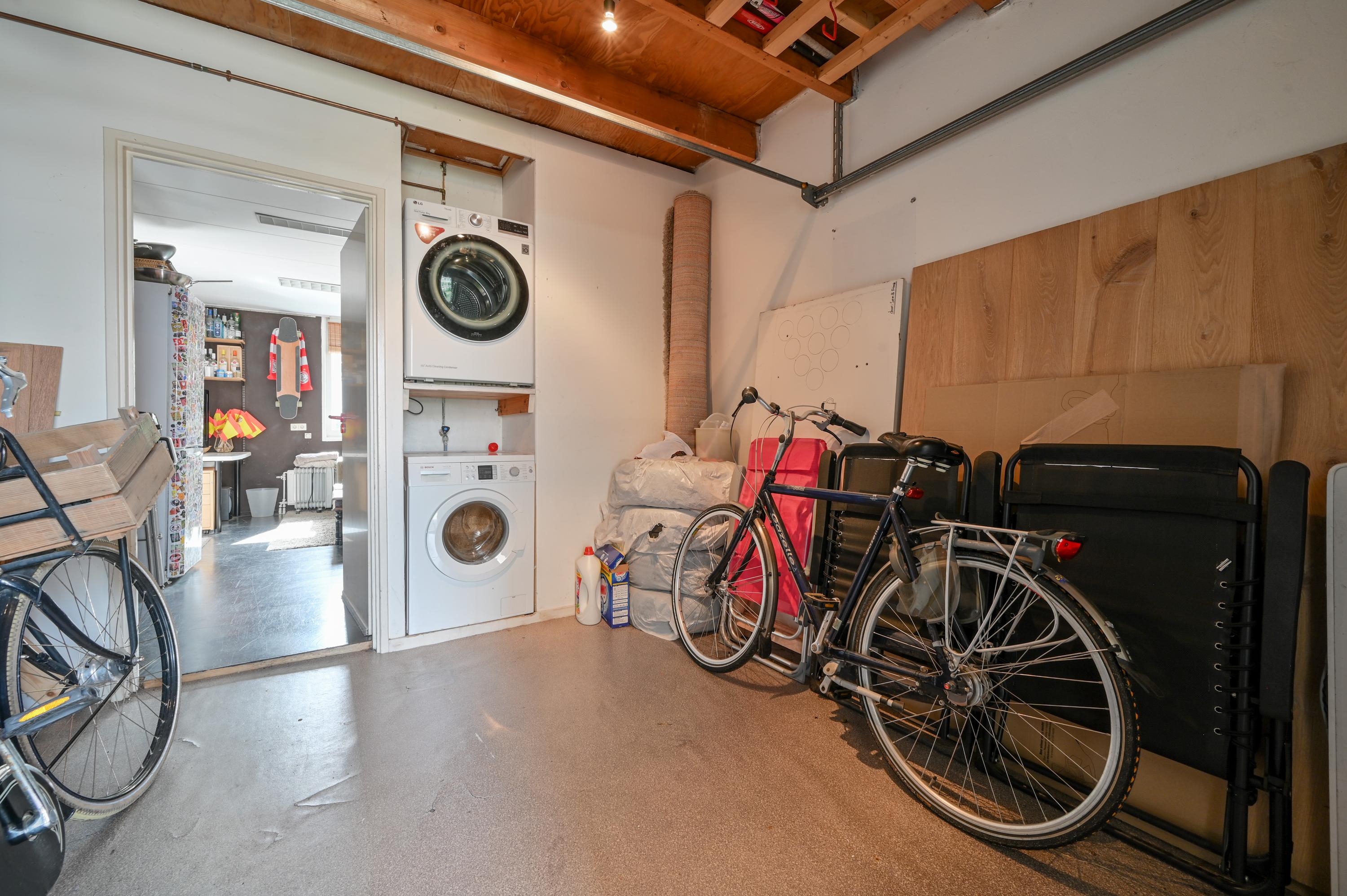 De voormalige garage is slim en verrassend functioneel ingedeeld in twee delen. Aan de voorzijde bevindt zich een praktische berging met wasmachineaansluiting en verwarming — ideaal als bijkeuken, wasruimte of extra opslag.
