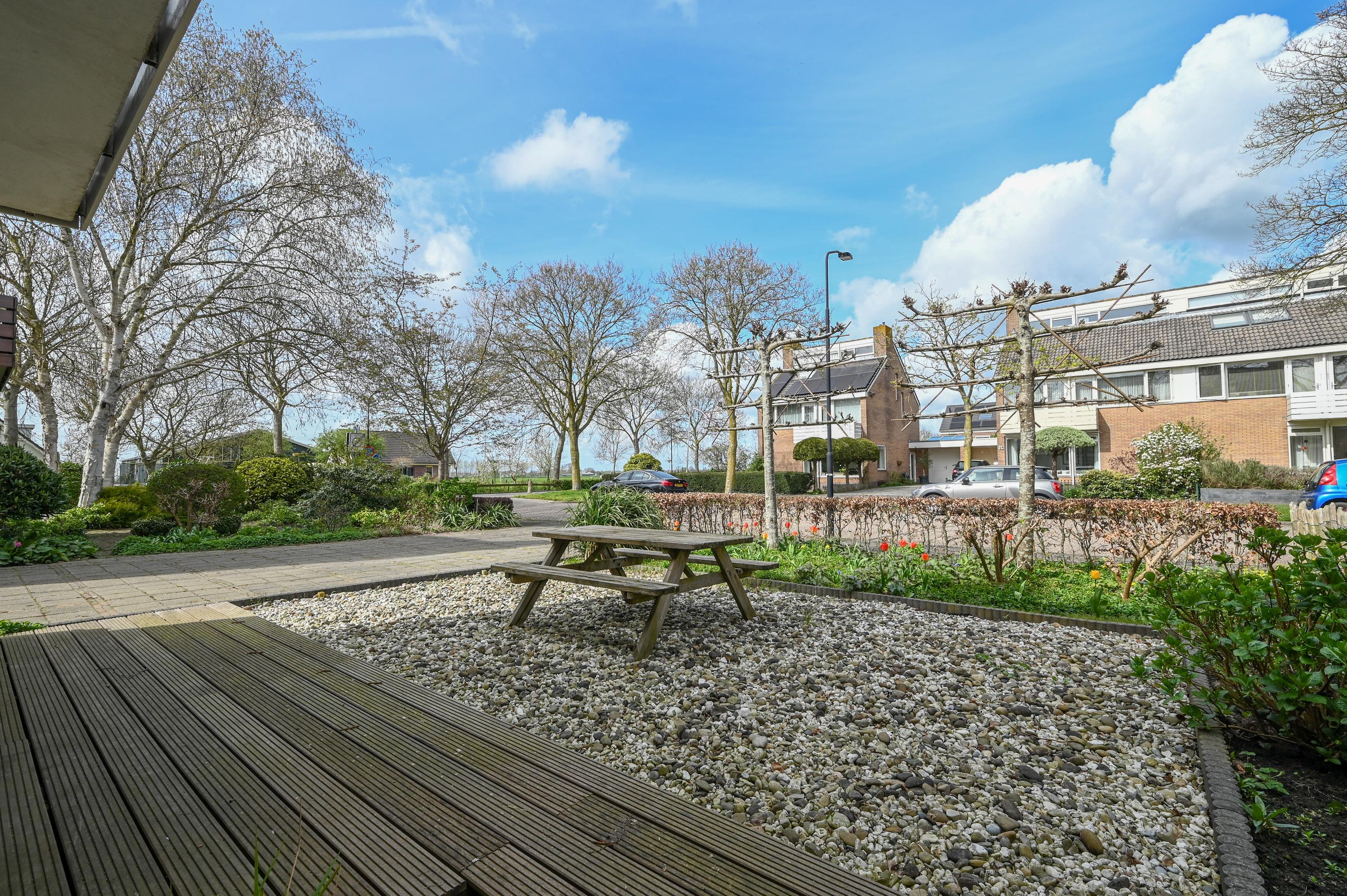 Ook aan de voorzijde van de woning kan een prettige zitplek gecreëerd worden, waardoor je op elk moment van de dag een fijne plek kunt kiezen om van de zon of juist de rust te genieten.