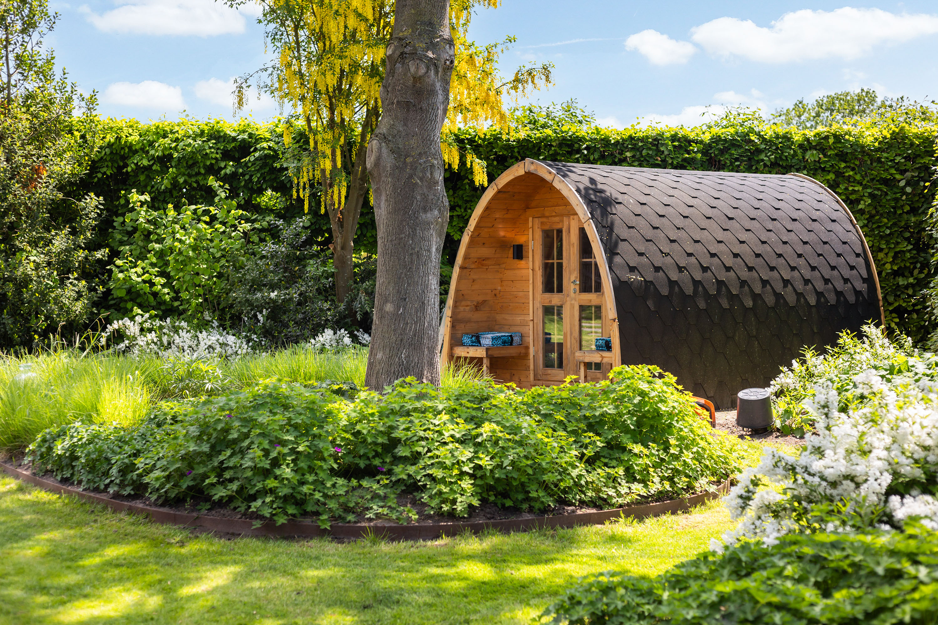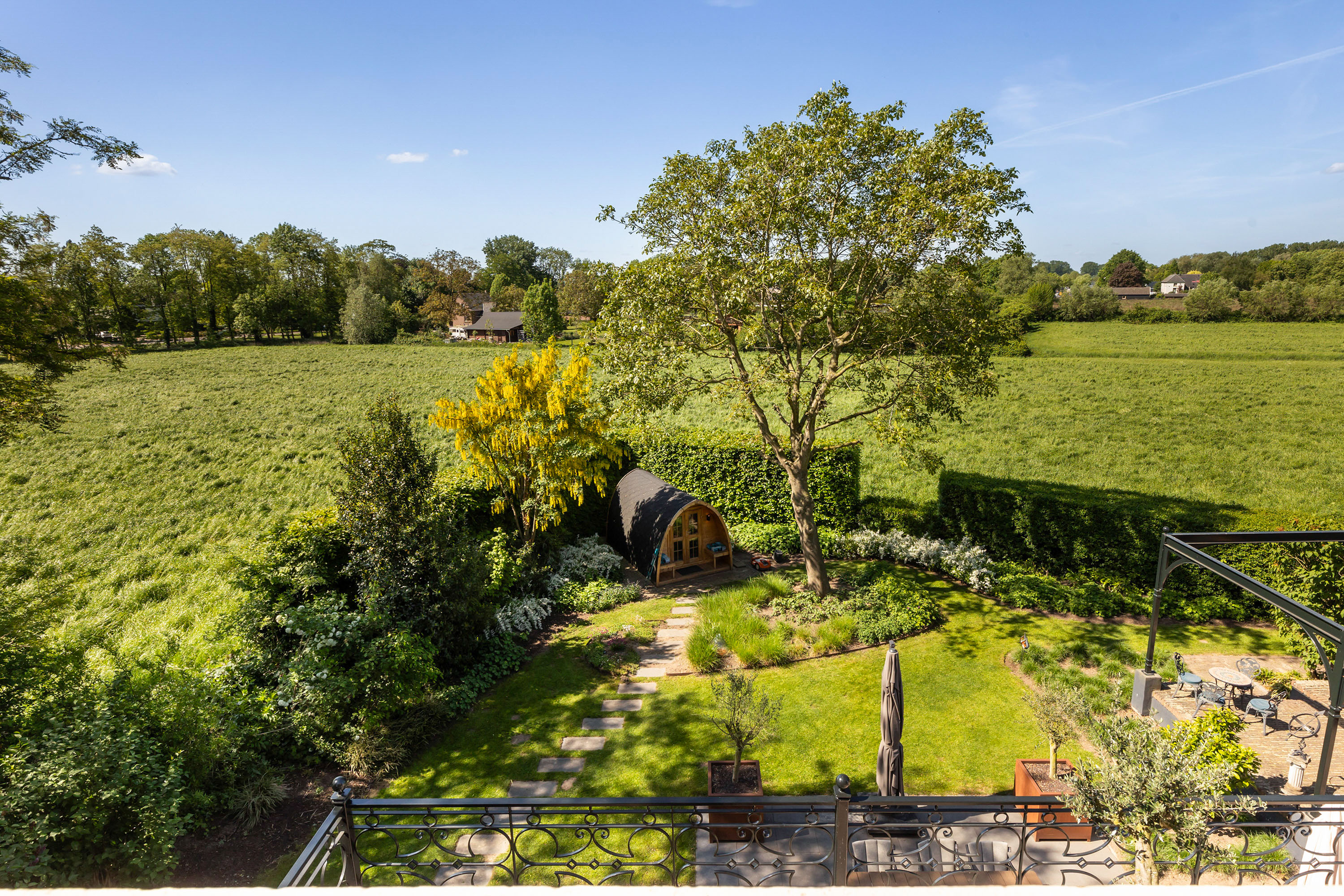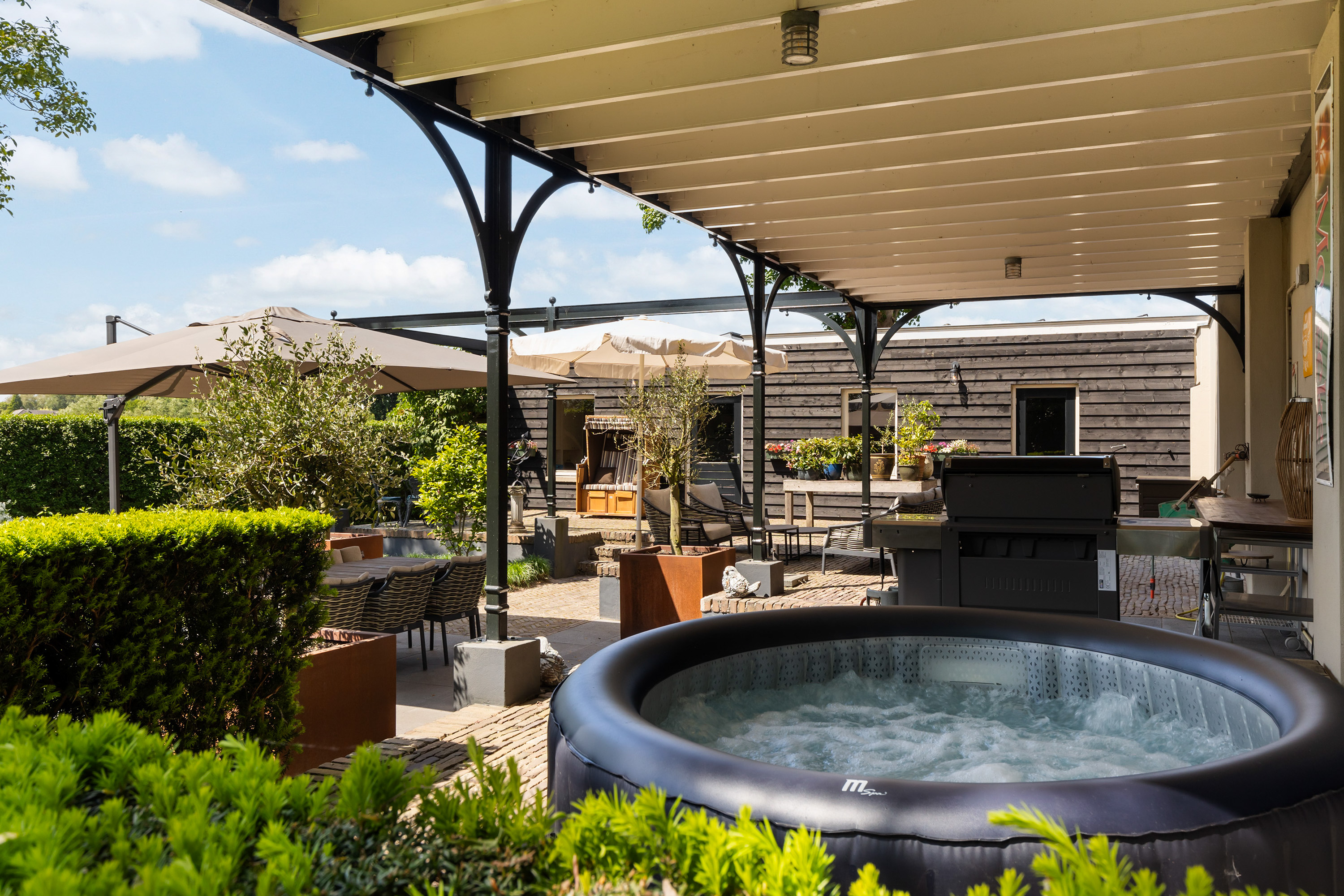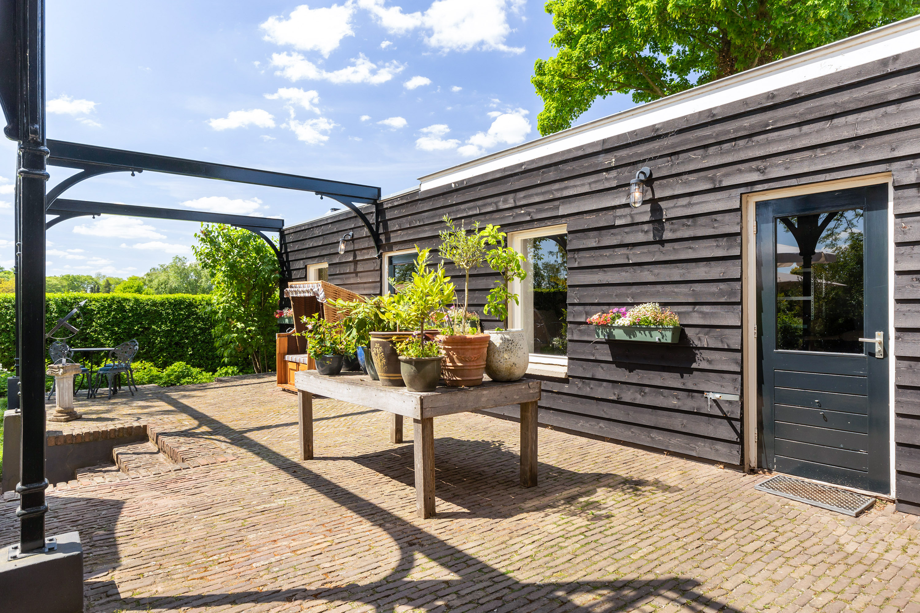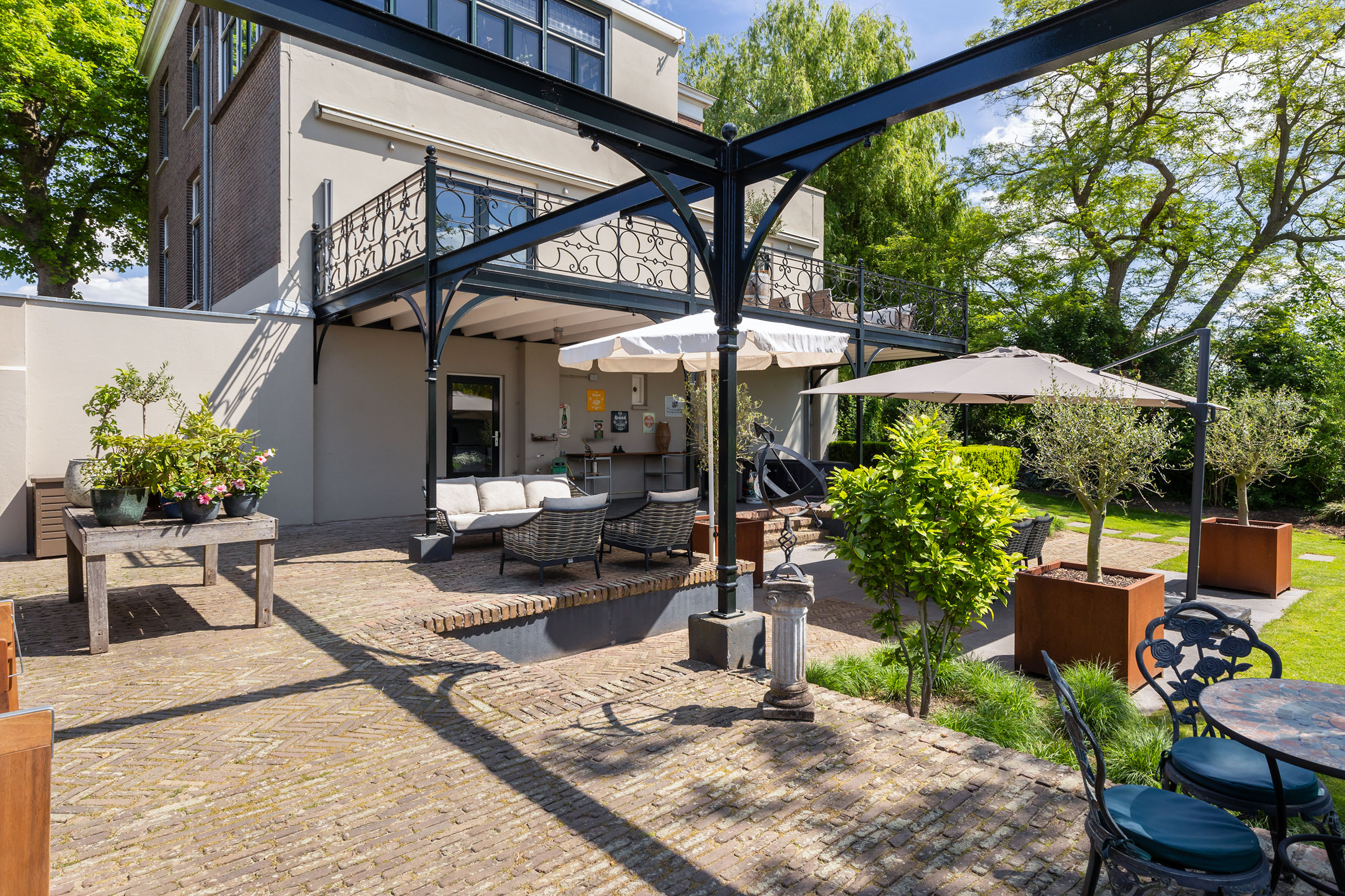 Het buitenterrein vormt een volwaardig verlengstuk van de woning. De tuin, opnieuw aangelegd in 2022, is ontworpen met oog voor rust en functionaliteit. Strakke lijnen worden afgewisseld met natuurlijke beplanting en meerdere terrassen bieden altijd een plek in zon of schaduw. De veranda met houten balkenplafond, voorbereid op buitenkeuken en wellness, maakt het buitenleven bijzonder aangenaam. Aan de zijkant van het perceel ligt een tweede tuin met gazon en een karakteristieke treurwilg, wat bijdraagt aan de groene beleving.