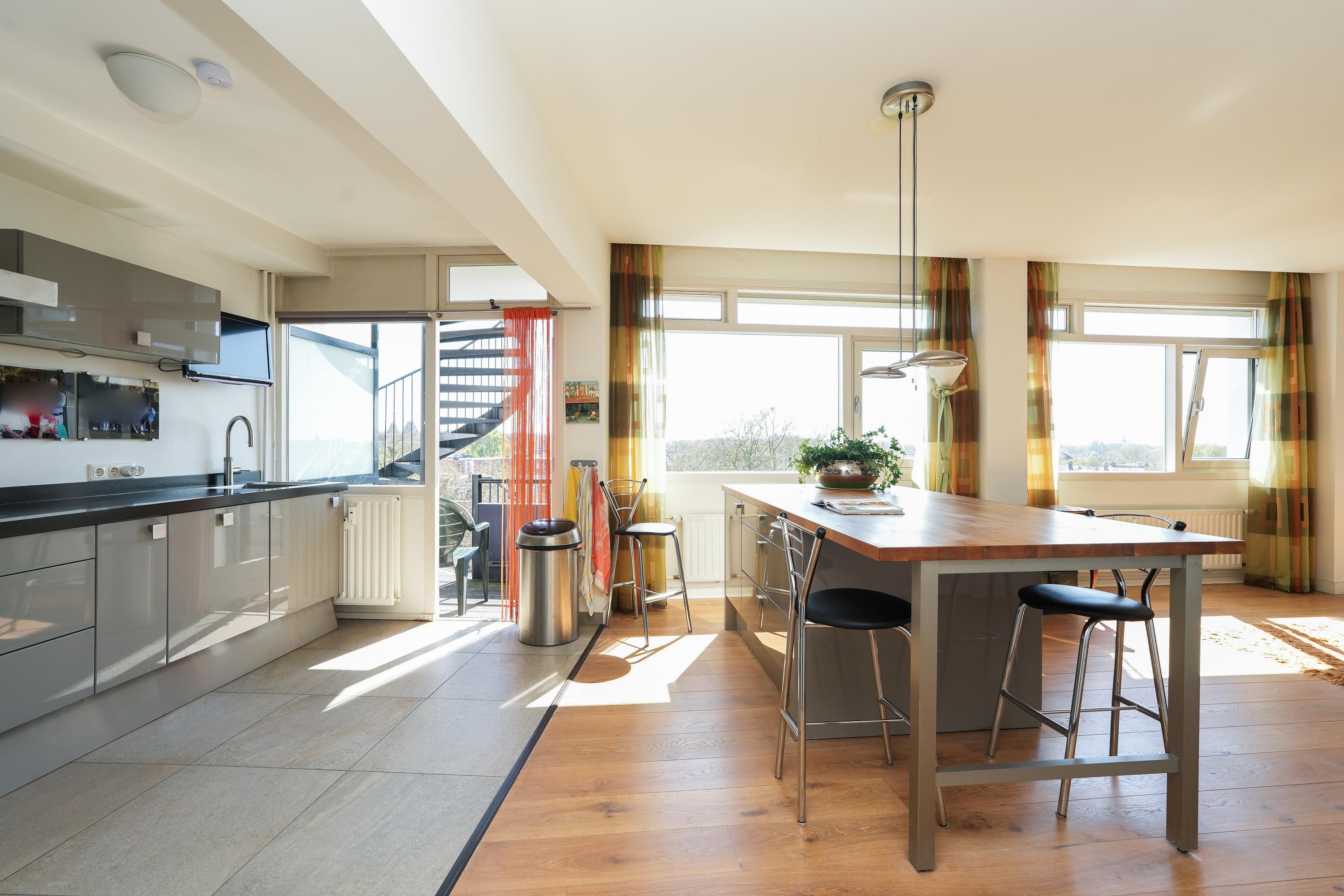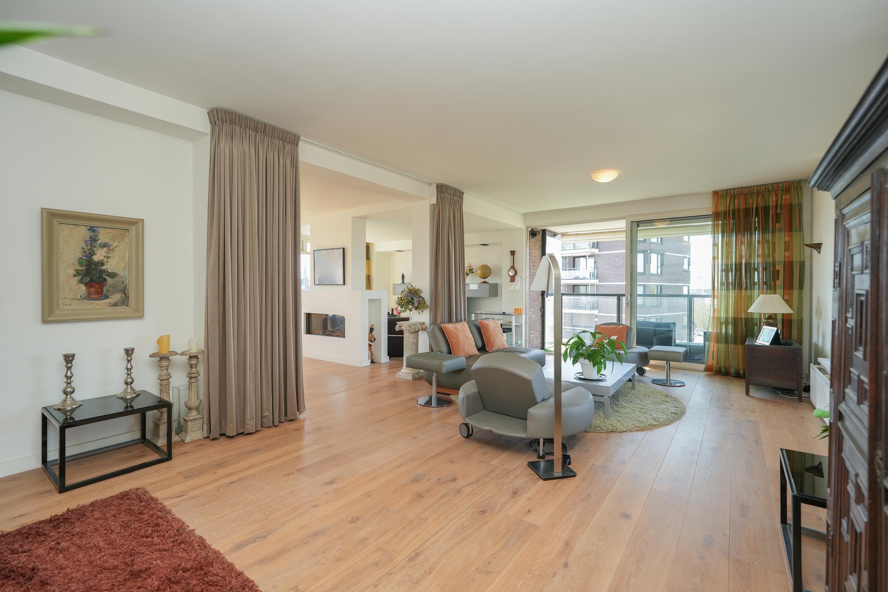 Entree appartement met een beveiligde toegangsdeur. Het appartement is zeer licht door rondom ramen. Het beschikt over een lange, brede hal die als centrale verbinding dient. Bij binnenkomst bevinden zich de garderobe, het gastentoilet, een wasruimte en de open keuken. De keuken en woonkamer zijn beide direct bereikbaar vanuit de hal, wat zorgt voor een loftachtige sfeer en mooie, logische doorloop. De keuken is voorzien van diverse inbouwapparatuur en biedt toegang tot het eerste balkon welke op het zuiden gericht is. Aangrenzend aan de keuken bevindt zich een inpandige bijkeuken met extra opberg- en werkruimte. Vanaf de woonkamer en het balkon is er een prachtig uitzicht over de stad Nijmegen en de Radboud Universiteit. Een gashaard zorgt voor een scheiding tussen de eetkamer en de televisiehoek aan de zuidwest kant. Het westelijk gelegen balkon biedt een fraai uitzicht richting de Waal en de iconische Waalbrug.