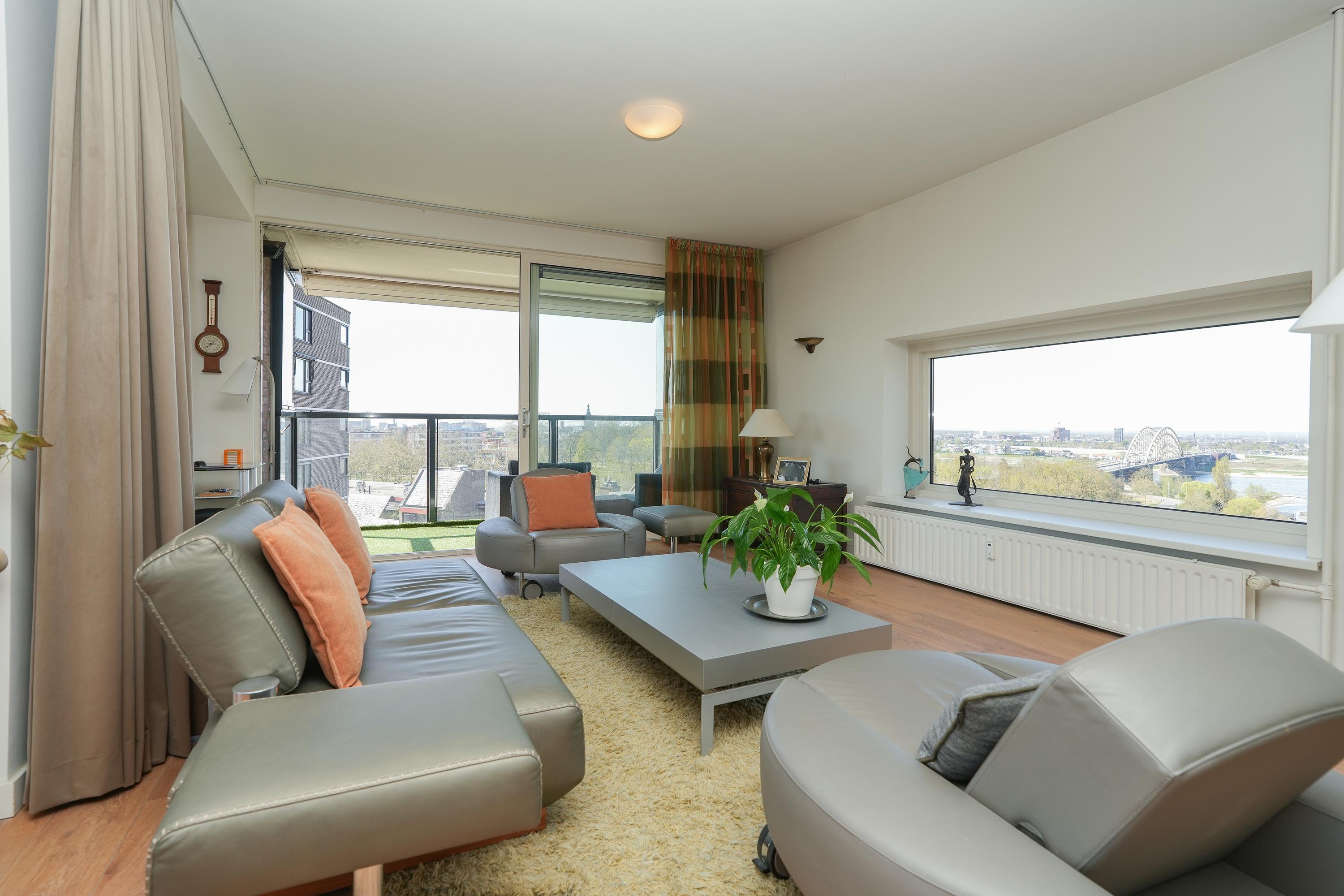 Met een weids uitzicht over de Waal, de Ooijpolder en de skyline van Nijmegen biedt dit uitzonderlijke appartement een woonbeleving die je zelden tegenkomt. Deze lichte woning bevindt zich op de zesde verdieping van een goed onderhouden complex met in totaal negen verdiepingen, aan de rand van het geliefde Nijmegen-Oost. De combinatie van ruimte, uitzicht en ligging zorgt voor een buitengewone ervaring. Het comfort van de centrale locatie maakt het geliefd.