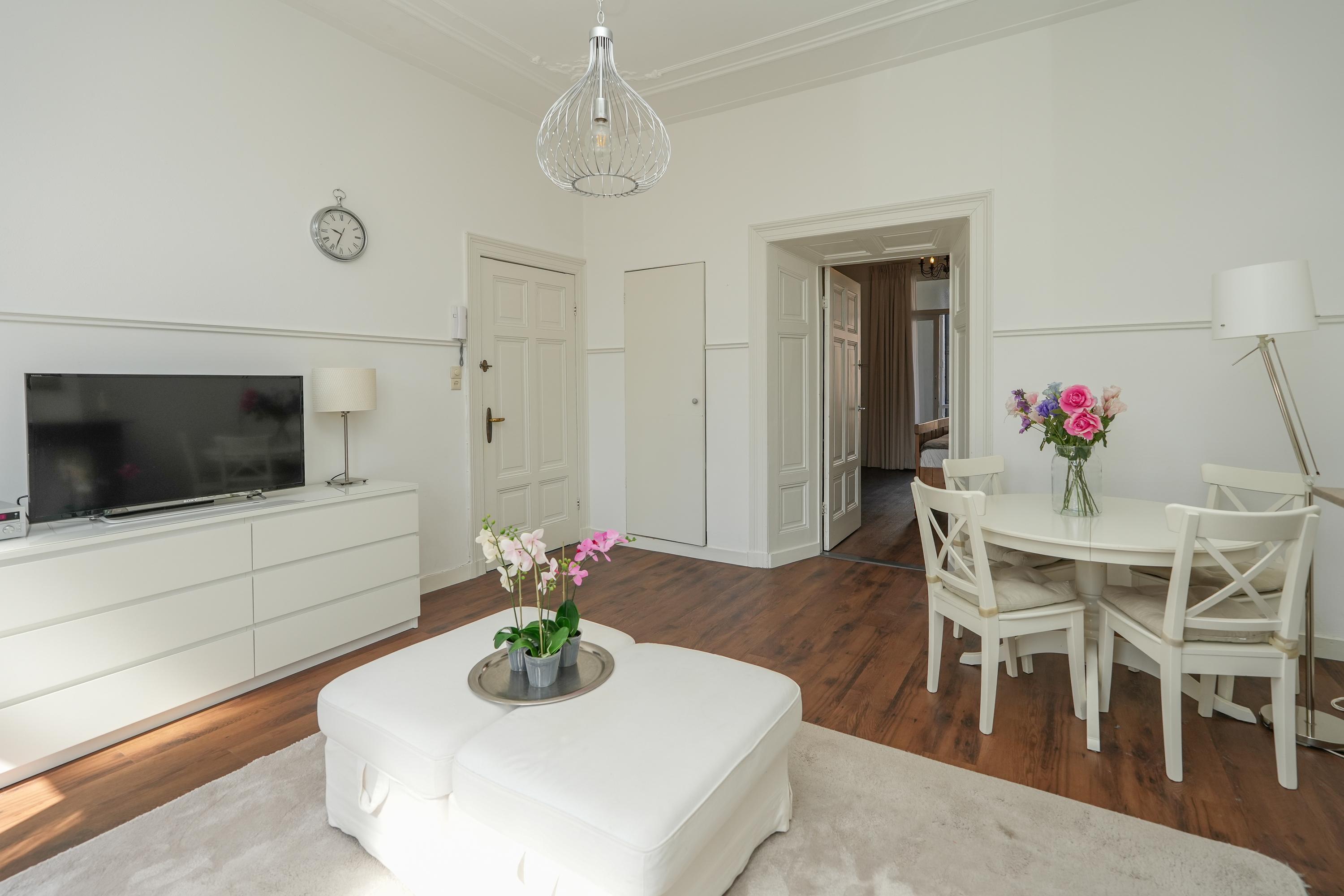 Overloop met twee zeer ruime kamers met hoge ornamentenplafonds. De kamer aan de voorzijde heeft toegang tot het balkon en de kamer aan de achterzijde heeft schuifdeuren naar een prachtige loggia. Tevens zijn er op deze verdieping een dichte keuken met apparatuur en een barretje, twee badkamers, een separaat toilet en een studio met hoogslaper en keukenblok gesitueerd.