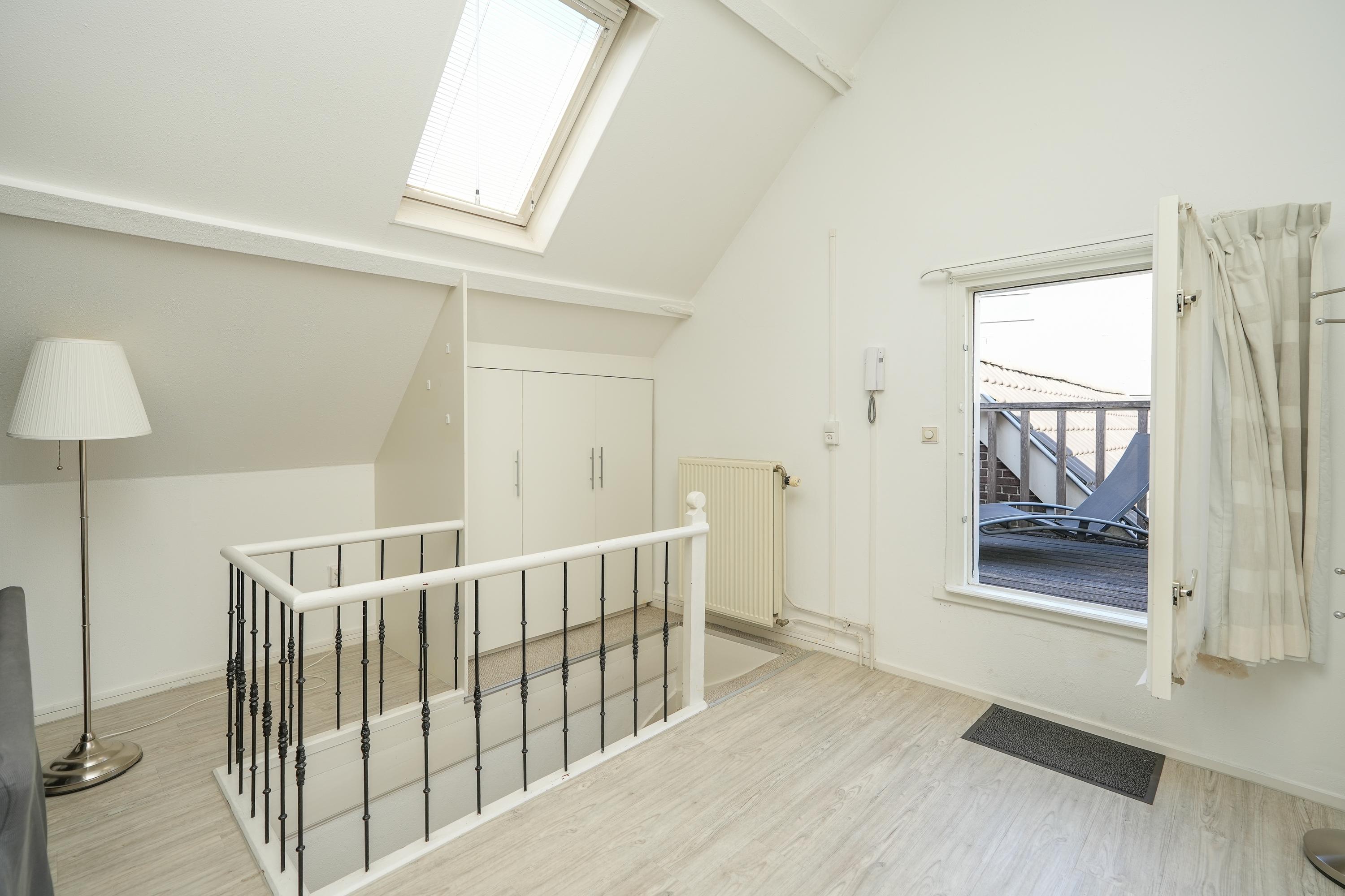 Middels een vaste trap is de bovenste verdieping bereikbaar, hier bevindt zich een ruime woonkamer met een bedstee. Tevens is er een moderne dichte keuken met witgoedaansluiting en er is een functionele badkamer met toilet en douche. Deze verdieping is sfeervol doordat de originele constructiebalken zichtbaar zijn gebleven en de ruimte is lekker licht door de dakramen. Bovendien is er veel bergruimte in vaste kasten.