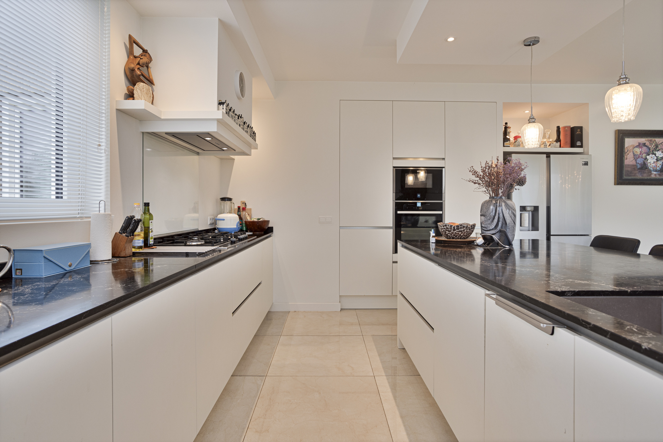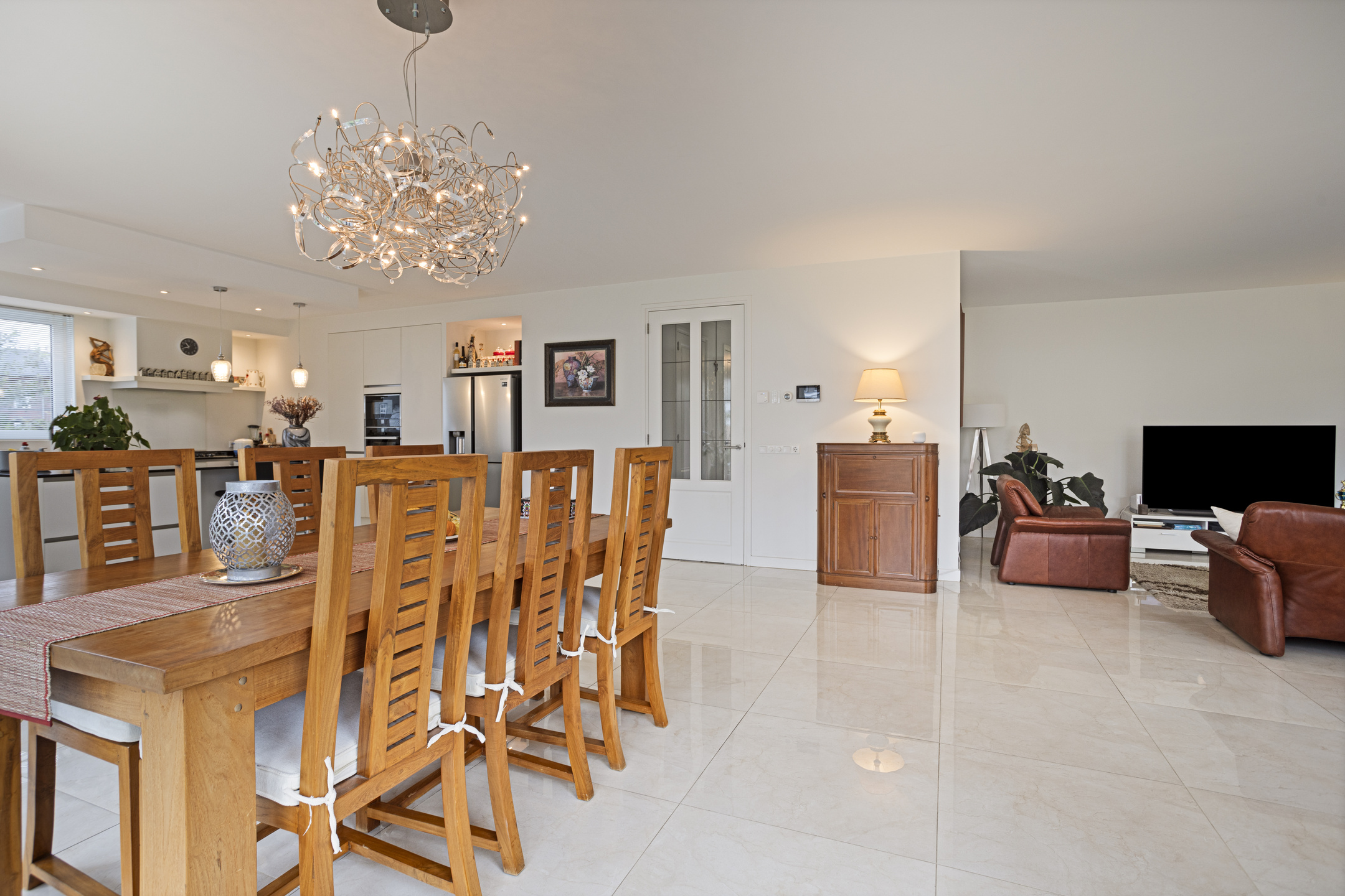 Riante en lichte entree met toilet en opbergkast. Aan de linkerzijde bevindt zich een mooie werk- of speelkamer. Aan de rechterzijde geeft de deur toegang tot de dubbele inpandige garage. Het woongedeelte meet (samen met de keuken) ruim 65 m2 en bestaat uit een ruime en lichte woonkamer met schouw, een eetruimte in het middengedeelte met openslaande deuren naar de tuin en een moderne en luxe open keuken met ‘eiland’ welke uiteraard is voorzien van alle moderne apparatuur.