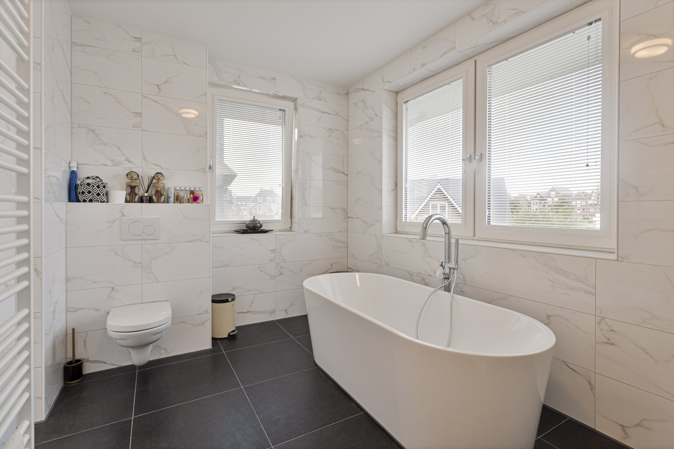 Ruime overloop met aparte wasruimte en technische ruimte. Verder treft u op deze woonlaag 4 zeer royale slaapkamers aan. De ouderslaapkamer beschikt over een zeer ruime inloopkledingkast met op maat gemaakte kasten en daarachter een luxe badkamer en suite voorzien van bad, douche, dubbele wastafel en toilet. Eén van de andere slaapkamers beschikt ook over een badkamer en suite (met douche, wastafel en toilet). De andere twee slaapkamers delen een prachtige ruime (3e!) badkamer met douche, dubbele wastafel en toilet. Een luik op de overloop geeft toegang tot een zeer ruimte bergzolder.