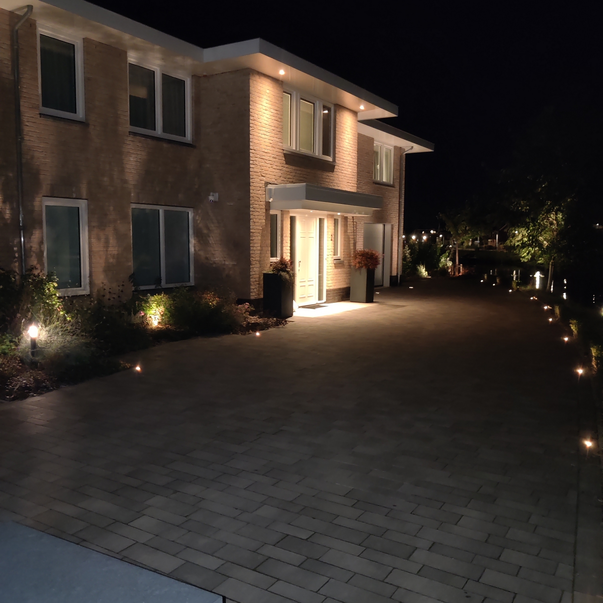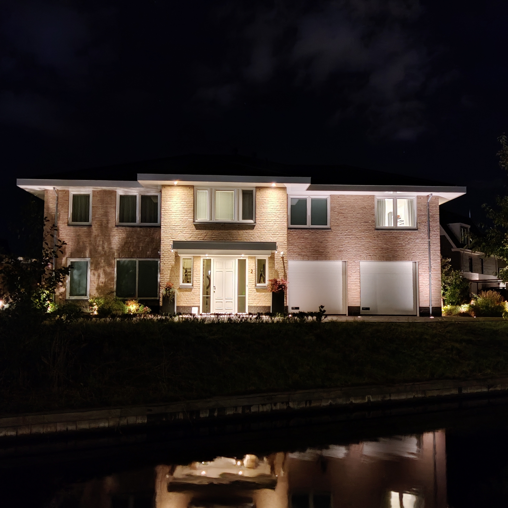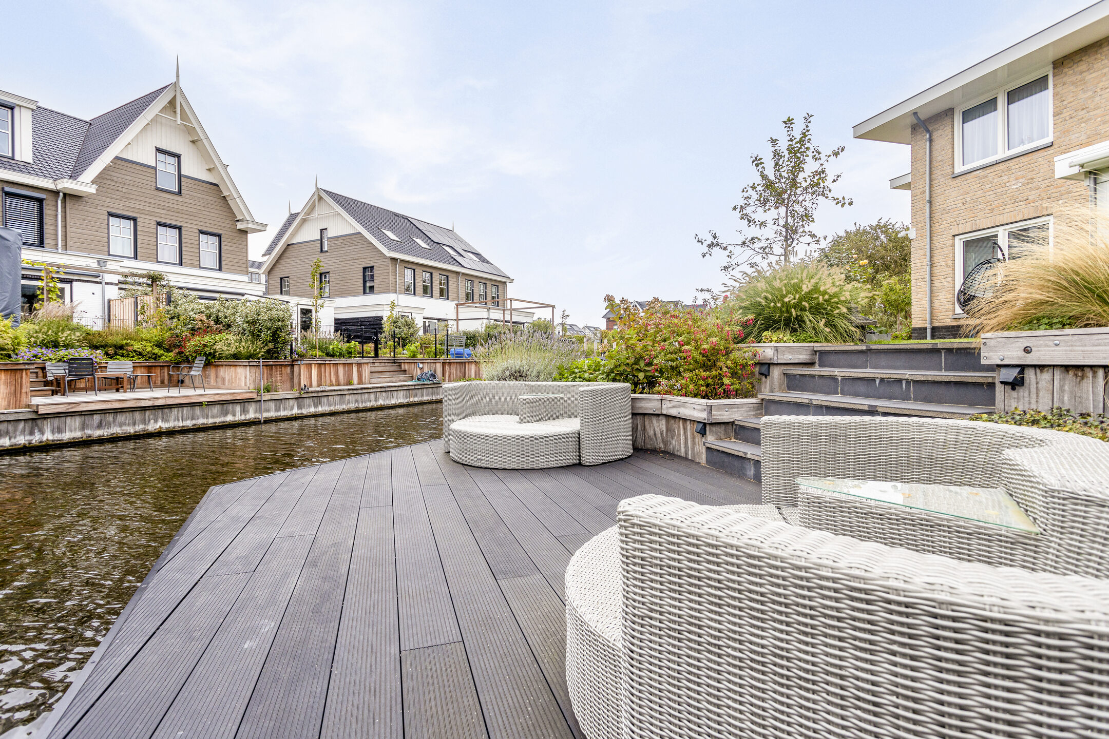 Aan de buitenzijde van de woning valt op dat deze beschikt over een zeer ruime oprit met elektrisch bedienbaar toegangshek. Aan het einde van de oprit bevindt zich een dubbele inpandige garage. Naast de woning staat de houten berging, die ook handig is voor de dagelijkse fietsen. De achtertuin is fraai aangelegd en heeft een riant terras direct aan de woning én een groot ‘deck’ aan het water. Aan de lange zijde van de tuin bevinden zich meerdere afmeerplekken voor boten, waarvan één afmeerplek is voorzien van een bootlift.