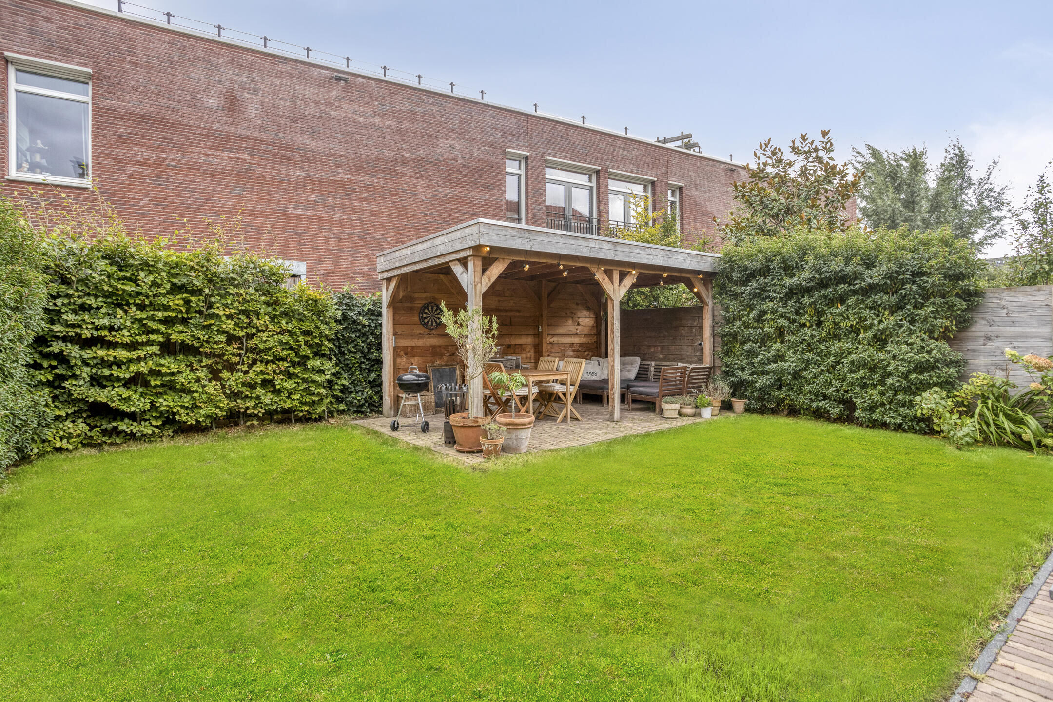 De zonnige achtertuin beschikt over een gezellig tuinhuis, ideaal voor lange zomeravonden.