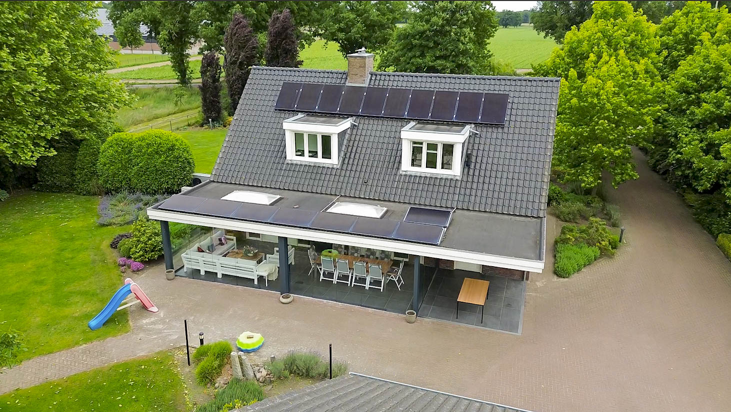 - Op het dak van het woonhuis en garage zijn 41 zonnepanelen gesitueerd. Het dak van de stal is voorzien van 64