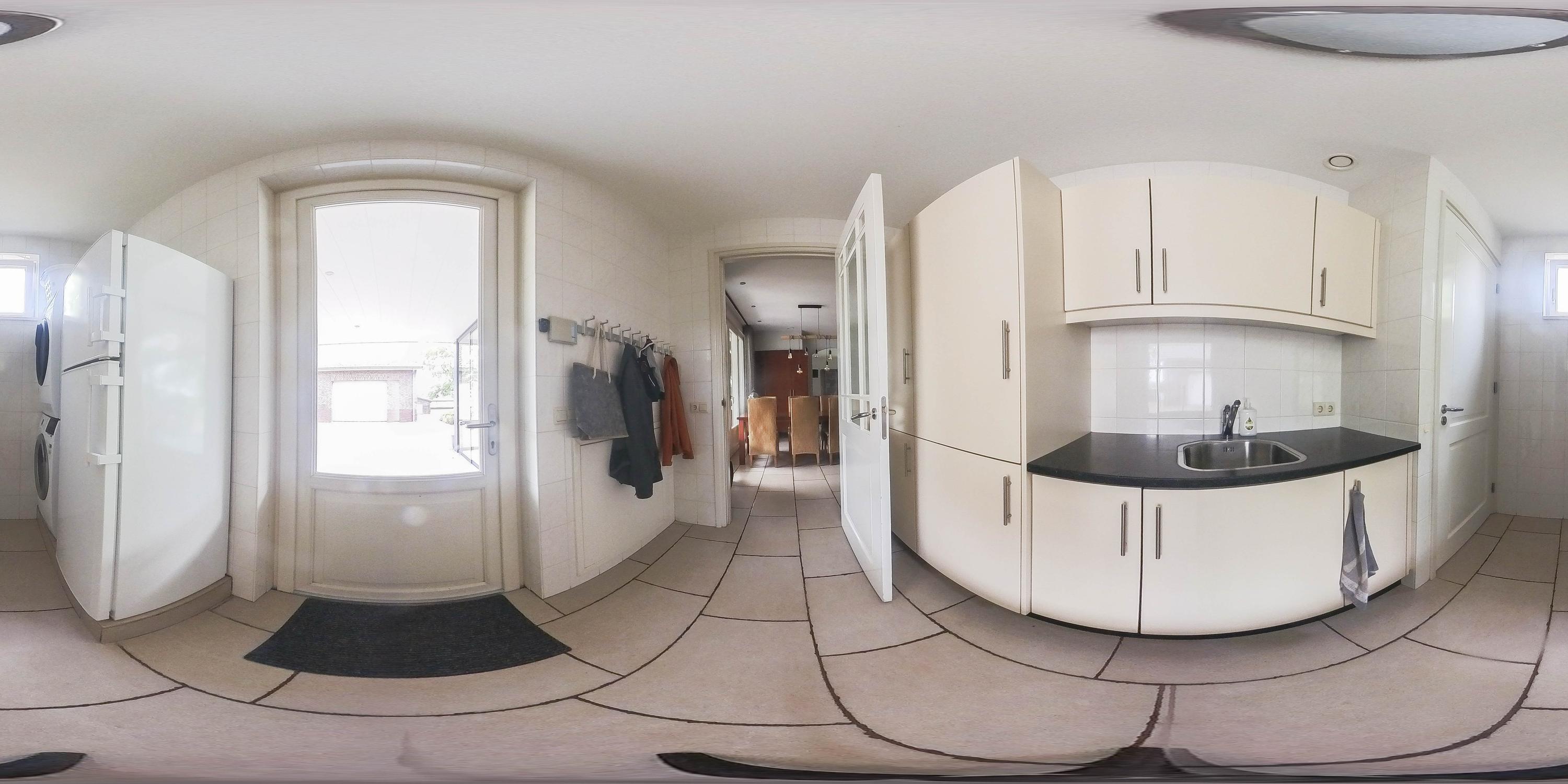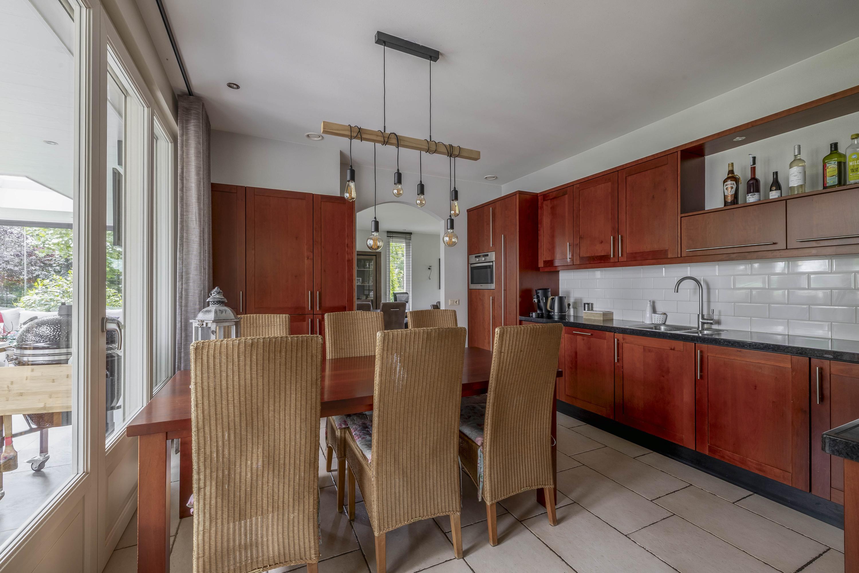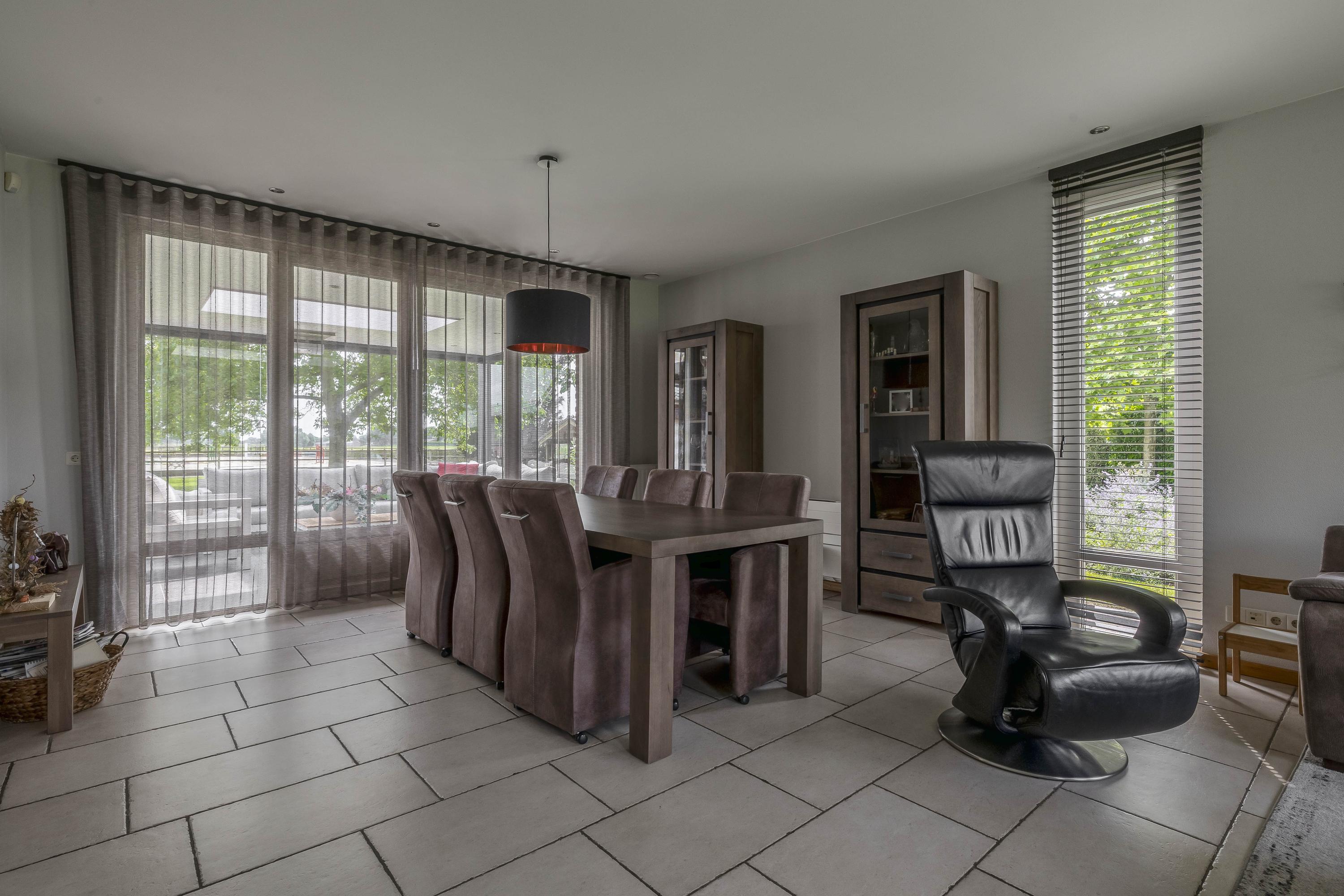 De woonkamer is afgewerkt met een tegelvloer, strakke stucwerk wanden en een stucwerk plafond met inbouwverlichting. Grote raampartijen tot aan de grond zorgen voor veel lichtinval en een ruimtelijk gevoel. De aanwezige gashaard voegt extra warmte en sfeer toe aan de ruimte. Daarnaast bieden openslaande deuren directe toegang tot het overdekte terras, waardoor binnen en buiten in elkaar overlopen. Vanuit de woonkamer is er toegang tot de keuken. De keuken is eveneens voorzien van een tegelvloer, stucwerk wanden en een stucwerk plafond. De keukeninrichting is in een hoekinrichting geplaatst en verder uitgerust met diverse inbouwapparatuur zoals een combimagnetron, vaatwasser, een spoelbak, inductiekookplaat en een koelkast. Diverse kasten zorgen voor voldoende opbergruimte. In de kast is een stortkoker voor de was gesitueerd. Ook hier zorgen openslaande deuren voor toegang tot het overdekte terras. De praktische bijkeuken is voorzien van een tegelvloer en een stucwerk plafond. De ruimte is geheel betegeld. De bijkeuken is uitgerust meteen keukenblok met kasten en een spoelbak. De aansluitingen voor de wasapparatuur zijn hier gesitueerd. De toiletruimte is eveneens geheel betegeld en verder voorzien van een zwevend toilet en een fonteintje. De woning beschikt over een slaapkamer met badkamer en-suite op de begane grond, hierdoor is de woning levensloopbestendig. De slaapkamer is afgewerkt met een laminaatvloer, spachtelputz wanden en een stucwerk plafond. Twee praktische inbouwkasten zorgen voor opbergruimte. Raampartijen zorgen voor natuurlijke lichtinval en ventilatie. De ruime badkamer en-suite is geheel betegeld en verder uitgerust met een ligbad, douche, wastafel met wastafelmeubel en een zwevend toilet.