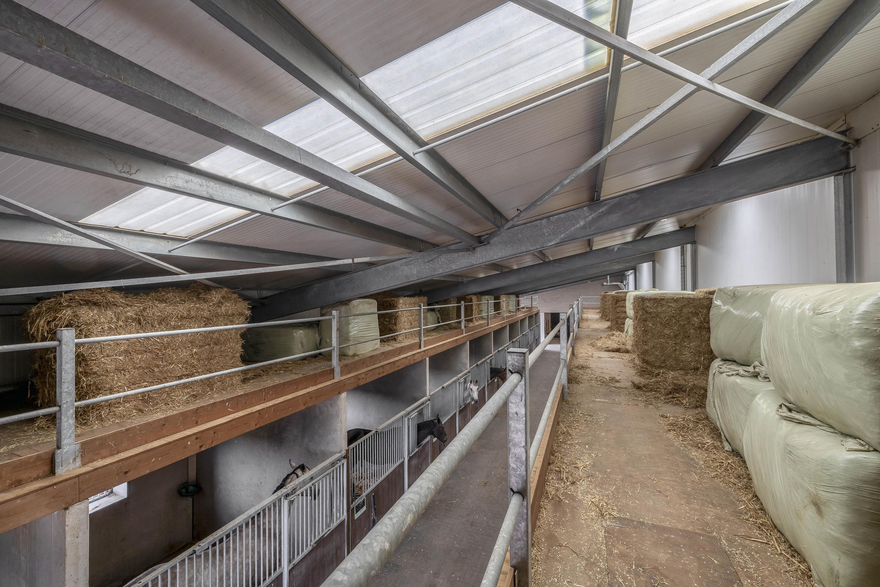 Middels een loopdeur is er toegang tot de stal. Een roldeur zorgt dan weer voor toegang tot de binnenpiste. Er zijn praktische magazijnopstellingen opstellingen gesitueerd. Er is krachtstroom aanwezig en een hogedrukleiding voor het reinigen van de stallen. Een elektrische roldeur en een loopdeur zorgen voor toegang tot het erf. Openslaande deuren zorgen voor toegang tot de rijhal. Daarnaast zijn 10 boxen uitgerust met praktische buitenluiken. Een groot voordeel is de hooizolder met handige hooiluiken, strategisch boven de stallen geplaatst, waardoor hooi en stro eenvoudig direct in de boxen kunnen worden gegooid. Verder draagt de aanwezige sleepketting voor de mest bij aan extra gemak en efficiëntie in het onderhoud van de stallen. Naast de stallen is een douche- en toiletruimte voor heren en dames gesitueerd. Ook zijn er 3 wasplaatsen aanwezig, welke zijn voorzien van een warm- en koud watervoorziening. Via een separate ingang, gelegen naast de zadelkamer is het appartement bereikbaar. Het appartement is afgewerkt met een vinylvloer, deels metselwerk / deels stucwerk wanden en een systeemplafond. Er bergruimte onder de dakschuinte gecreëerd. De woonkamer van het appartement is uitgerust met een keukenblok. Vanuit deze ruimte is er zicht op de binnenpiste. De slaapkamer is voorzien van een praktische inbouwkast. De badkamer is ingericht met een douche, wastafel en een toilet en is geheel betegeld.