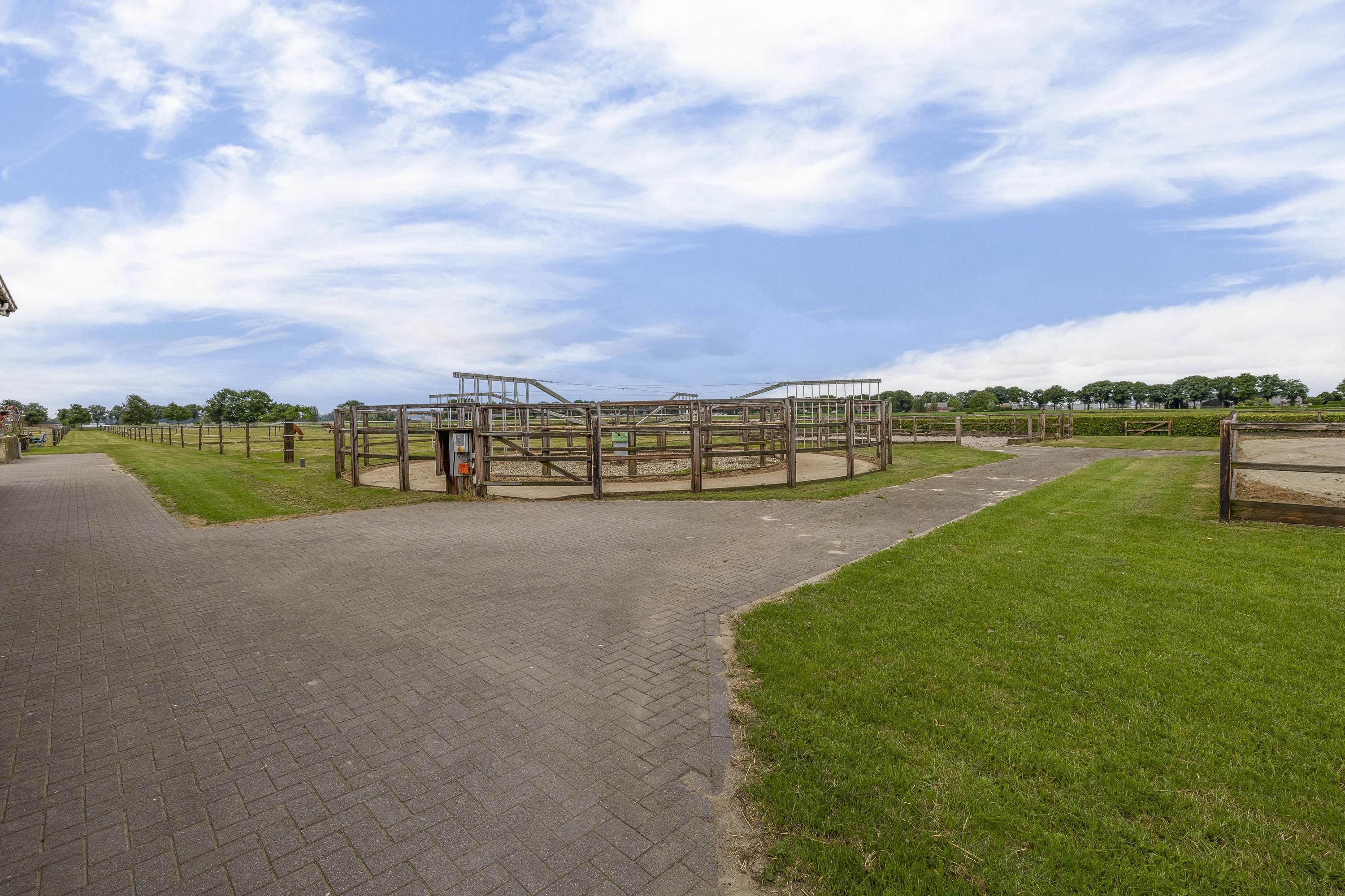 Het erf is verder ingericht met een buitenpiste, een praktische stapmolen en een longeercirkel. Daarnaast zijn er 6 buitenstallen, een mestvaalt en een opslagruimte voor stro aanwezig. Het geheel wordt verder aangevuld met een royaal weiland verdeeld in verschillende paddocks. Deze uitgebreide faciliteiten zorgen ervoor dat het geheel volop mogelijkheden biedt voor de (semi)professionele paardenliefhebber! De buitenpiste heeft een afmeting van ca. 50mtr. x 25mtr. is uitgerust met een eb/vloedbodem en voorzien van een houten omheining. De longeercirkel is omheind met hout en verder voorzien van een eb/vloed bodem. De stapmolen is geschikt voor 4 paarden en is uitgerust met een betonnen vloer en een houten omheining. Op het terrein zijn 6 buitenstallen gesitueerd. Deze stallen zijn voorzien van deels kunststof/ deels gegalvaniseerde voorwanden met een schuifdeur. Het dak is bedekt met damwand. De mestvaalt is verdiept gelegen, uitgerust met een betonnen vloer en wanden. Toevoer geschiedt via de mestketting. Toegang via de helling. Het weiland is verdeeld in paddocks, welke zijn omheind met houten palen en lint. Er is een middenpad aanwezig zodat je gemakkelijk de verschillende paddocks kunt bereiken.