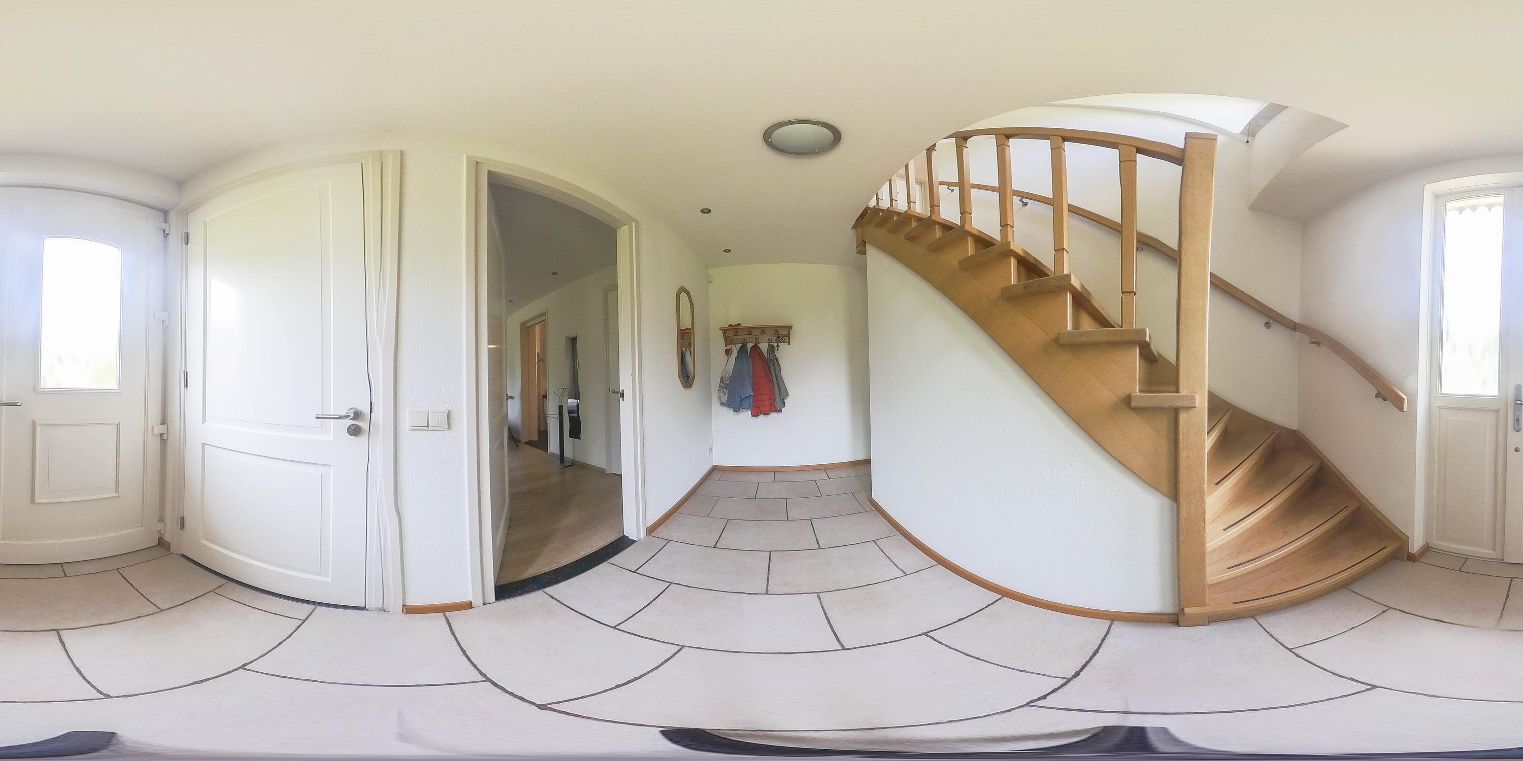 De entreehal is voorzien van een tegelvloer, spachtelputz wanden en een stucwerk plafond en biedt toegang tot de woonkamer, slaapkamer en de meterkast. Een vaste trap zorgt voor toegang tot de 1e verdieping.
