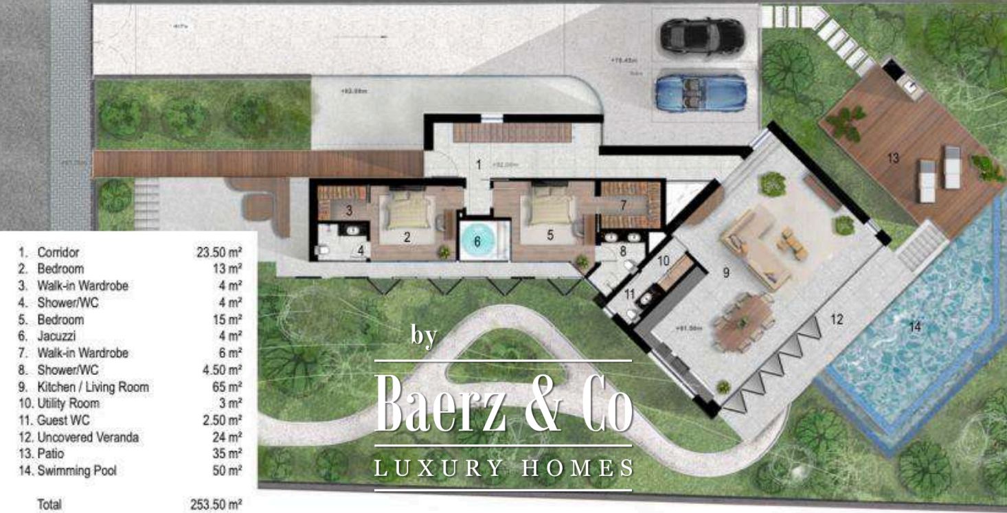 De villa beschikt over vier slaapkamers en vier badkamers, aangevuld met vijf extra toiletten, waardoor er volop ruimte en privacy is. De leefruimtes omvatten een royale lounge, twee keukens, een kantoor, een speelkamer en een fitnessruimte, aangevuld door praktische service- en bergruimtes. Slimme woningtechniek en driefasige stroom, samen met beveiligingsinstallaties zoals CCTV, een alarmsysteem en een veiligheidsslot, zorgen voor gemak en veiligheid.