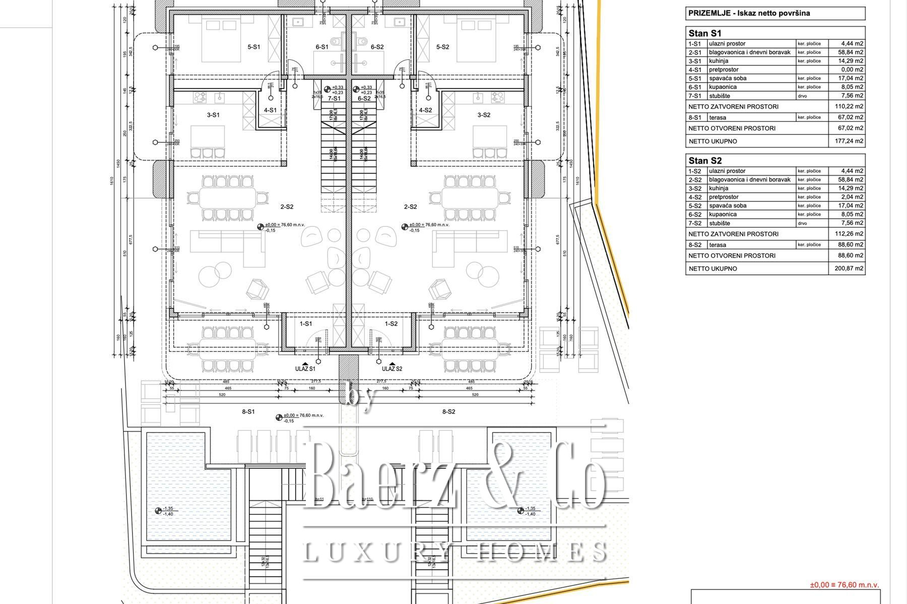 Op de begane grond vormt een stijlvolle open woonkamer en eetruimte een geheel met de modern uitgeruste keuken, die naadloos aansluit op een riante terras met privézwembad en een aparte zonneplek. Op de eerste verdieping bevinden zich drie slaapkamers met eigen badkamer, elk met toegang tot een balkon en onbelemmerd uitzicht op de Adriatische Zee. De vierde slaapkamer is op de begane grond gesitueerd voor optimaal comfort en toegankelijkheid.