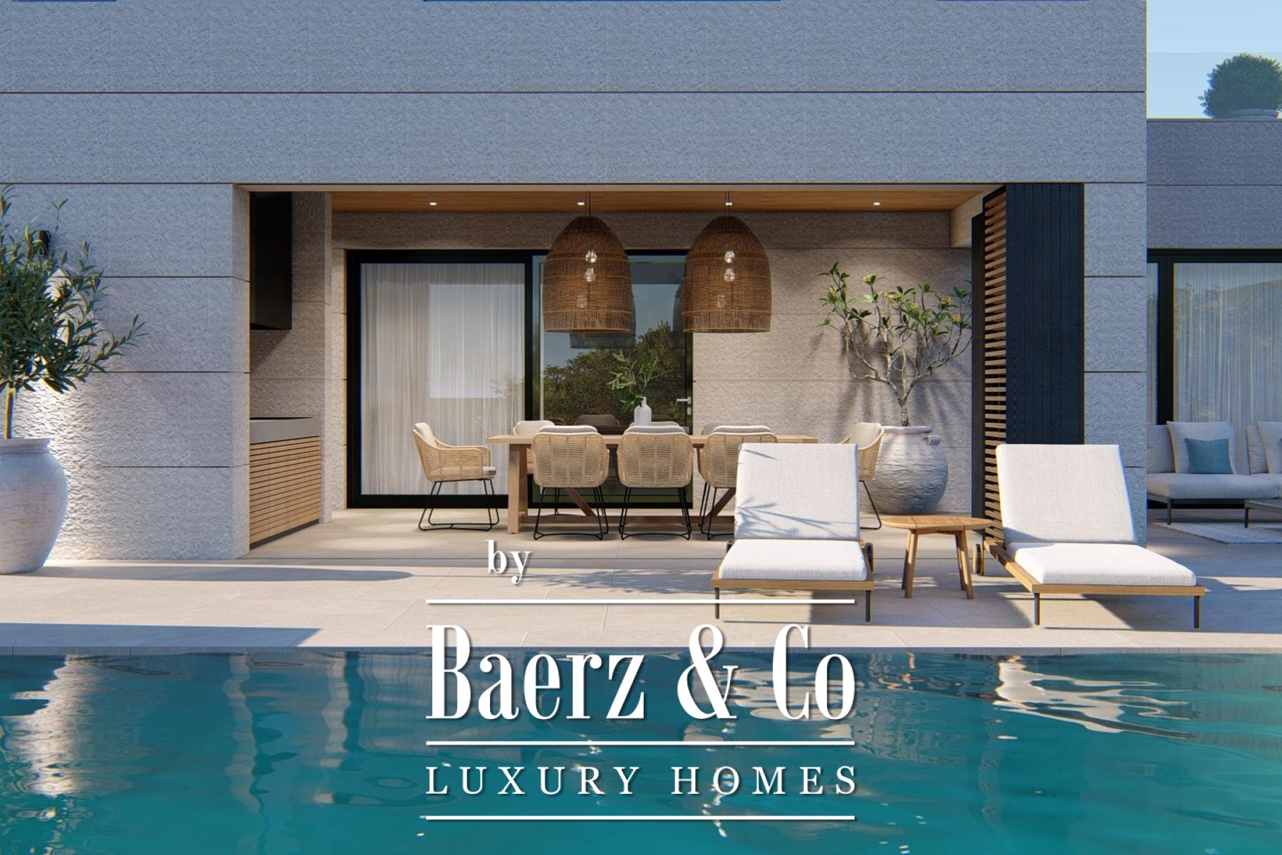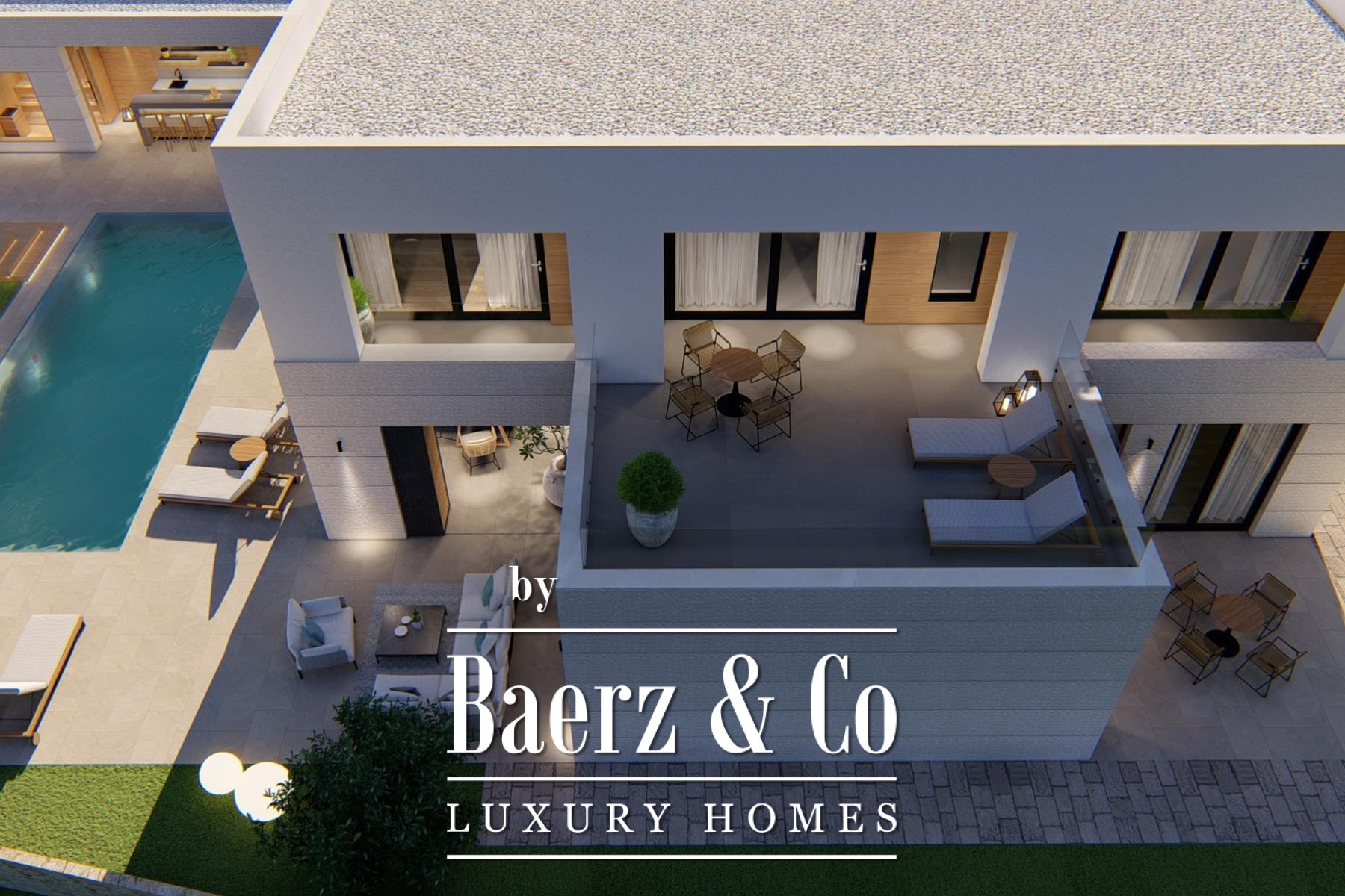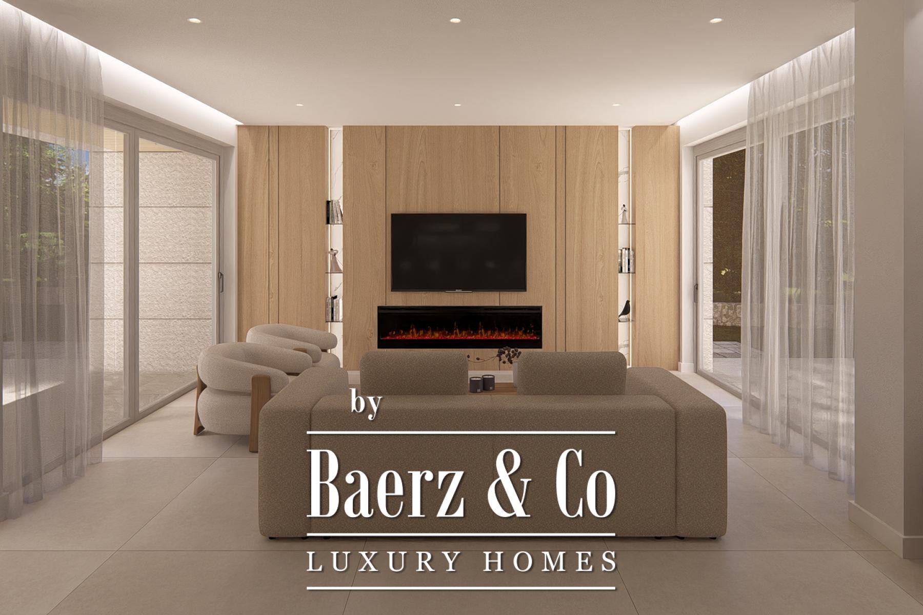De hoofdverdieping verwelkomt u met een open woonkamer, keuken en eetruimte, aansluitend op een overdekt terras met barbecue. Grote glazen schuifdeuren omlijsten het uitzicht op zee en laten veel daglicht binnen. De begane grond beschikt over een slaapkamer met eigen badkamer; de eerste verdieping telt drie extra slaapkamers, elk met en-suite badkamers en toegang tot de loggia. De bovenste verdieping opent naar een royaal terras, waardoor binnen en buiten naadloos in elkaar overlopen.