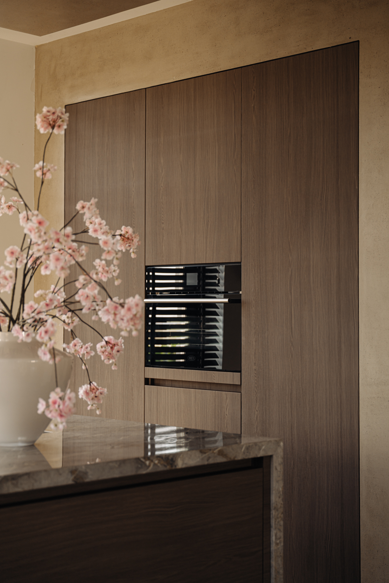 De living, gezellige woonkeuken met kookeiland/ eetkamer en de zithoek met open haard, vormen de plattegrond van deze verdieping in het hoofdgebouw. De woonkeuken is gemaakt van rijke materialen en voorzien van Boretti pitt cooking, Gaggenau wijnklimaatkast en overige inbouwapparatuur.