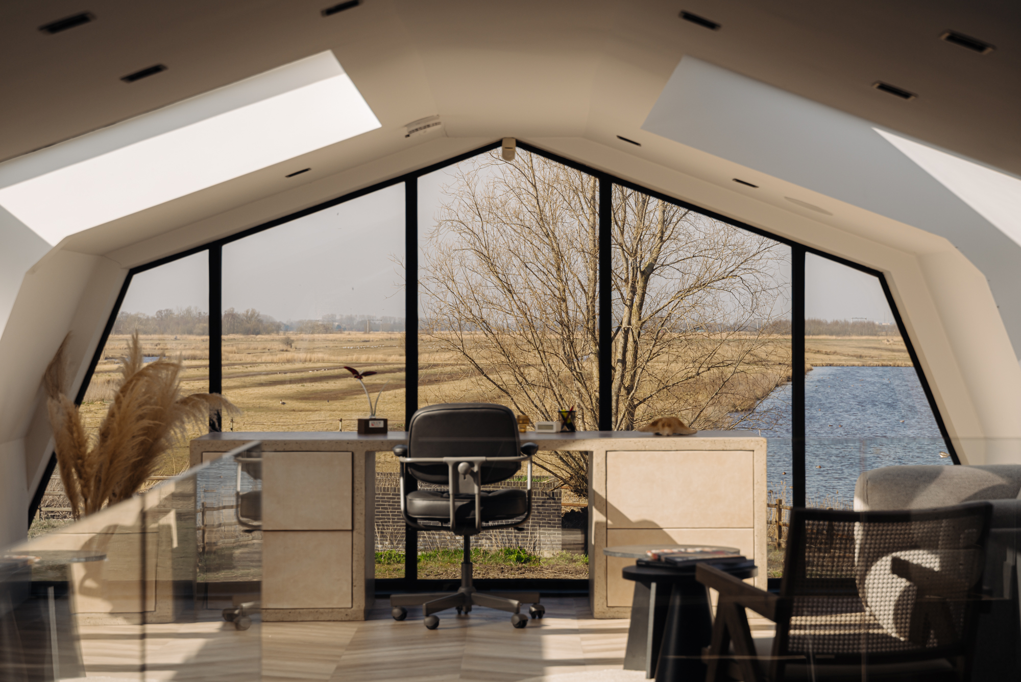 Het prachtige vrijstaande bijgebouw en/ of gastenverblijf is een zeer multifunctionele ruimte met een adembenemend vrij uitzicht over water en weilanden. De centrale open vide met trapopgang, verbindt de 2 etages. De gebruiksmogelijkheden zijn eindeloos.