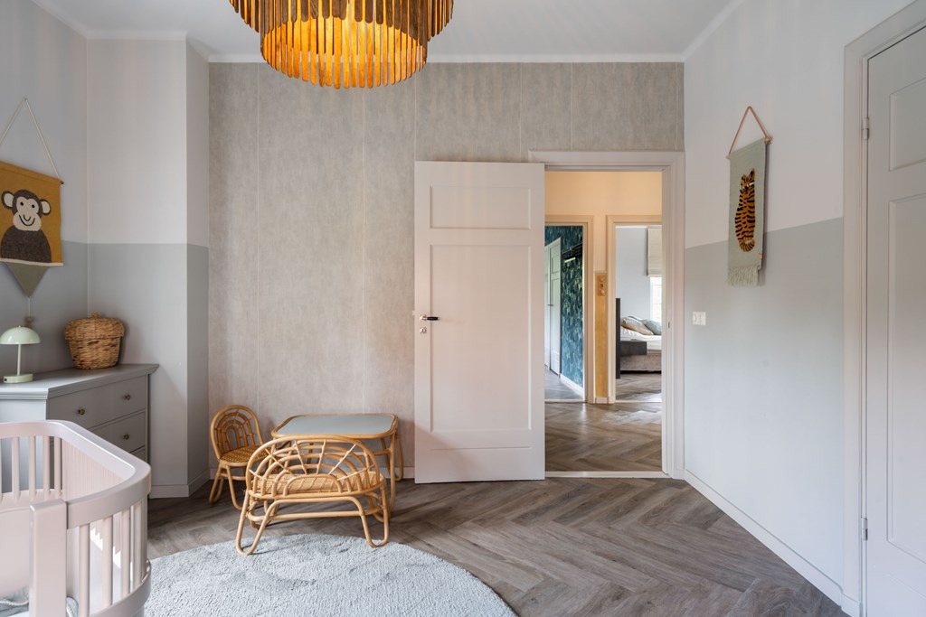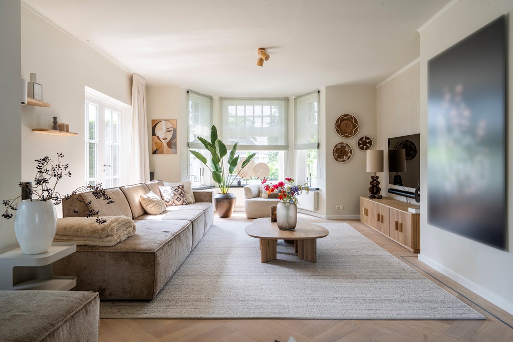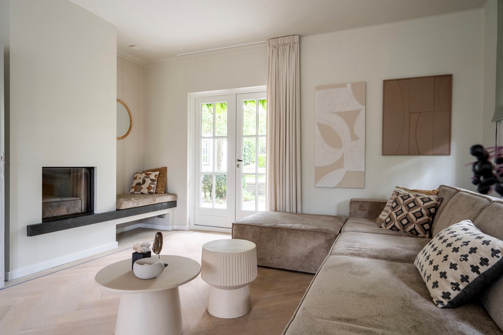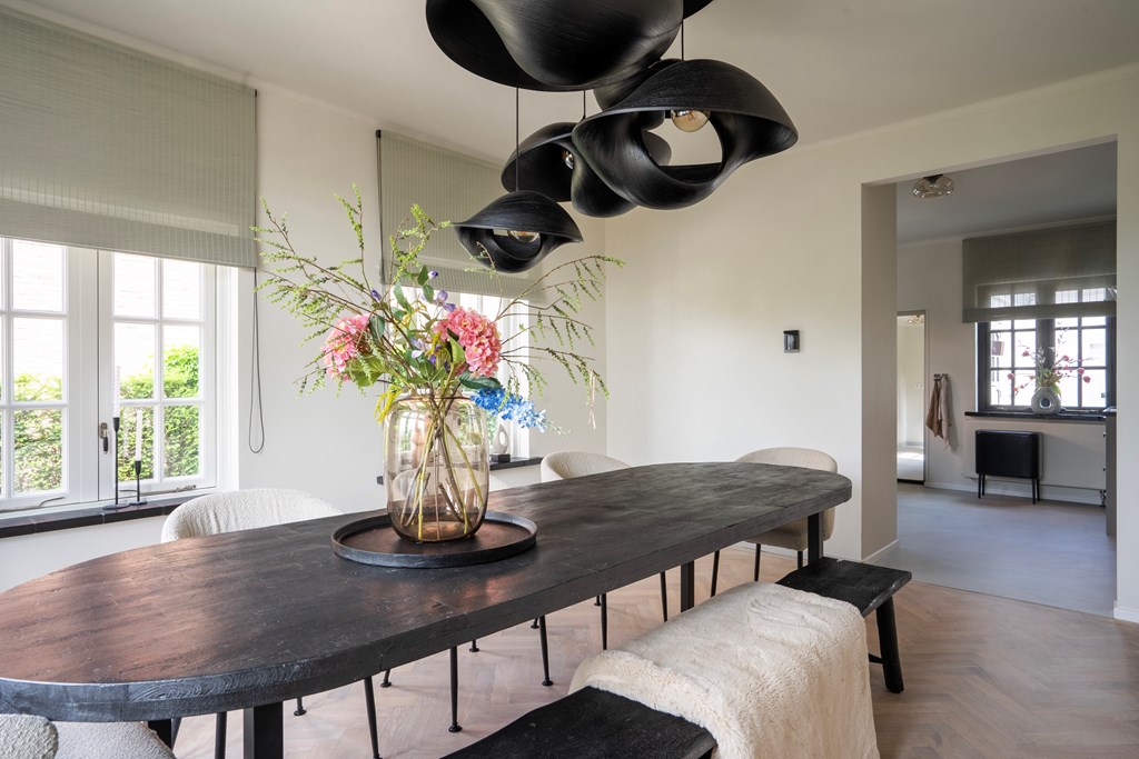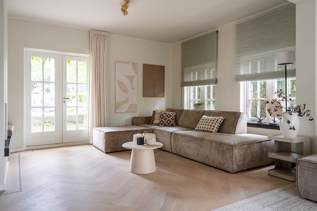 De woonkamer is een ware blikvanger met zijn visgraatvloer en elegante inrichting. Deze riante ruimte is slim ingedeeld en biedt meerdere gezellige zitplekken, waardoor u kunt genieten van de verschillende hoeken en uitzichten in de kamer. De overvloed aan ramen zorgt voor een prachtige lichtinval gedurende de dag, wat bijdraagt aan een lichte en open sfeer. Hier kunt u ontspannen met een goed boek of gasten ontvangen in een stijlvolle setting.