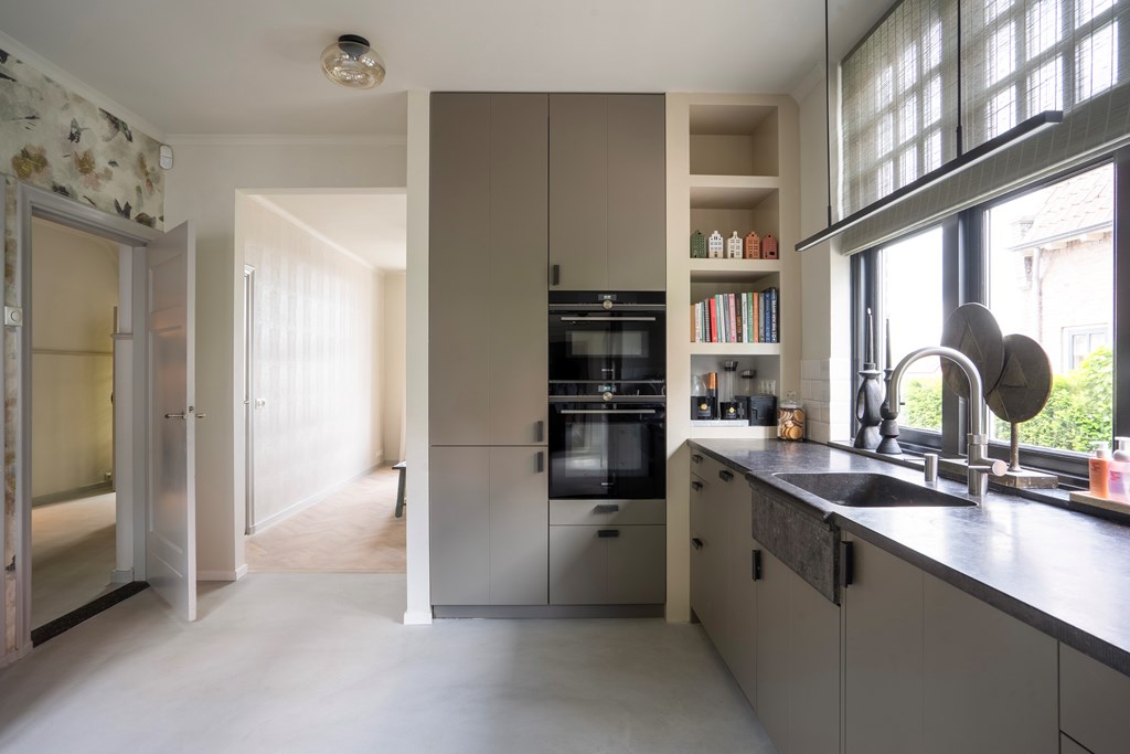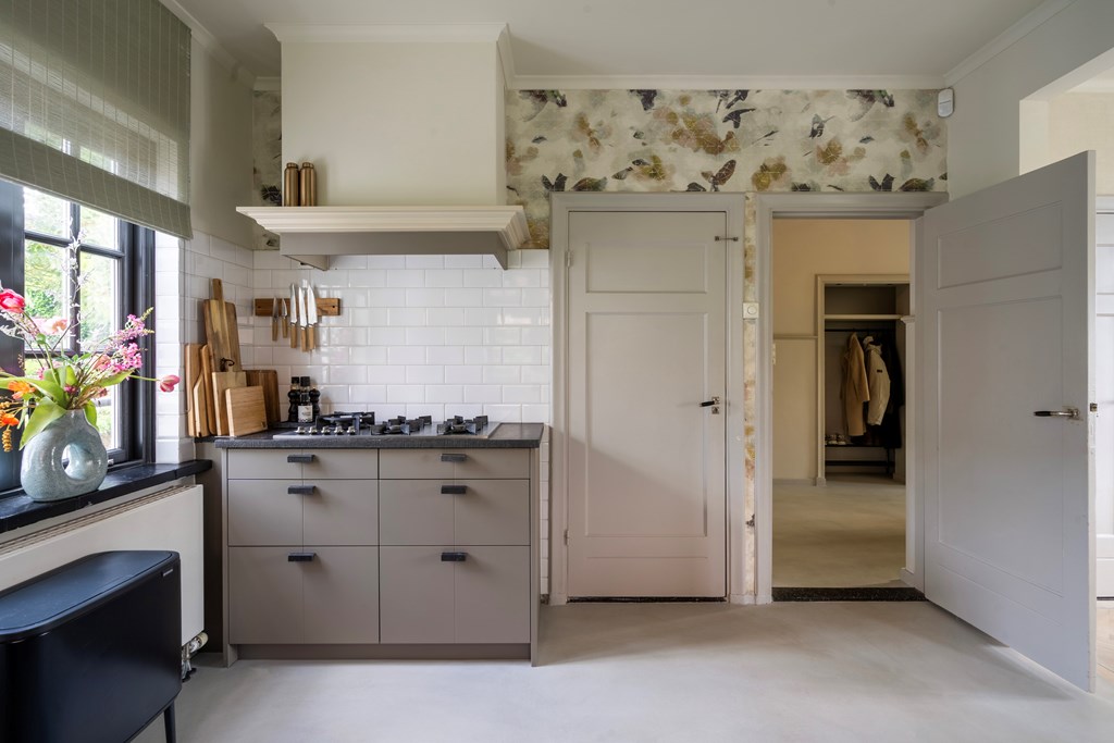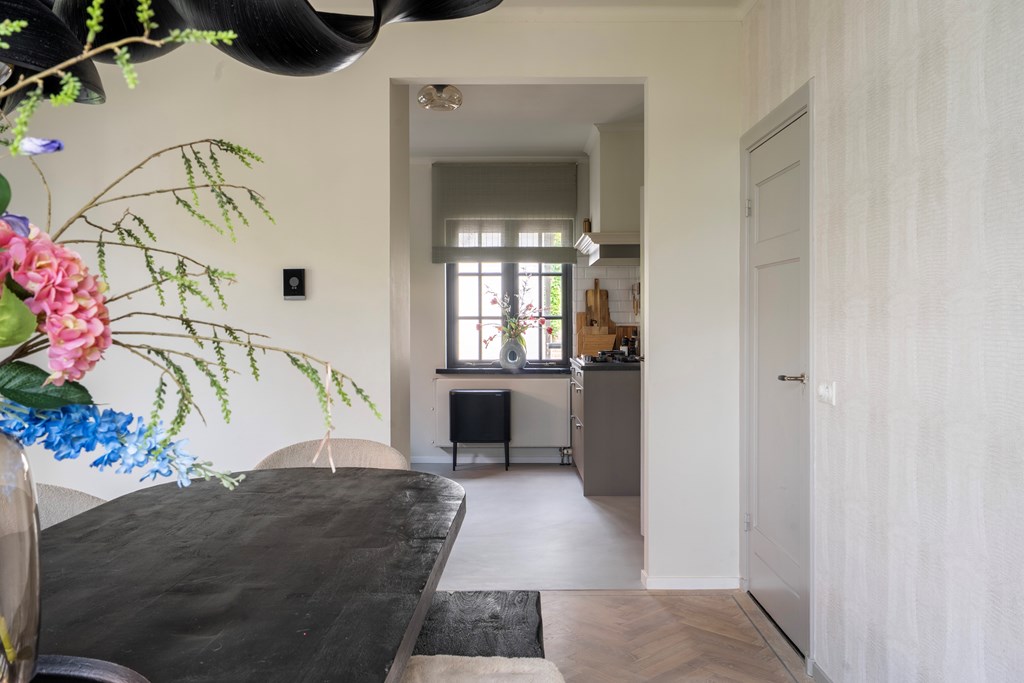 Aan de andere kant van de hal bevindt zich de luxe keuken. Deze ruime en modern ingerichte keuken is voorzien van hoogwaardige inbouwapparatuur en biedt veel werk- en opbergruimte. De keuken is een droom voor iedere kookliefhebber, met voldoende ruimte om uitgebreid te koken en te bakken. De keuken sluit naadloos aan op de eetkamer, een uitnodigende ruimte waar u met gemak met meerdere mensen kunt dineren. Of het nu gaat om een gezellig diner met familie of een formeel diner met vrienden, deze eetkamer biedt de perfecte setting. Vanuit de keuken heeft u tevens toegang tot de praktische bijkeuken, ideaal voor extra opslag en als wasruimte.
