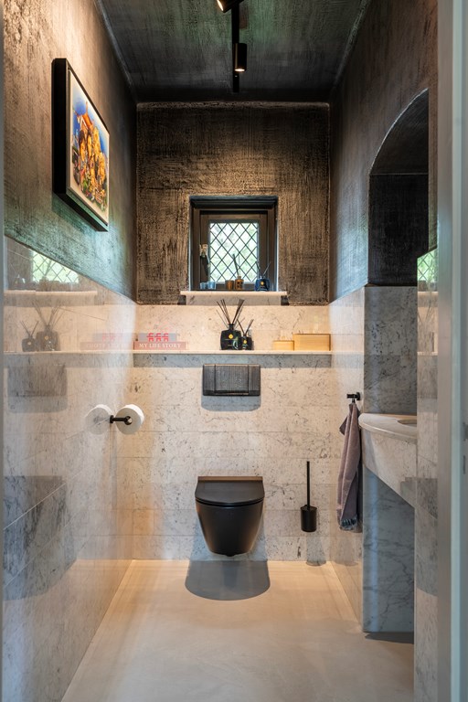 Bij aankomst valt meteen de imposante grindoprit op. Deze royale oprit biedt volop parkeergelegenheid voor meerdere voertuigen en leidt naar de stijlvolle entree van de villa. U wordt verwelkomd in een grote, ruime hal die een gevoel van grandeur uitstraalt. Hier vindt u een fraai afgewerkte wc, handig voor zowel bewoners als gasten. De hal geeft u toegang tot de verschillende leefruimtes die deze woning zo uniek maken.