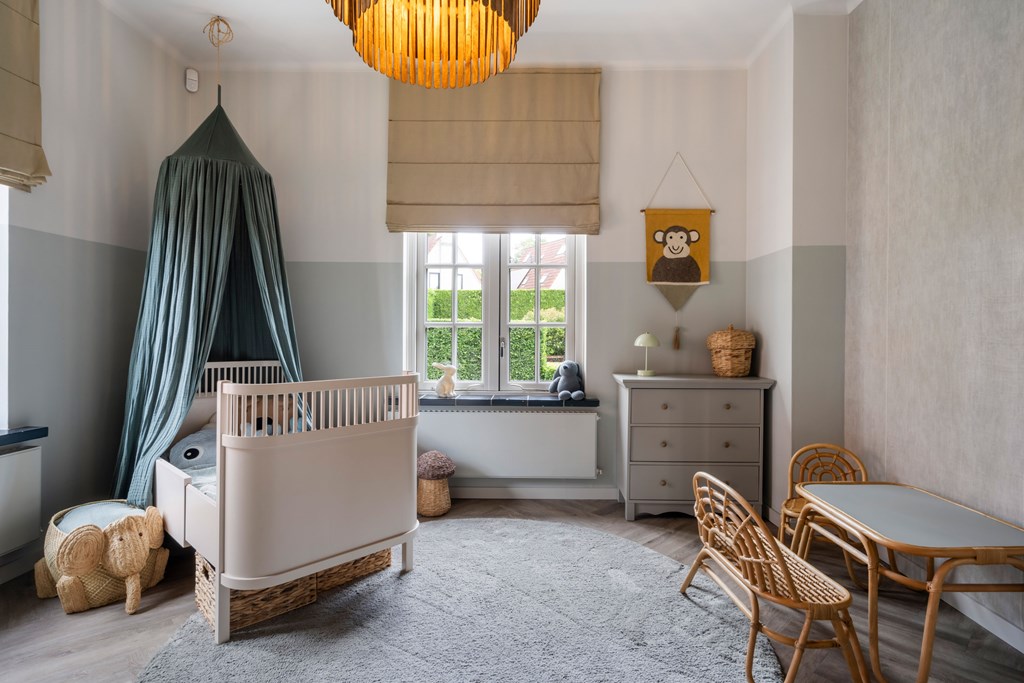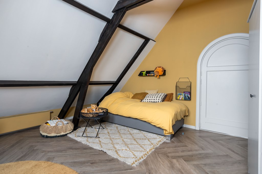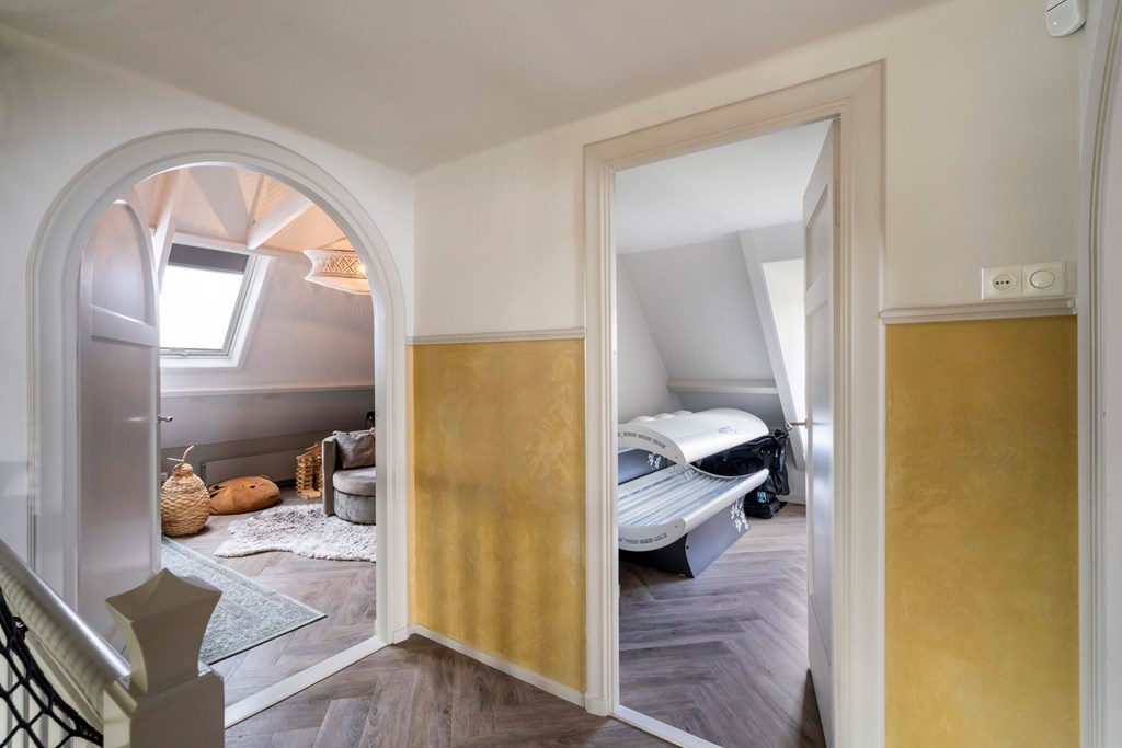 Wanneer u vanuit de hal naar de eerste verdieping gaat, komt u uit bij de indrukwekkende trap die als een rode draad door het huis loopt. Deze statige trap, een blikvanger in de woning, leidt u naar de bovenverdieping.