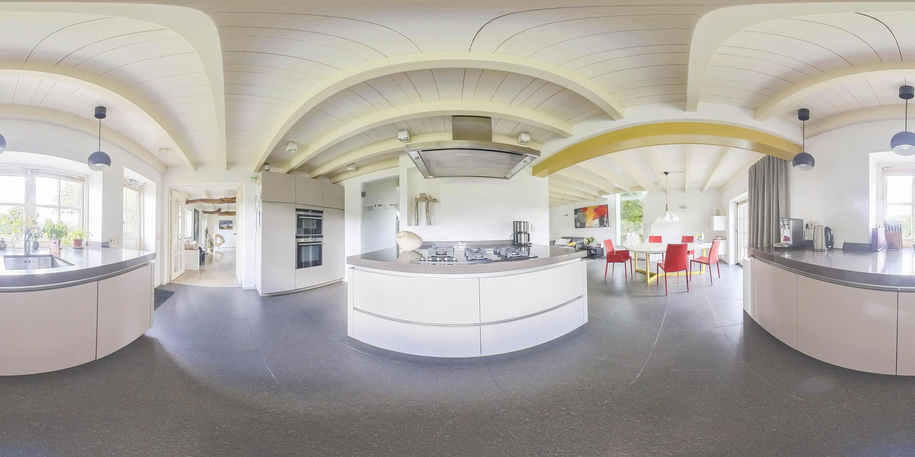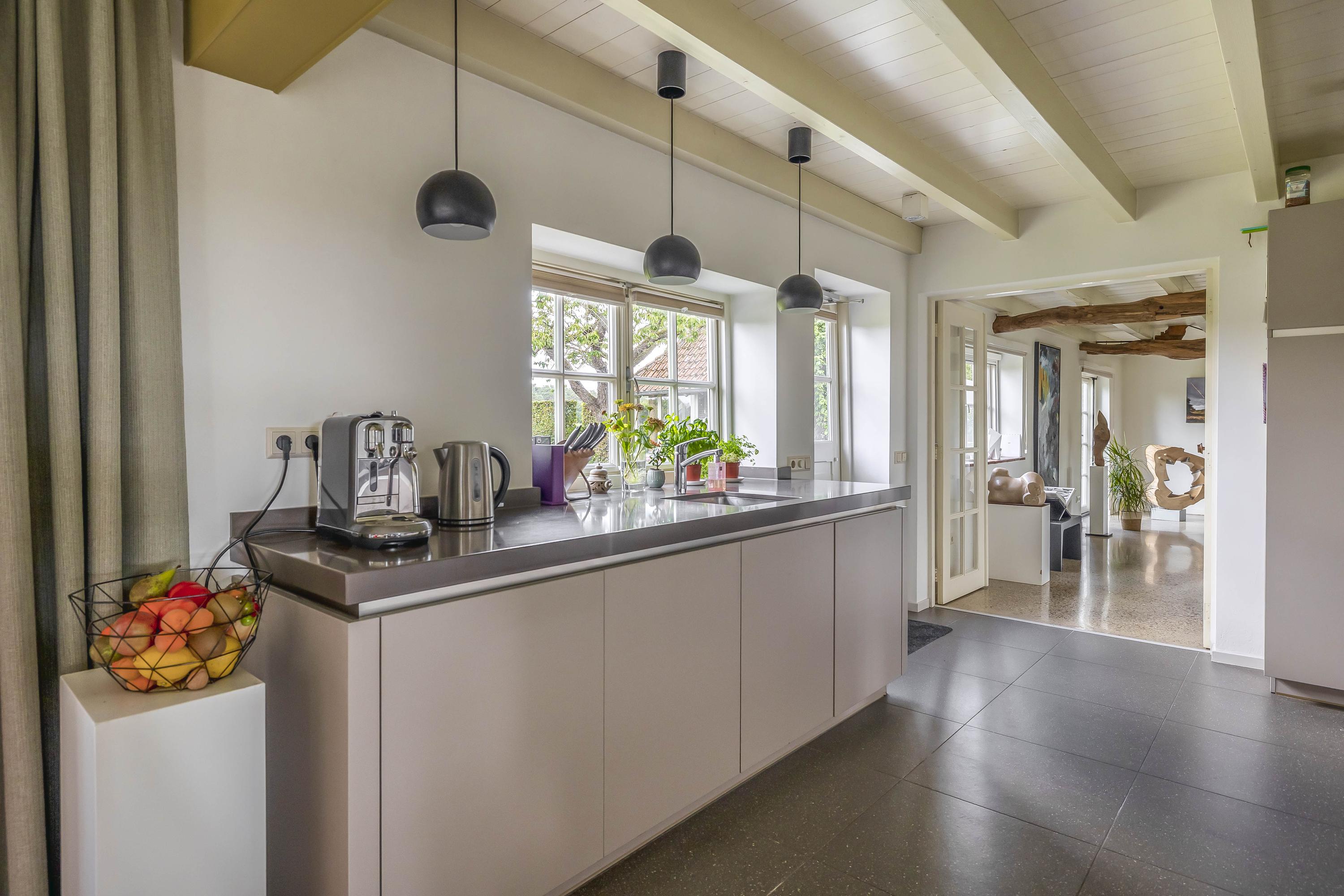 Vanuit de hal stap je de royale leefkeuken aan de linkerzijde van de woning binnen. De keuken is eveneens voorzien van een tegelvloer met vloerverwarming met stucwerk wanden en een fraai houten balken plafond. In 2011 is de keuken voorzien van een compleet vernieuwde inrichting. Je treft er een kook-/schiereiland met een composiet aanrechtblad, een 5-pits gaskookplaat inclusief wokbrander, afzuigkap en de nodige bergruimte. Een wandopstelling met composiet aanrechtblad is uitgerust met een grootsteen, vaatwasser en een close-in-boiler. Een andere wandopstelling bevat een diepvries, koelkast, oven en stoomoven. Vanuit de keuken heb je via een loopdeur en dubbele openslaande tuindeuren toegang tot de achtertuin. De sfeer wordt verhoogd door de opgestelde houtkachel en een fraai hoog raam aan de zijgevel met zicht via een glasplaat in de slaapkamer op de eerste verdieping. Ook is er een vaste inbouwkast met de opstelling van de vloerverwarmingsverdeler.