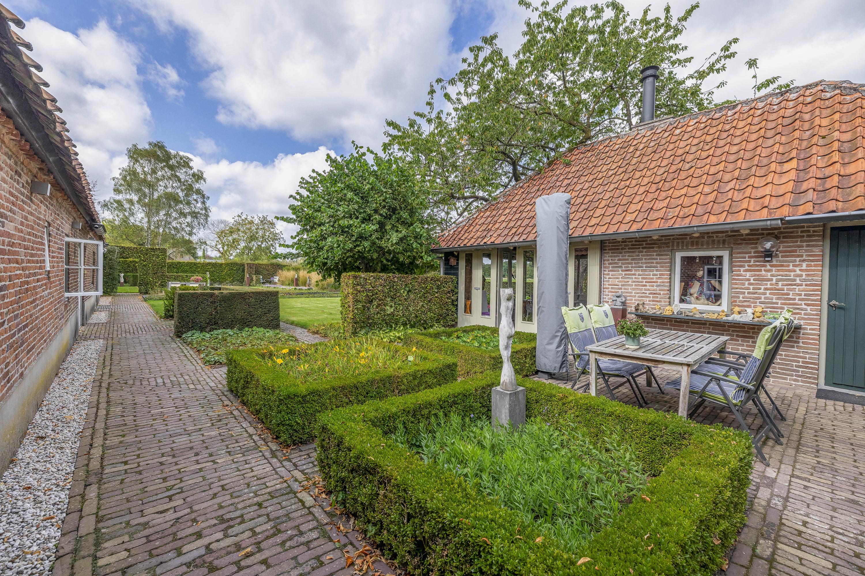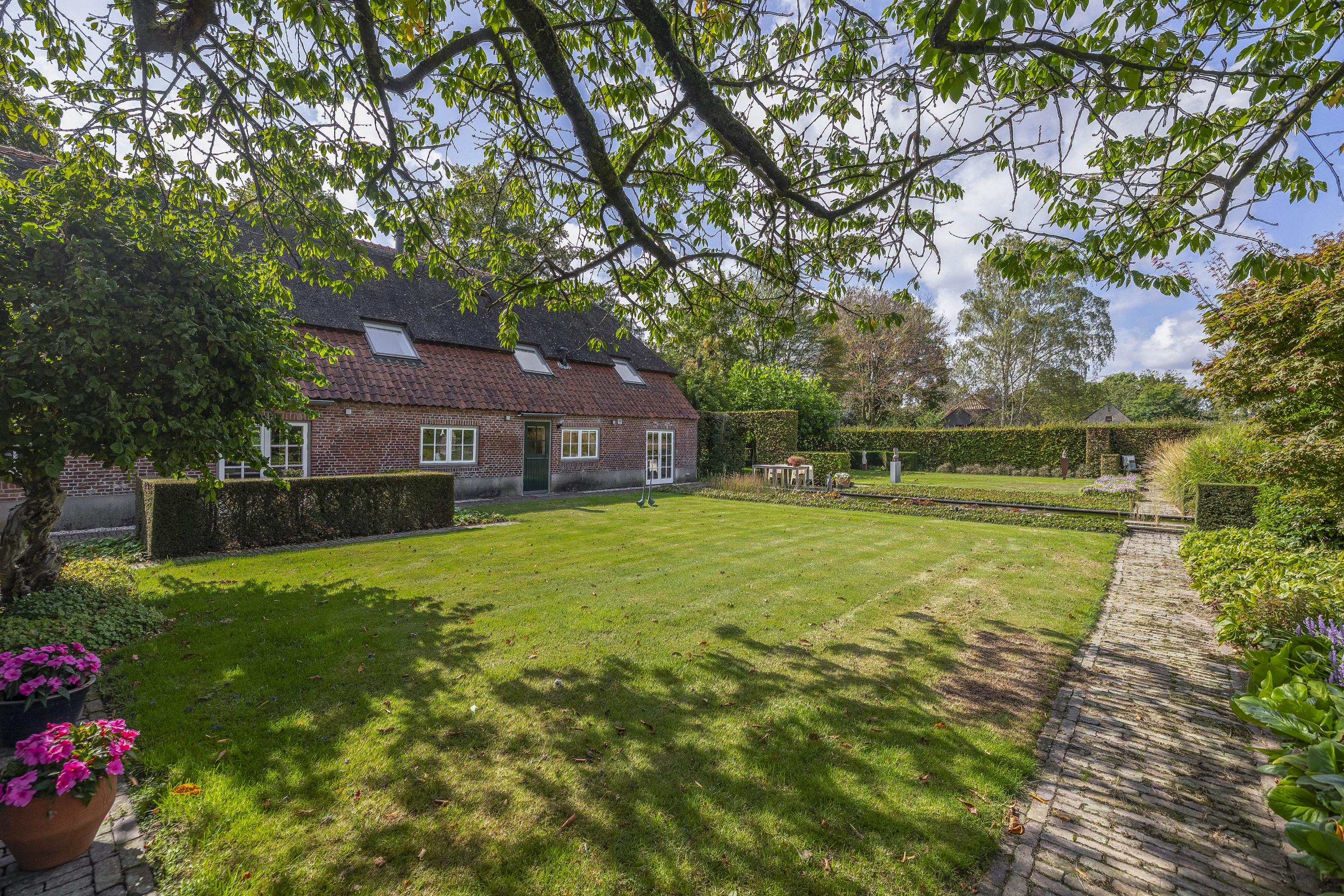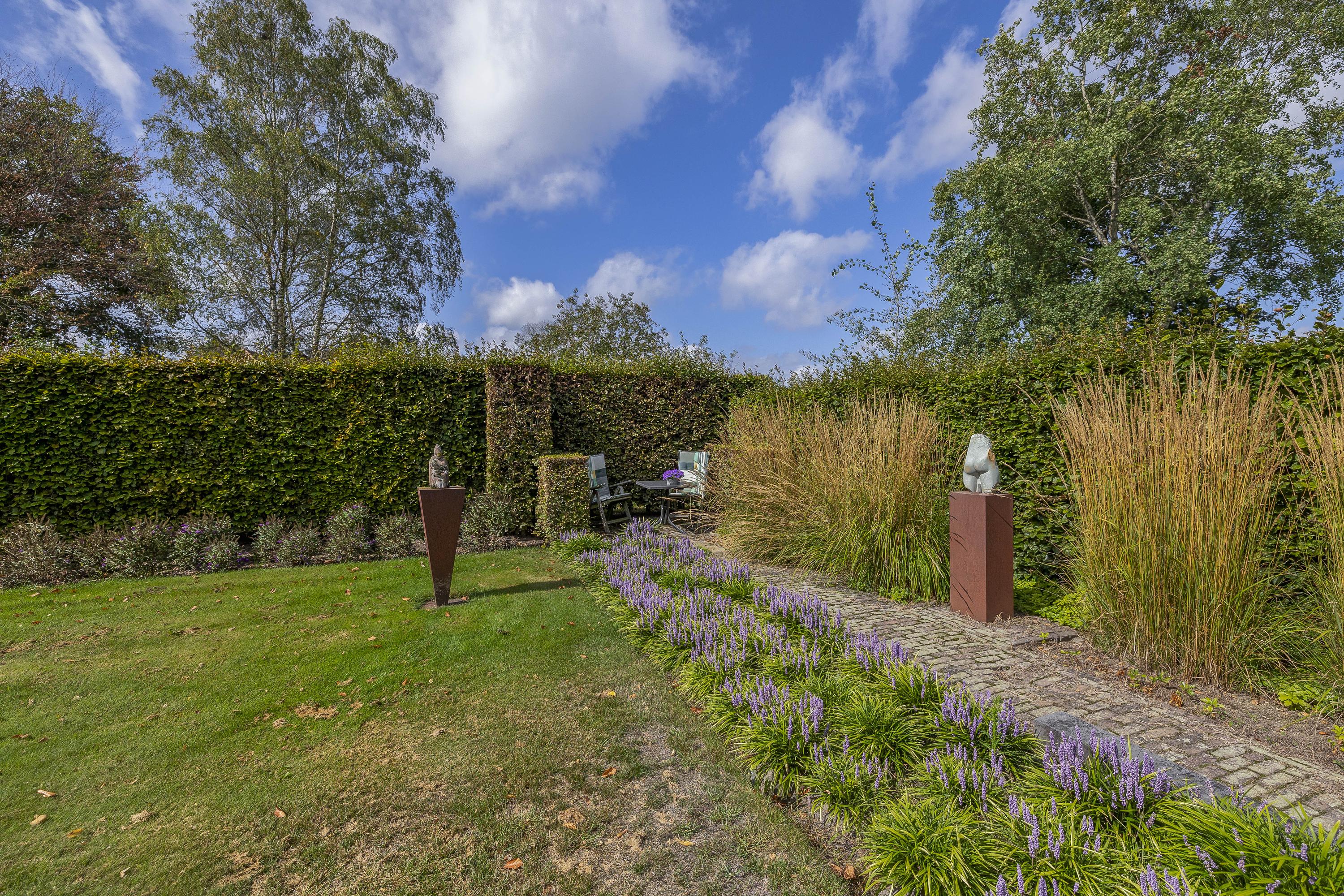 Achter de woning en aan de zijkanten ligt een prachtig aangelegde tuin. Aan de linkerzijde bevindt zich een mooi royaal stuk met gazon, plantenborders, bestrating van oude gebakken klinkers en diverse beukenhagen. Aan de achterzijde geniet je van een fraai zicht, een grote vijverpartij (met biologische filter), een ruim gazon, plantenborders en volwassen begroeiing. De tuin is goed aangelegd en goed onderhouden. Een dubbele oprit is aanwezig aan de rechterzijde van het pand. De tuin biedt zelfs de mogelijkheid voor het houden van kleine beestjes. Je vindt er ook een stukje tuin met een "de loverslane". Links van de woning ligt een aangelegde jeu-de-boules-baan.