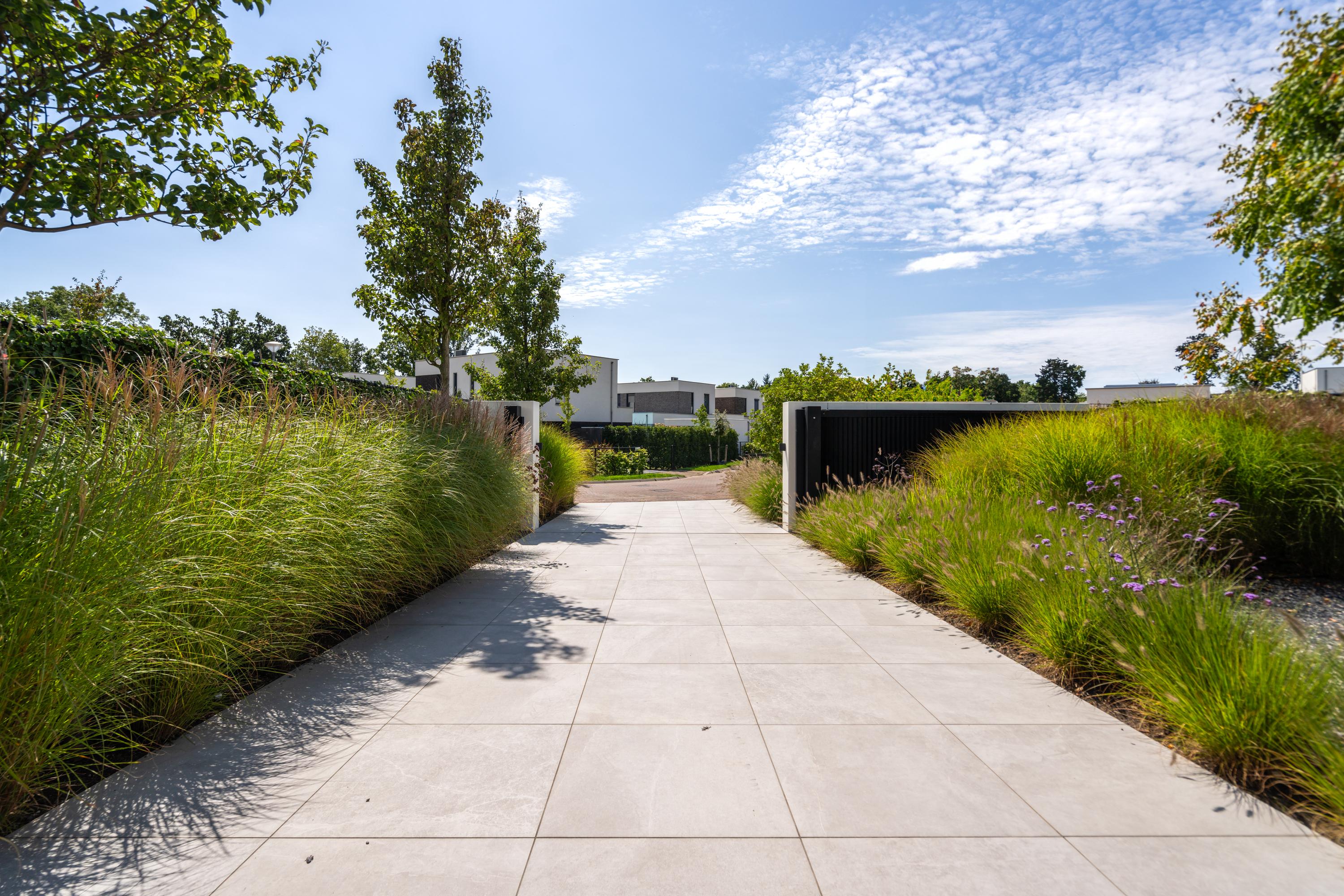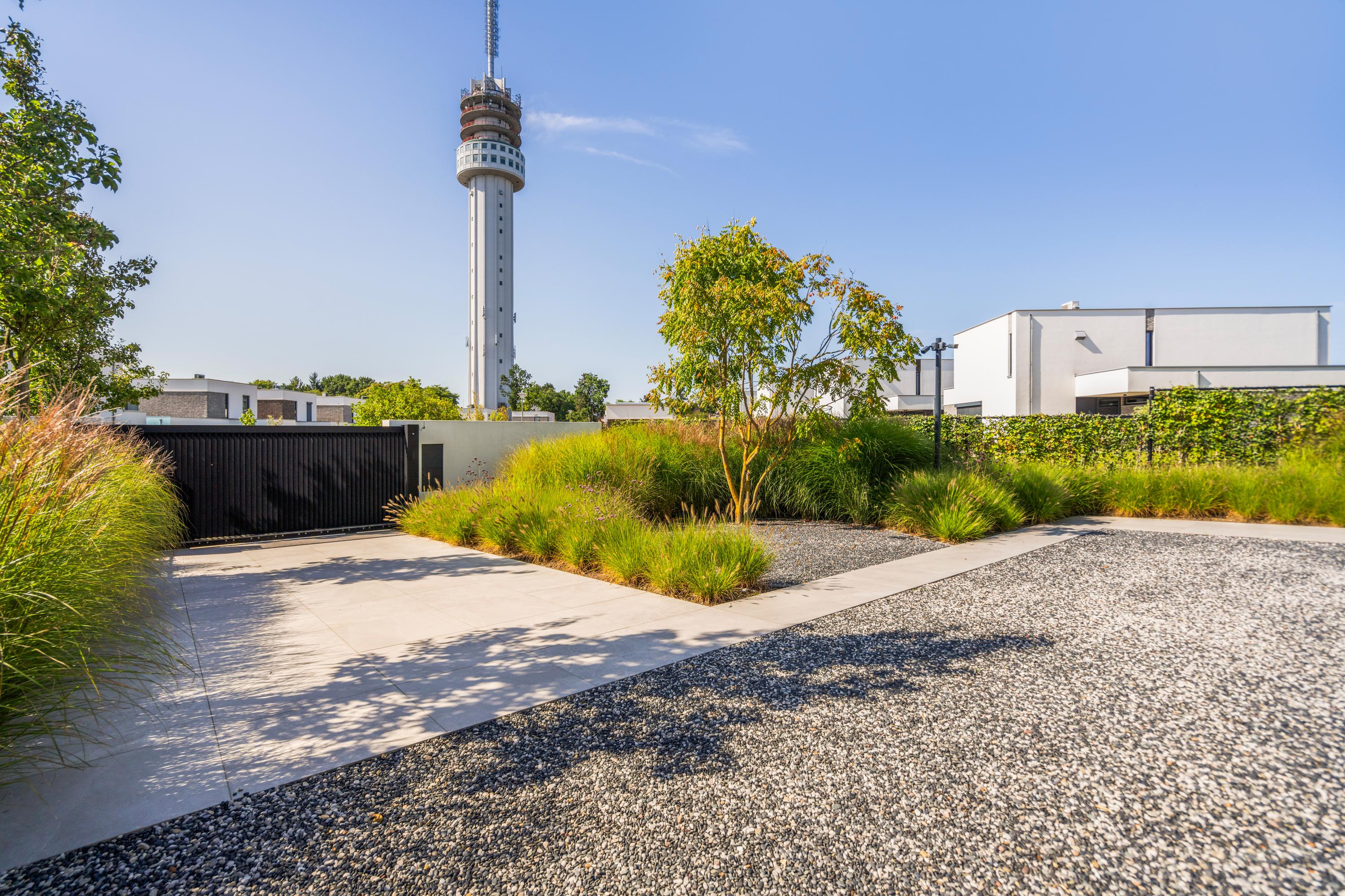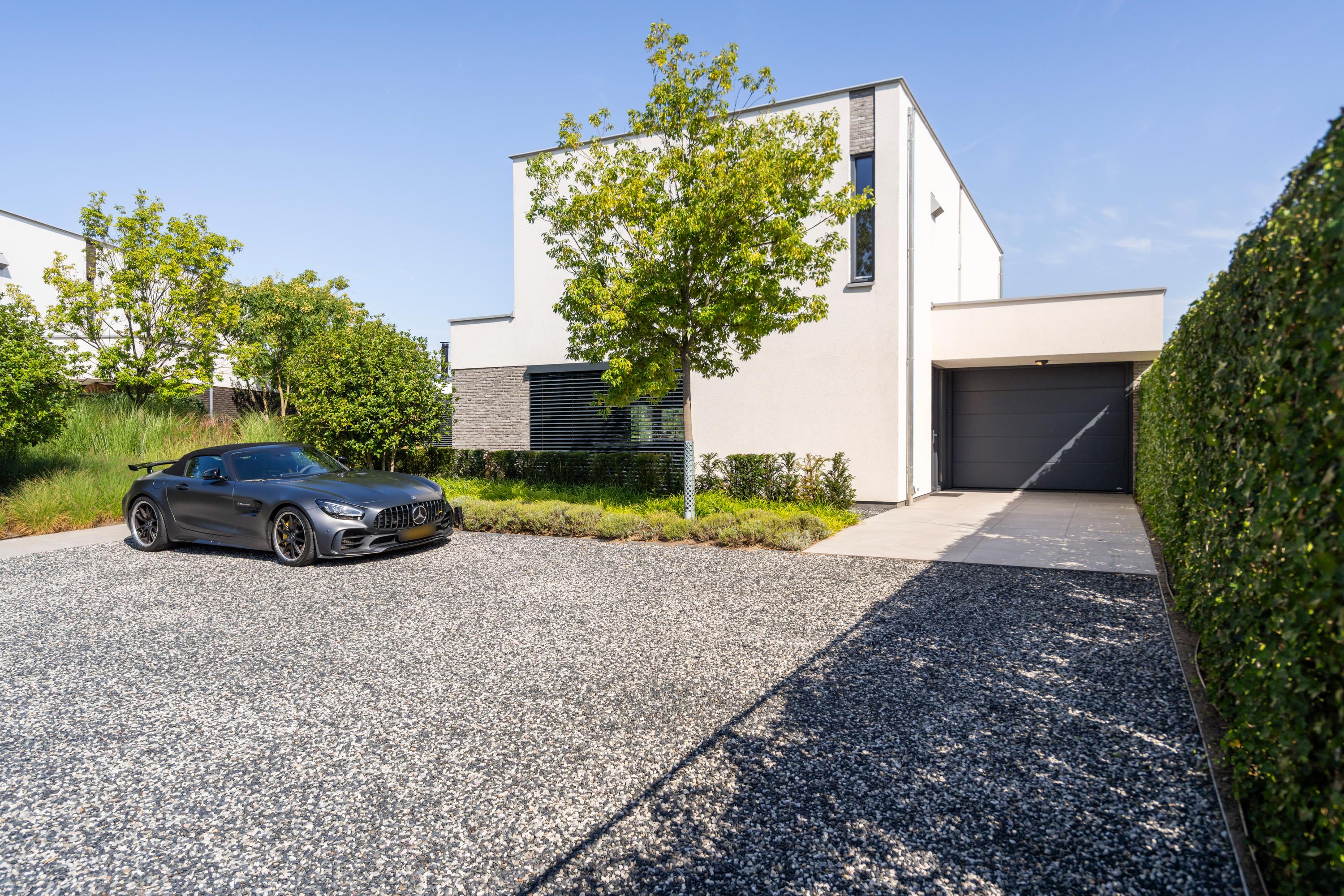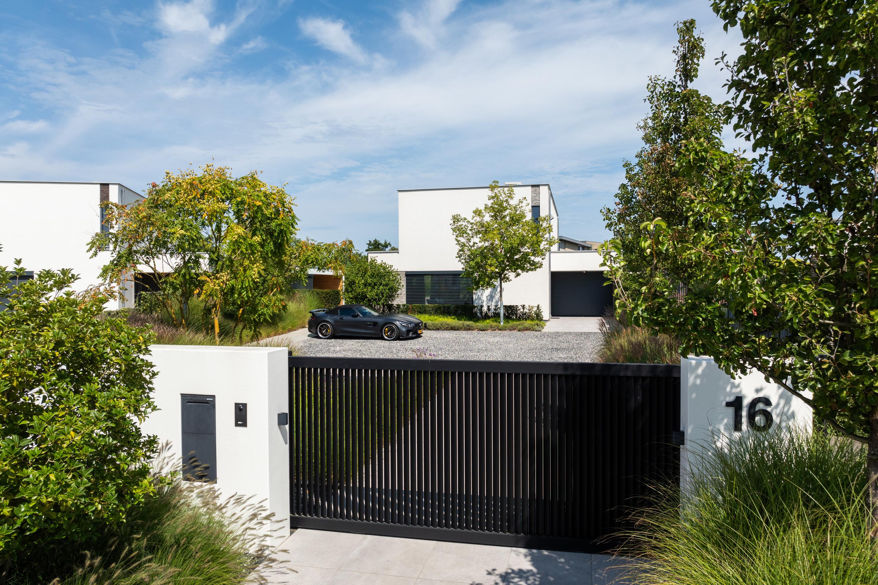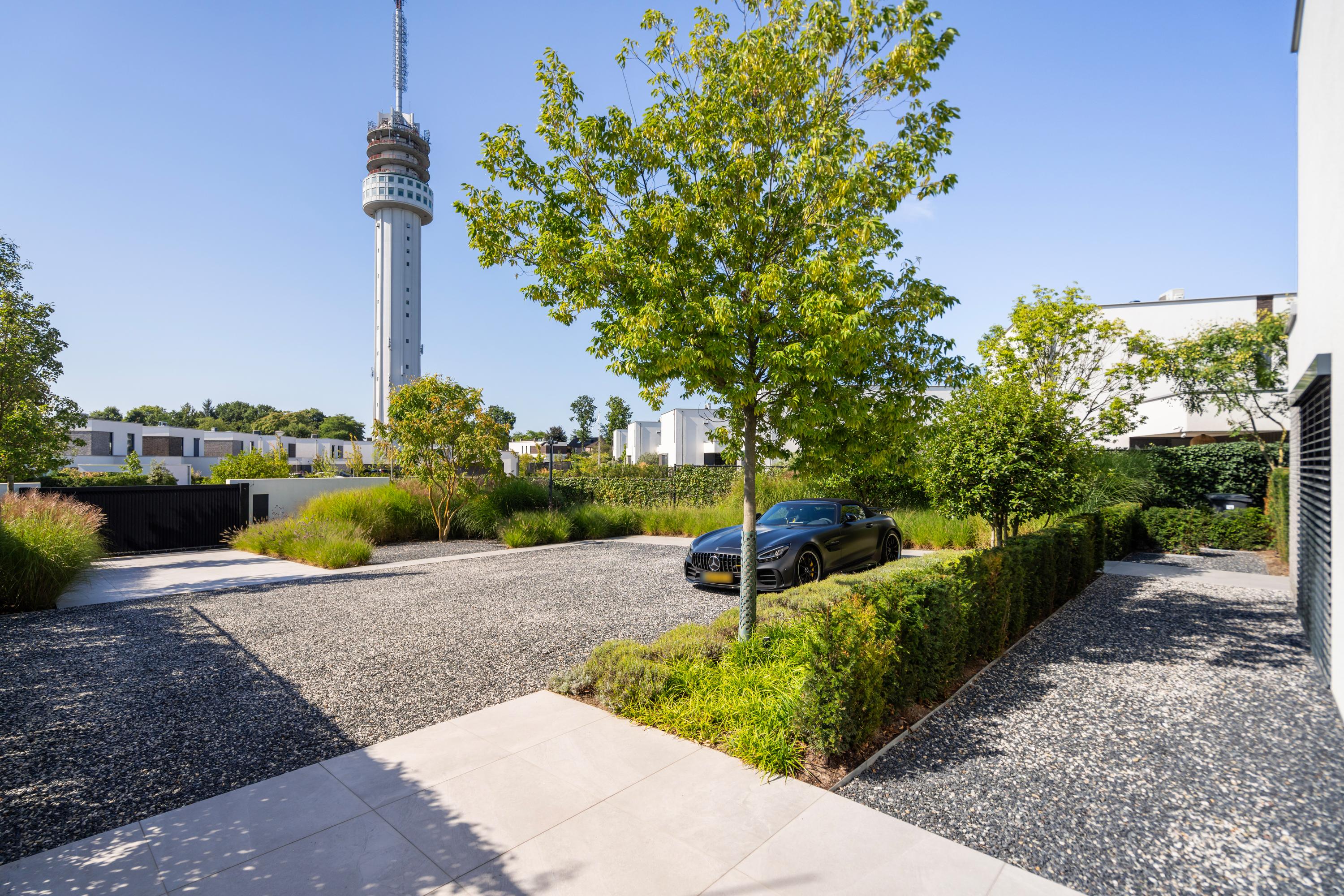 De villa wordt aan de voorzijde omarmd door een royale voortuin die direct de toon zet voor het exclusieve karakter van de woning. De zorgvuldig ontworpen combinatie van moderne bestrating en groene perken zorgt voor een harmonieus en verzorgd geheel, waarbij strak design en natuurlijke elementen elkaar versterken. Via de eigen oprit, uitgevoerd met hoogwaardige tegels en subtiel geïntegreerd groen, bereik je de woning op stijlvolle wijze. De entree wordt geaccentueerd door een fraaie halfhoge muur, waarin een extra grote, geïntegreerde brievenbus is verwerkt. Een detail dat luxe en functionaliteit moeiteloos combineert. Het geheel wordt compleet gemaakt door een geavanceerd intercomsysteem en een elektrische toegangspoort, die niet alleen bijdragen aan het comfort, maar ook aan privacy en veiligheid. Deze representatieve entree vormt een indrukwekkend welkom voor zowel bewoners als gasten en onderstreept het hoogwaardige niveau van deze exclusieve villa.