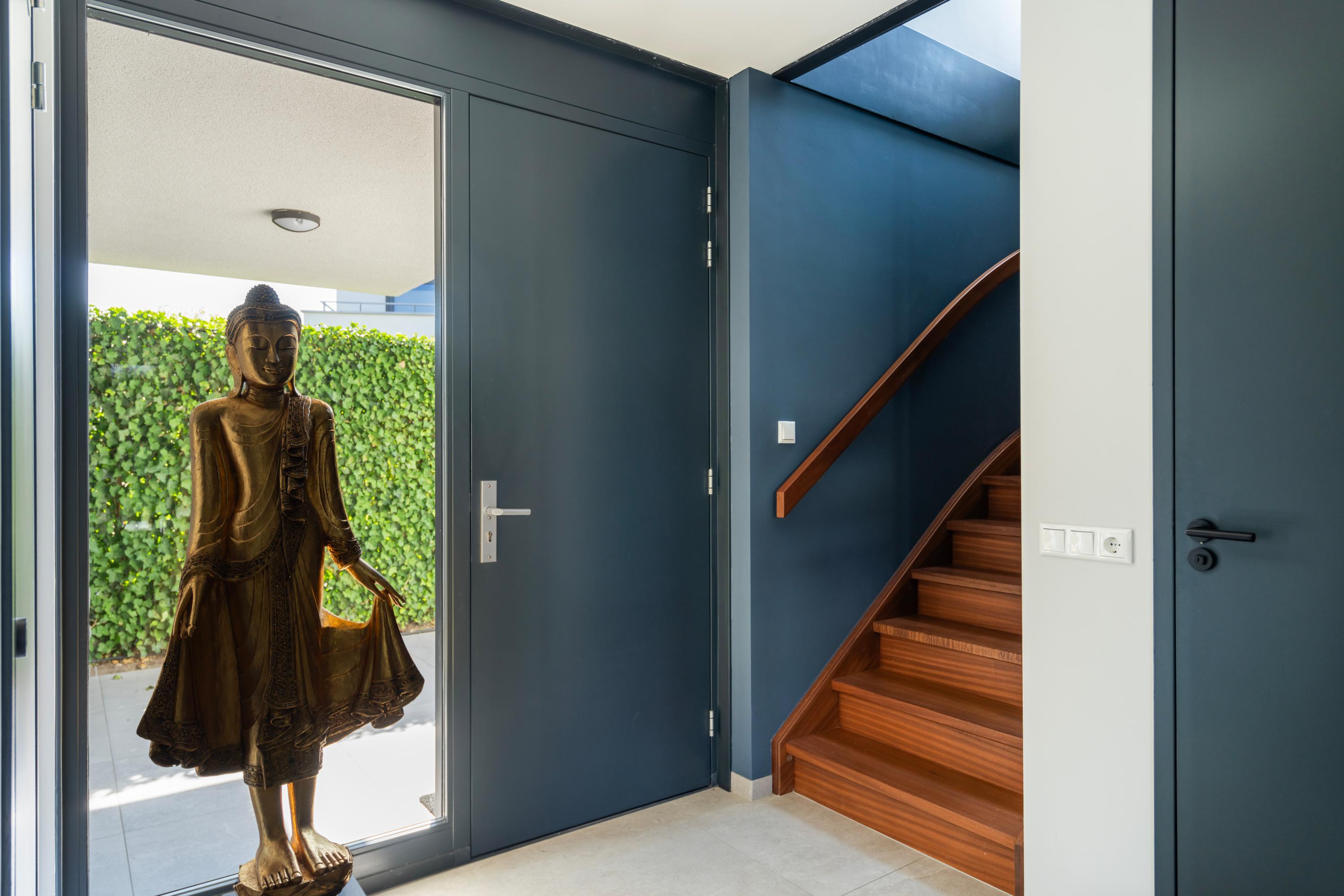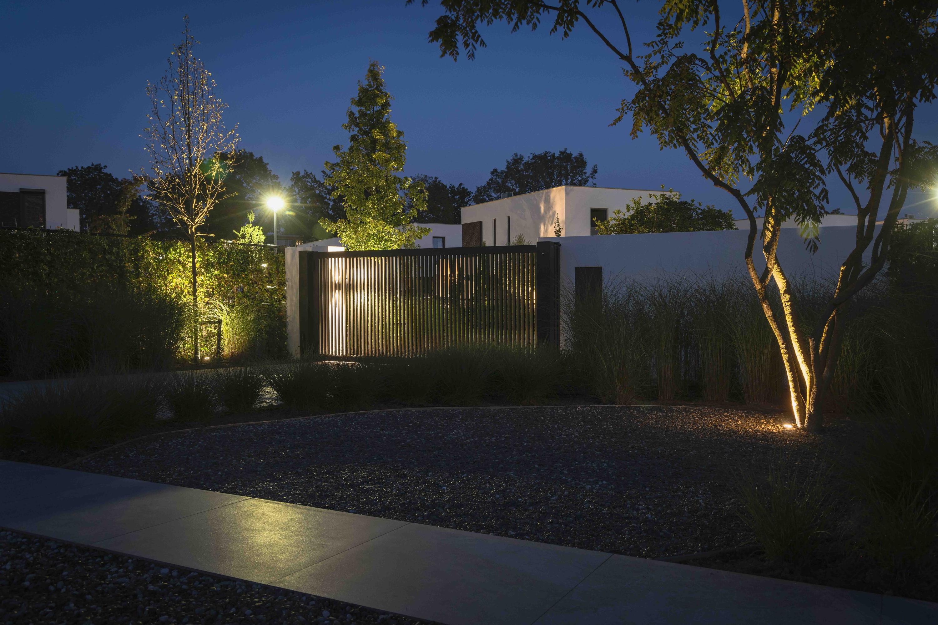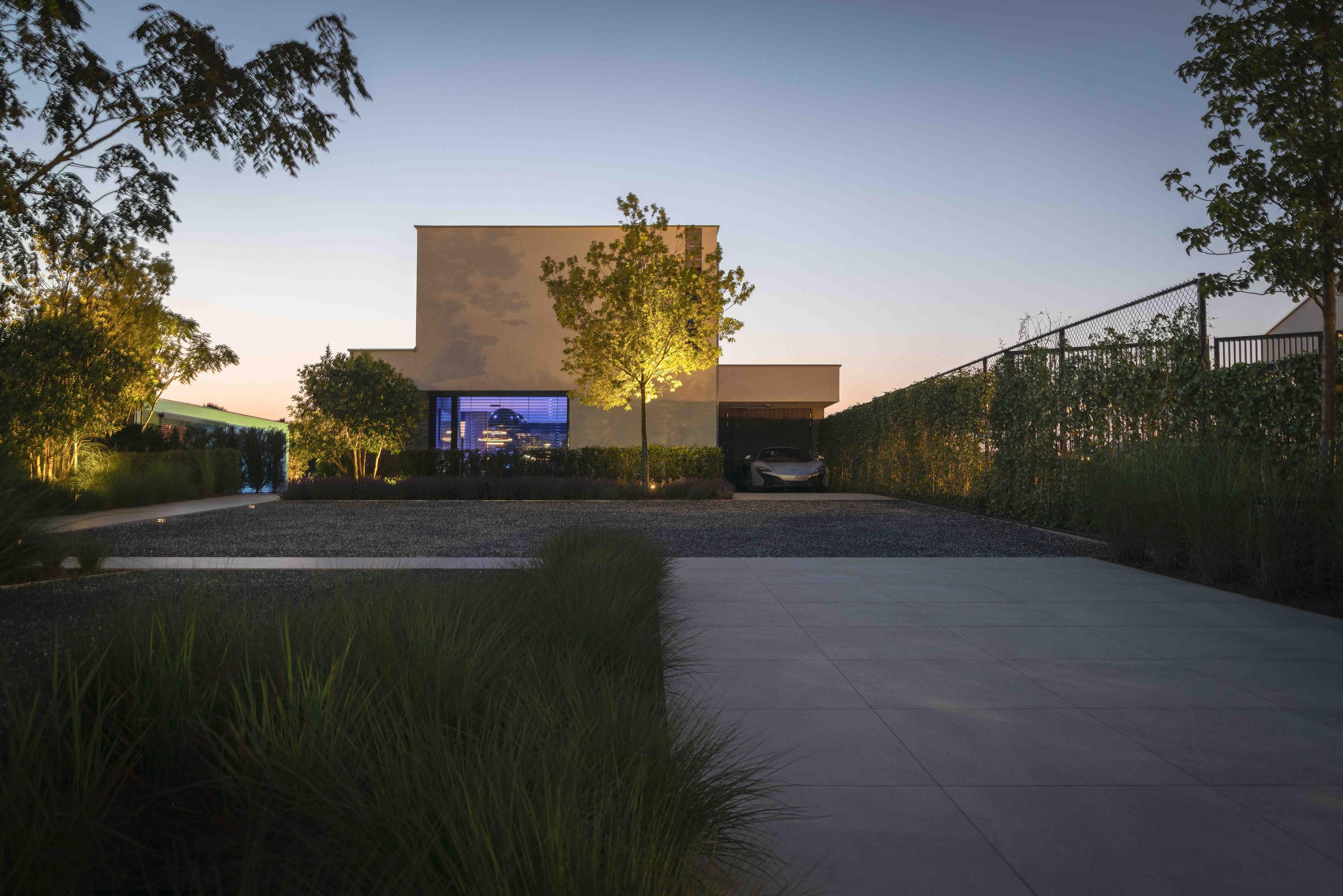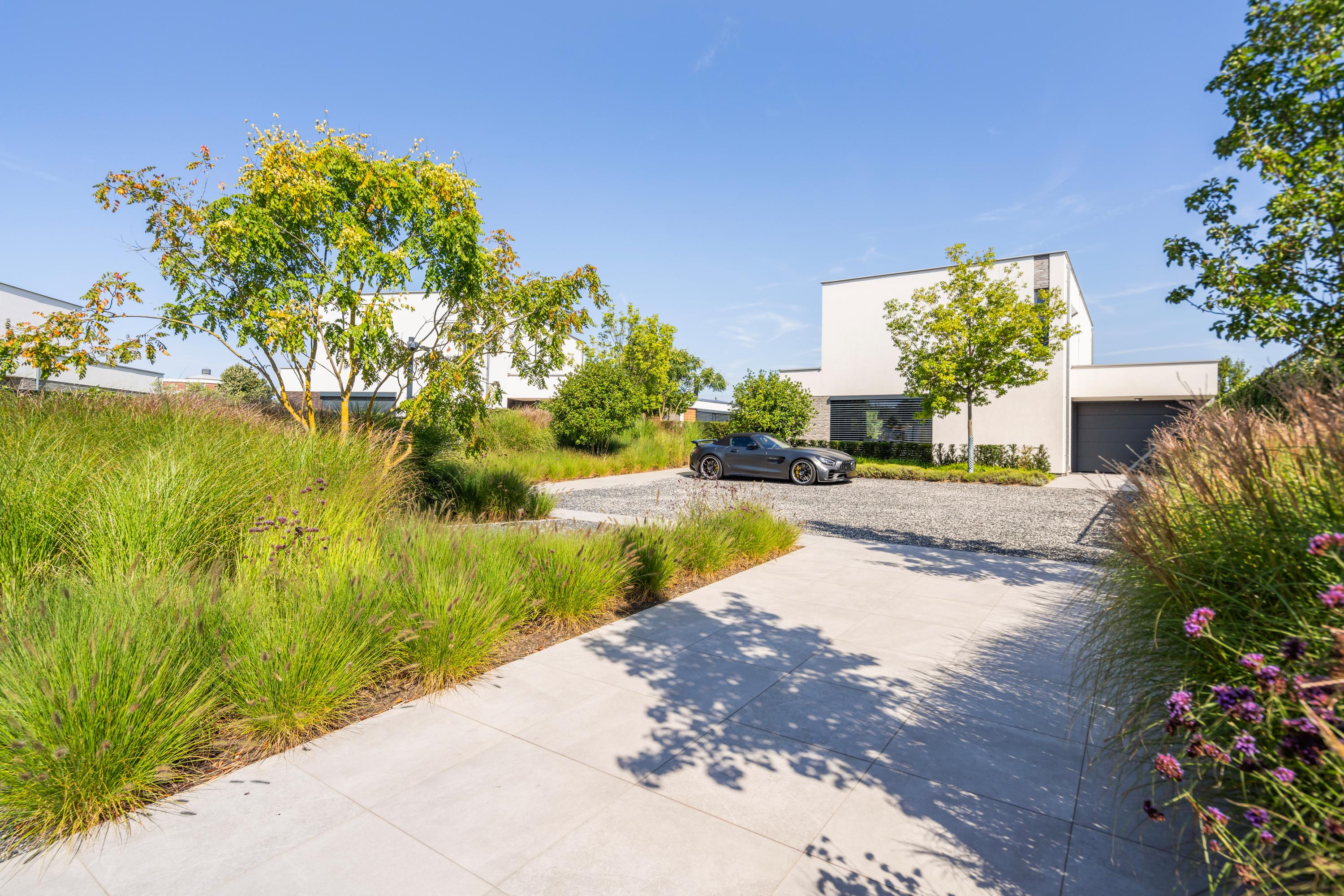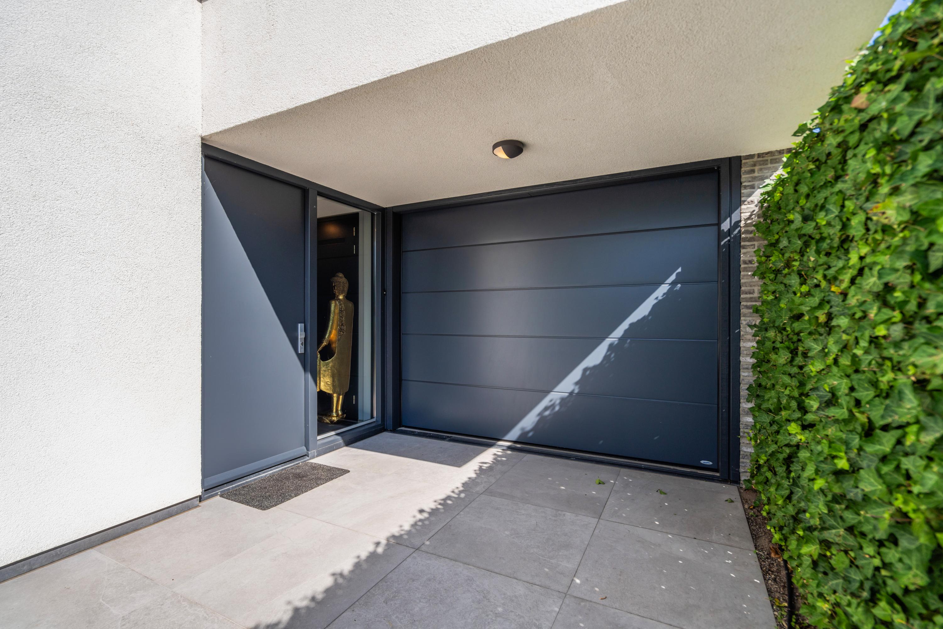 De villa wordt aan de voorzijde omarmd door een royale voortuin die direct de toon zet voor het exclusieve karakter van de woning. De zorgvuldig ontworpen combinatie van moderne bestrating en groene perken zorgt voor een harmonieus en verzorgd geheel, waarbij strak design en natuurlijke elementen elkaar versterken. Via de eigen oprit, uitgevoerd met hoogwaardige tegels en subtiel geïntegreerd groen, bereik je de woning op stijlvolle wijze. De entree wordt geaccentueerd door een fraaie halfhoge muur, waarin een extra grote, geïntegreerde brievenbus is verwerkt. Een detail dat luxe en functionaliteit moeiteloos combineert. Het geheel wordt compleet gemaakt door een geavanceerd intercomsysteem en een elektrische toegangspoort, die niet alleen bijdragen aan het comfort, maar ook aan privacy en veiligheid. Deze representatieve entree vormt een indrukwekkend welkom voor zowel bewoners als gasten en onderstreept het hoogwaardige niveau van deze exclusieve villa.
