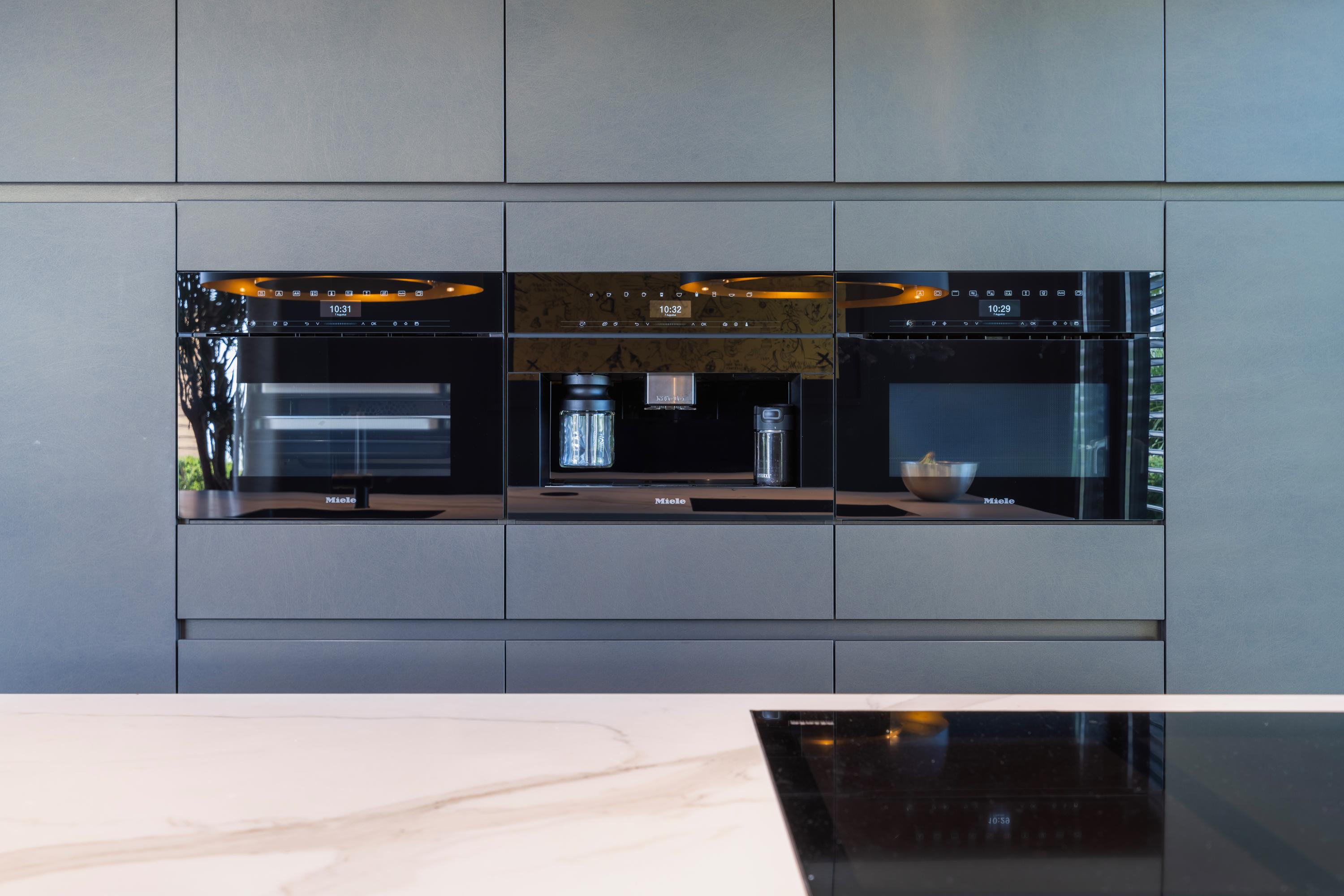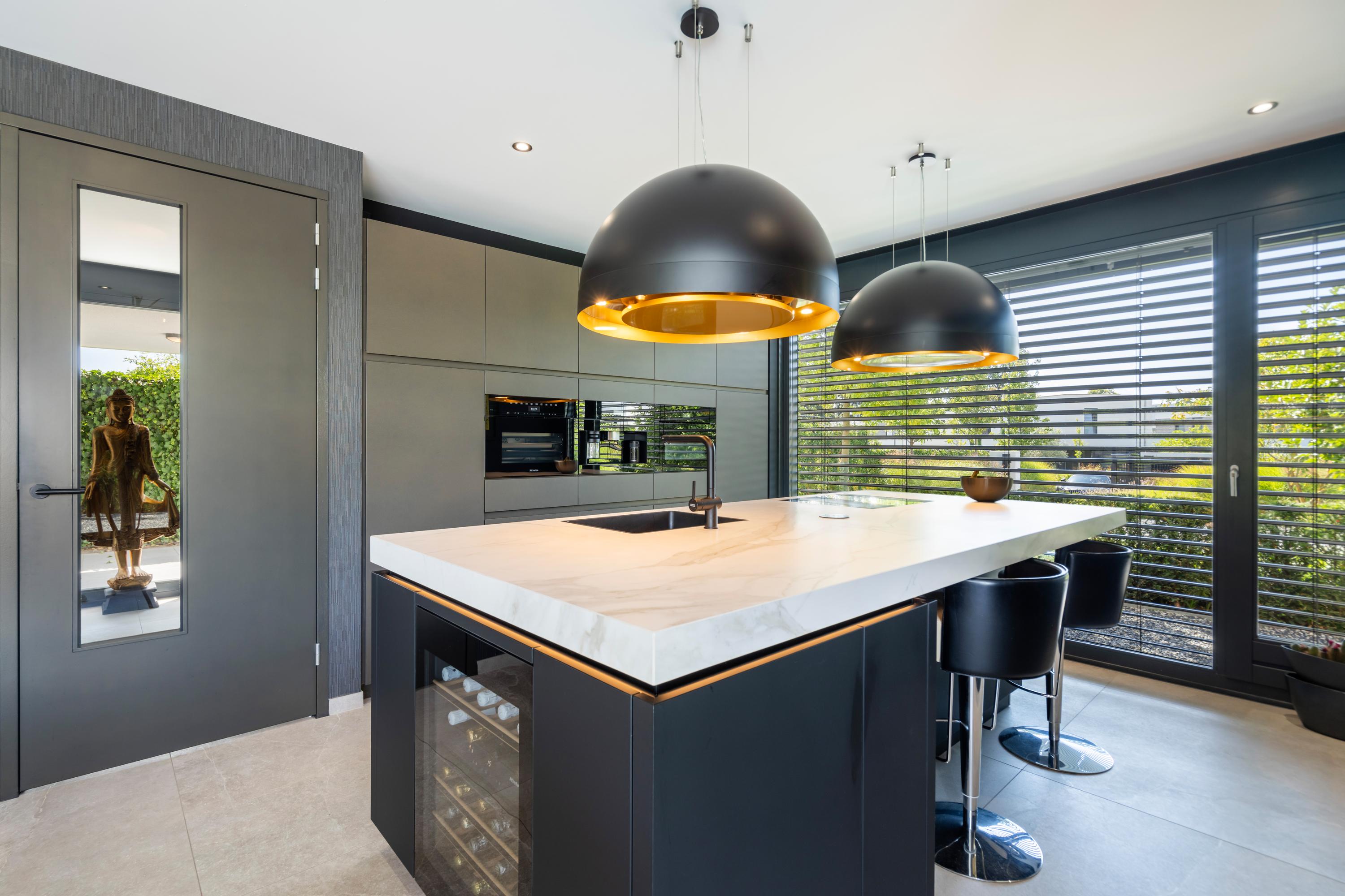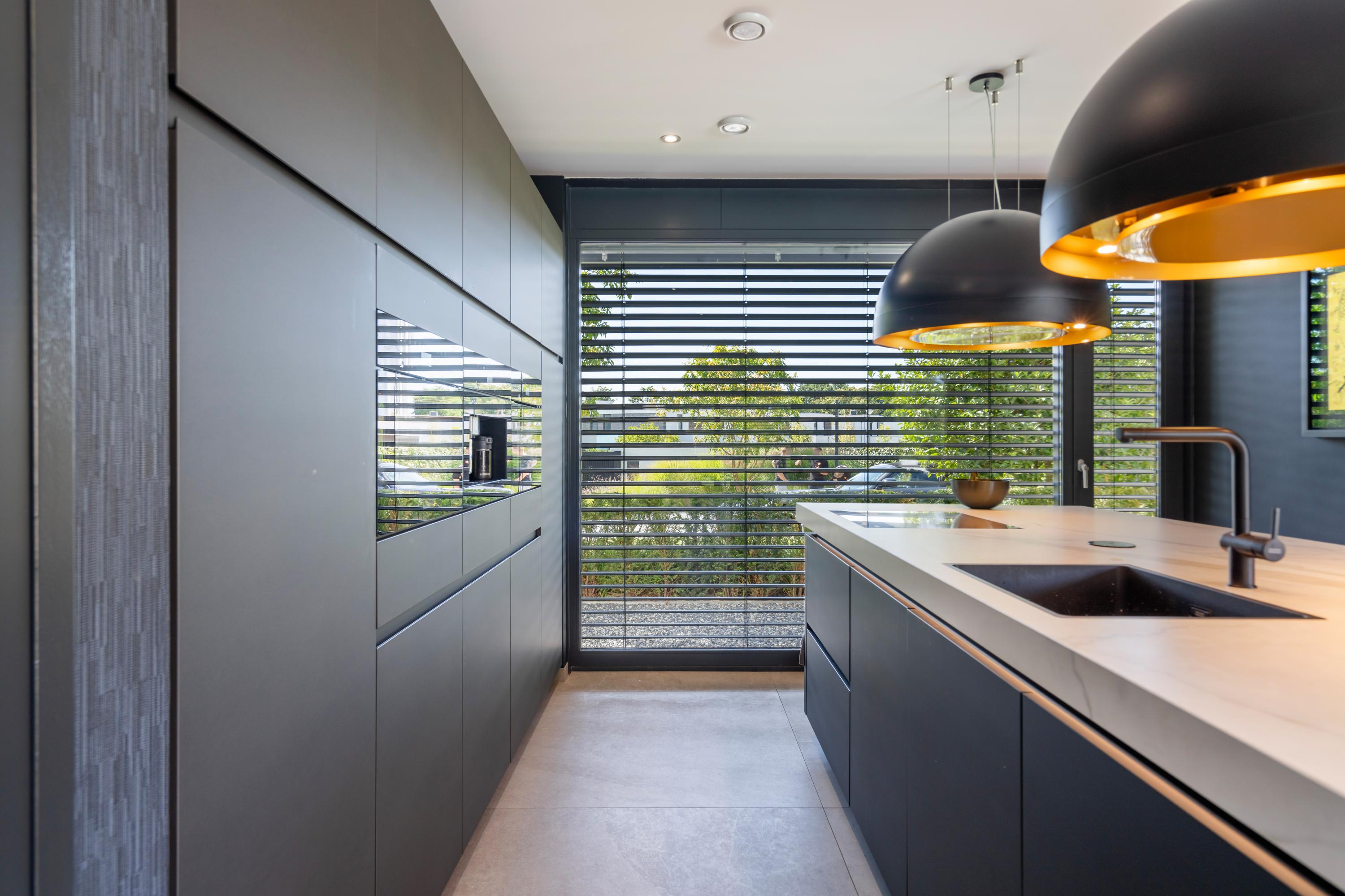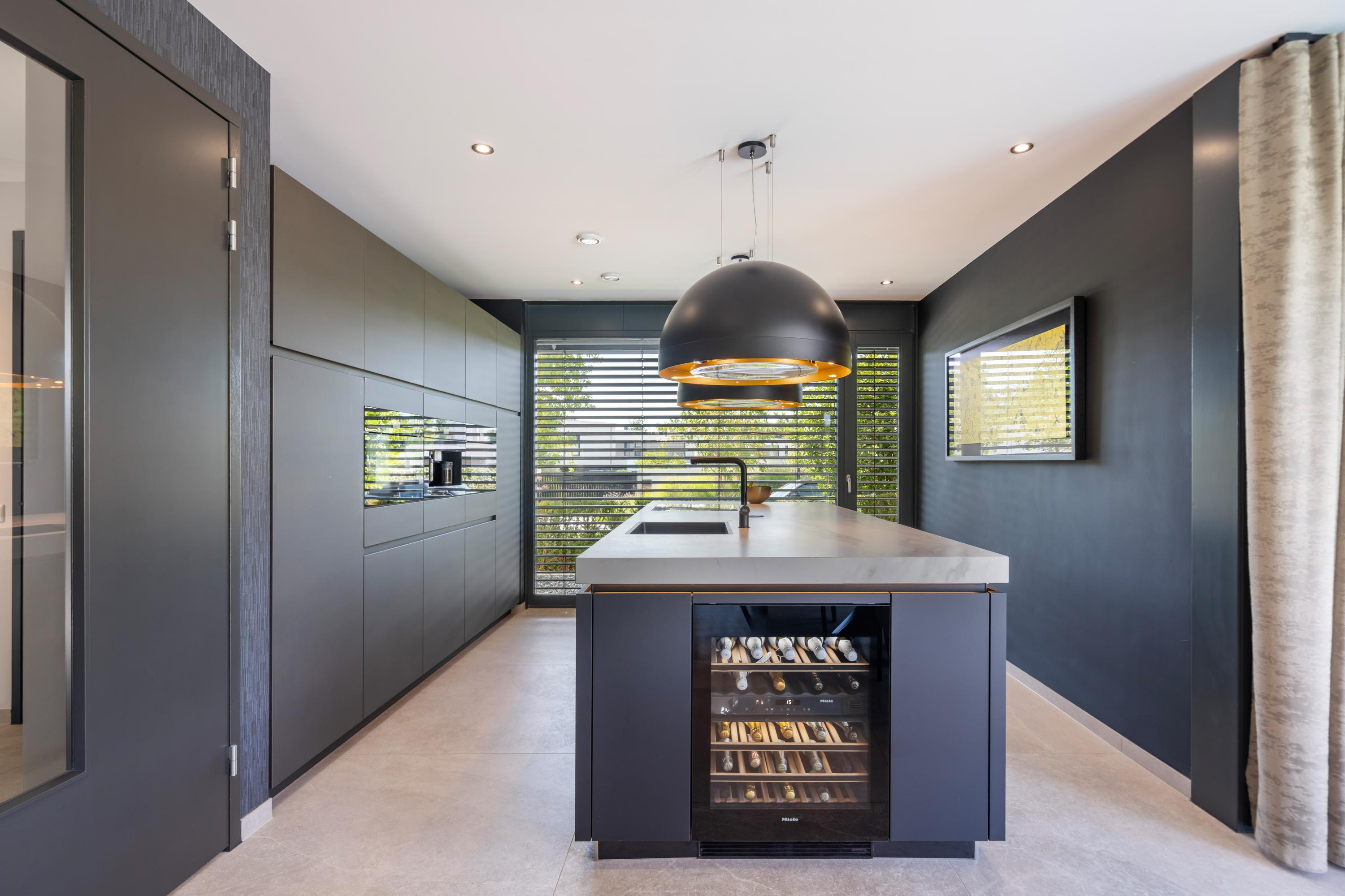 De luxe keuken aan de voorzijde van de woning is voorzien van Miele inbouwapparatuur, onder andere koffieautomaat, heteluchtoven, stoomoven, Bora inductiekookplaat met geïntegreerde afzuiging, vaatwasser, een wijnklimaatkast en diverse opbergkastjes en lades. Vanuit de keuken is goed zicht op de prachtig aangelegde voortuin.