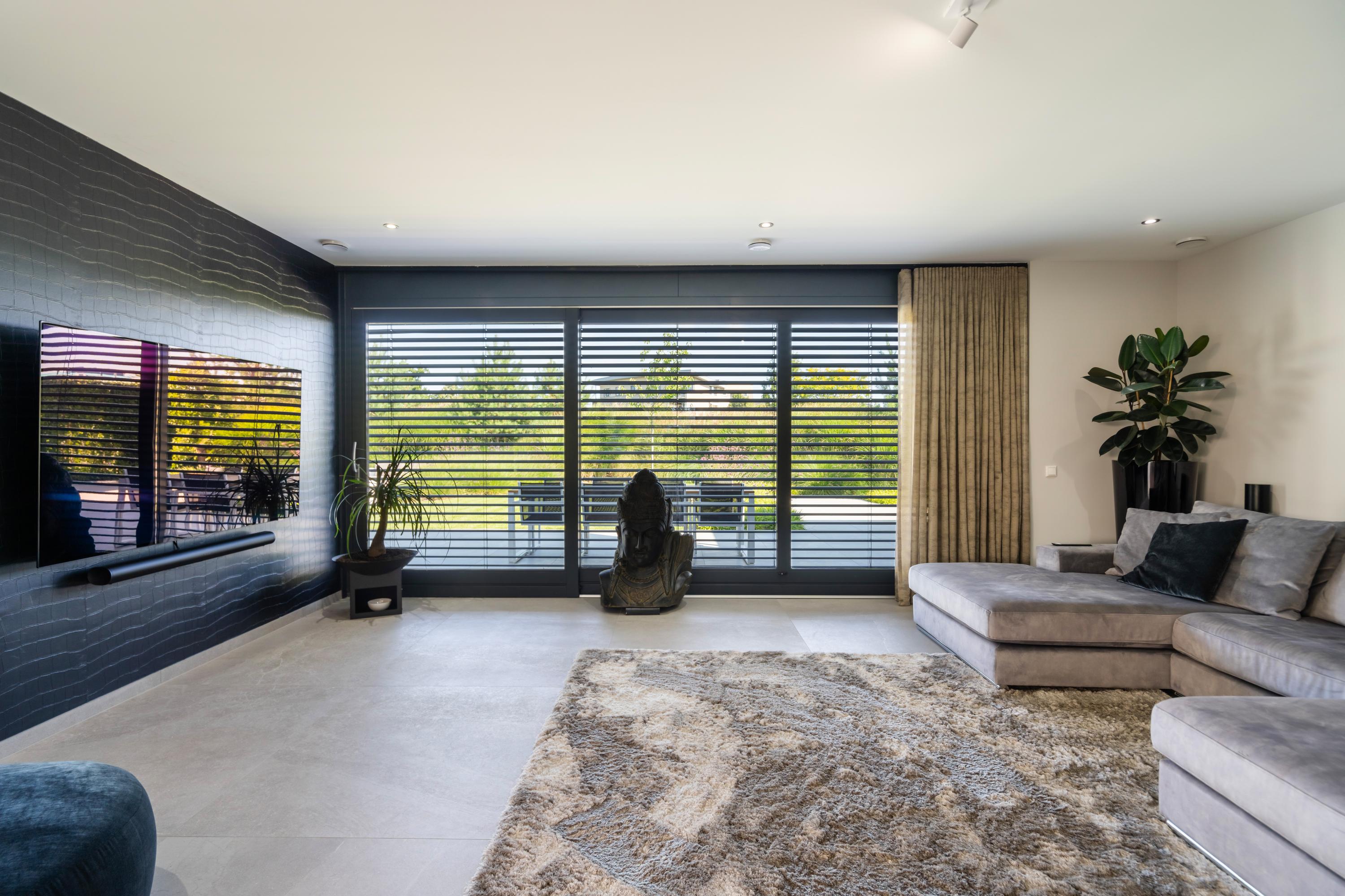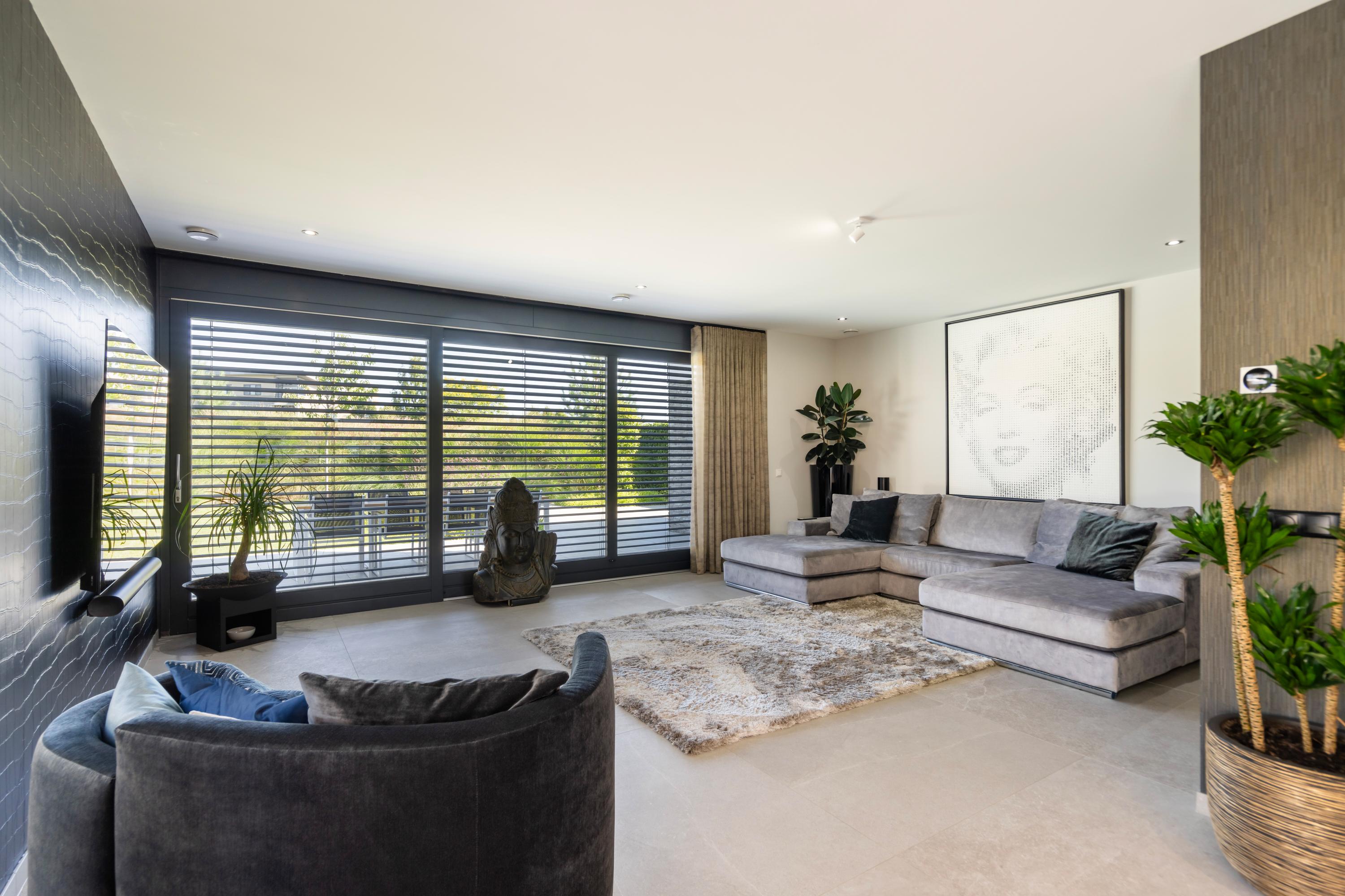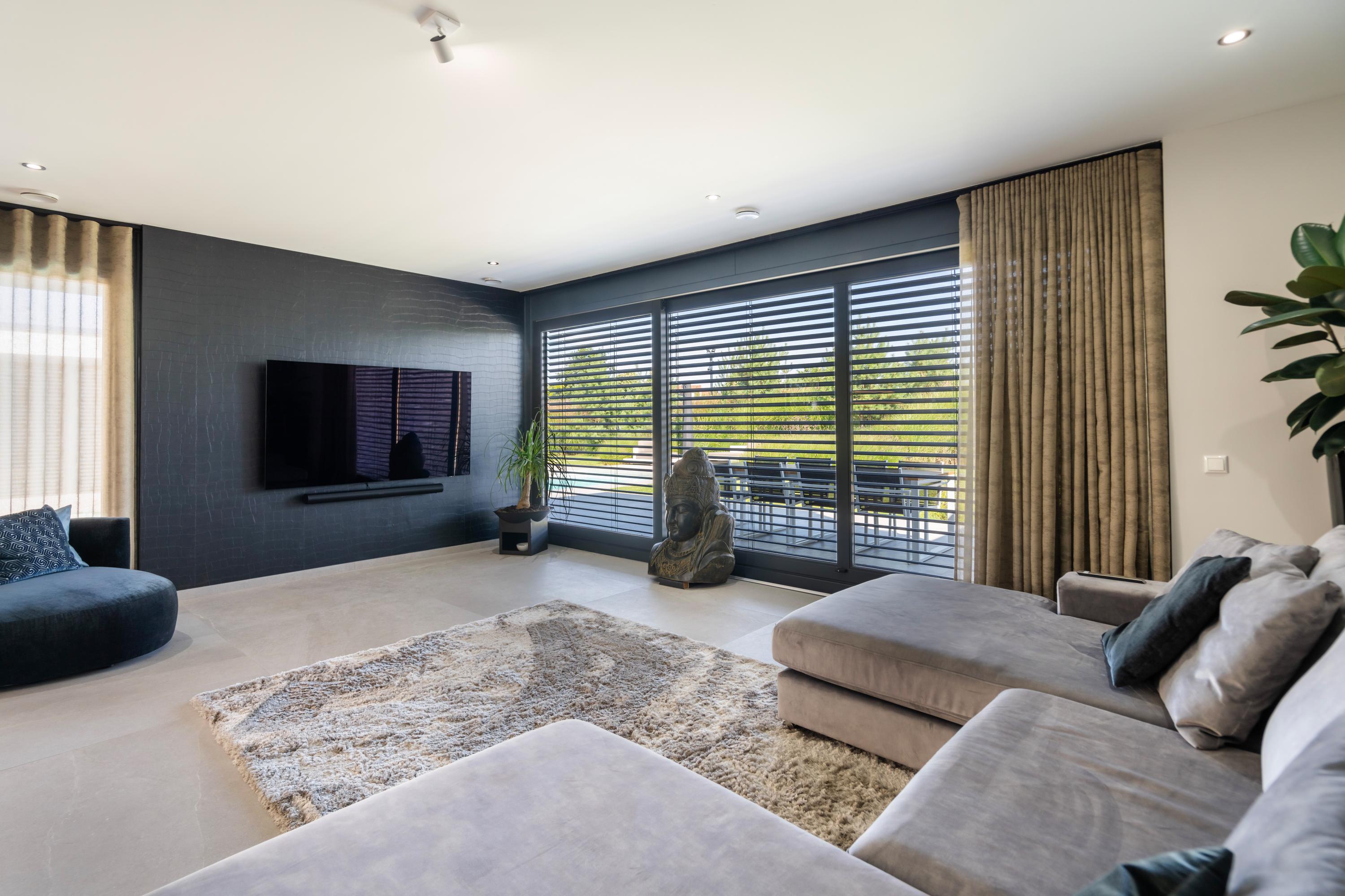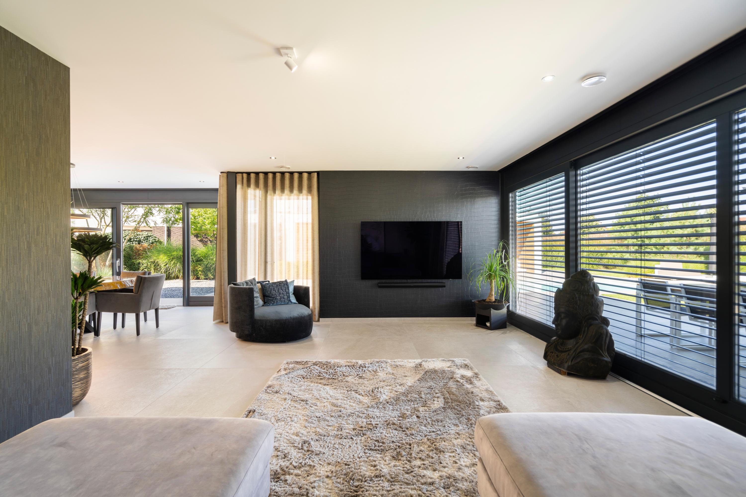 In het woongedeelte valt meteen de ruimte en de grote raampartijen op, welke zorgen voor veel natuurlijk daglicht en veel contact met de omgeving. De grote raampartijen zijn voorzien van elektrisch bedienbare gordijnen.