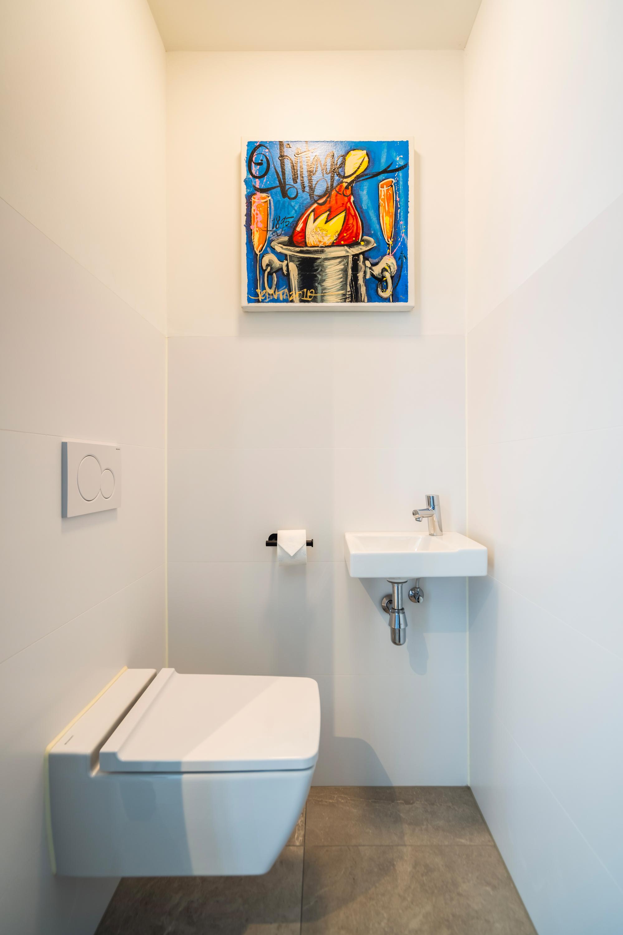 Wanneer we binnenkomen in de hal treffen we de meterkast en een ruim gastentoilet voorzien van fonteintje. Vanuit de royale ontvangsthal toegang tot de verdieping, het woongedeelte en de praktische bijkeuken.