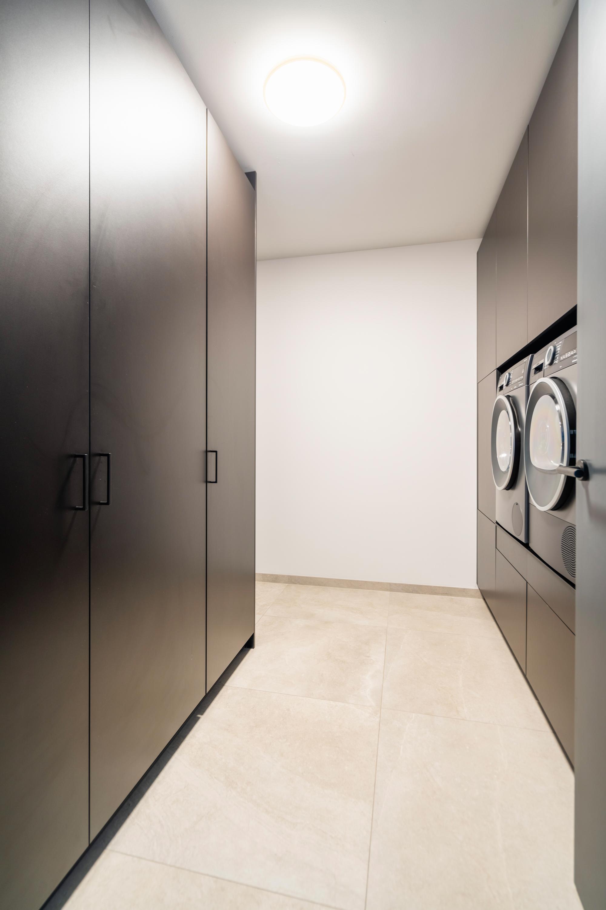 De bijkeuken beschikt over een op maat gemaakte kastenwand. De opstelling is onder andere voorzien van een koelkast, kasten en wasmachineombouw op hoogte. Vanuit de bijkeuken is er toegang tot inpandig bereikbare, royale garage van circa 38 m2. Deze is compleet afgewerkt met gestucte en geschilderde wanden en plafonds, eenzelfde grote tegelvloer met vloerverwarming en -koeling. Door de grootte en afwerking is het mogelijk om naar eigen wens verder in te delen. Wil je een garage met plaats voor een of twee auto('s), een bootje of andere motorvoertuigen? Een thuis atelier? Slaapkamer en badkamer begane grond? Thuiswerkplek of speelkamer voor de kinderen? Alles is hier mogelijk!