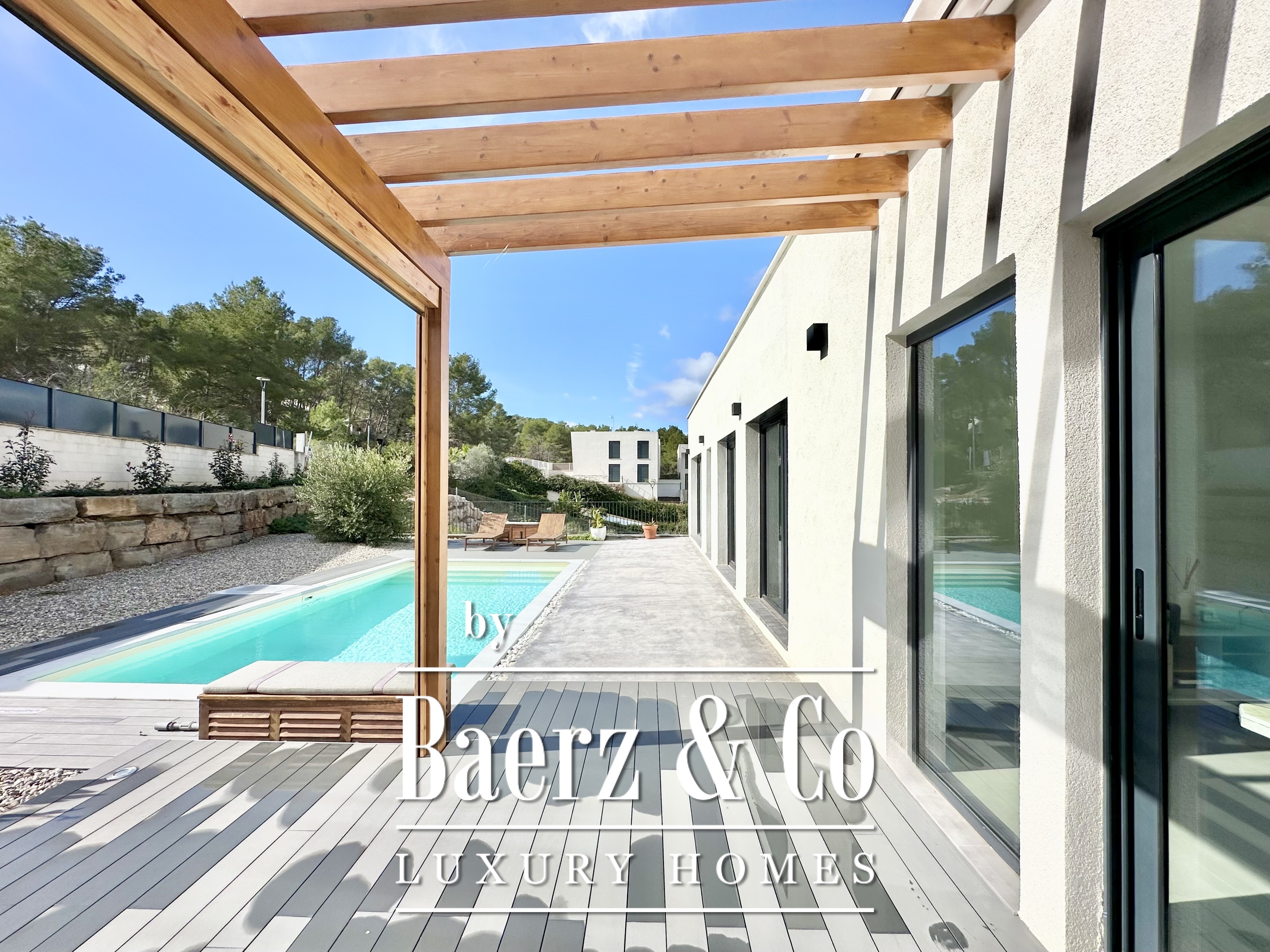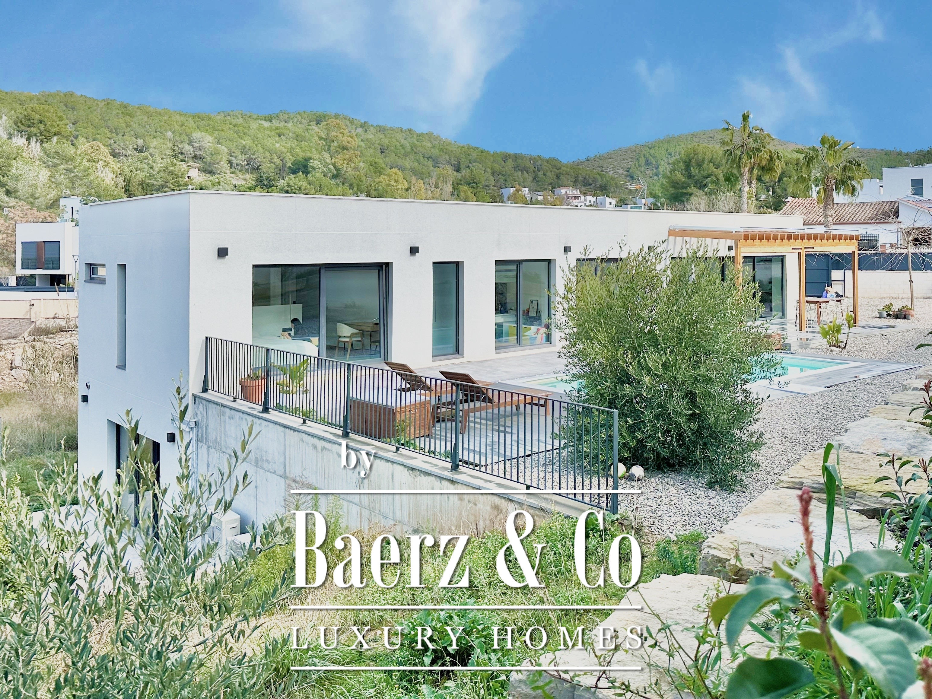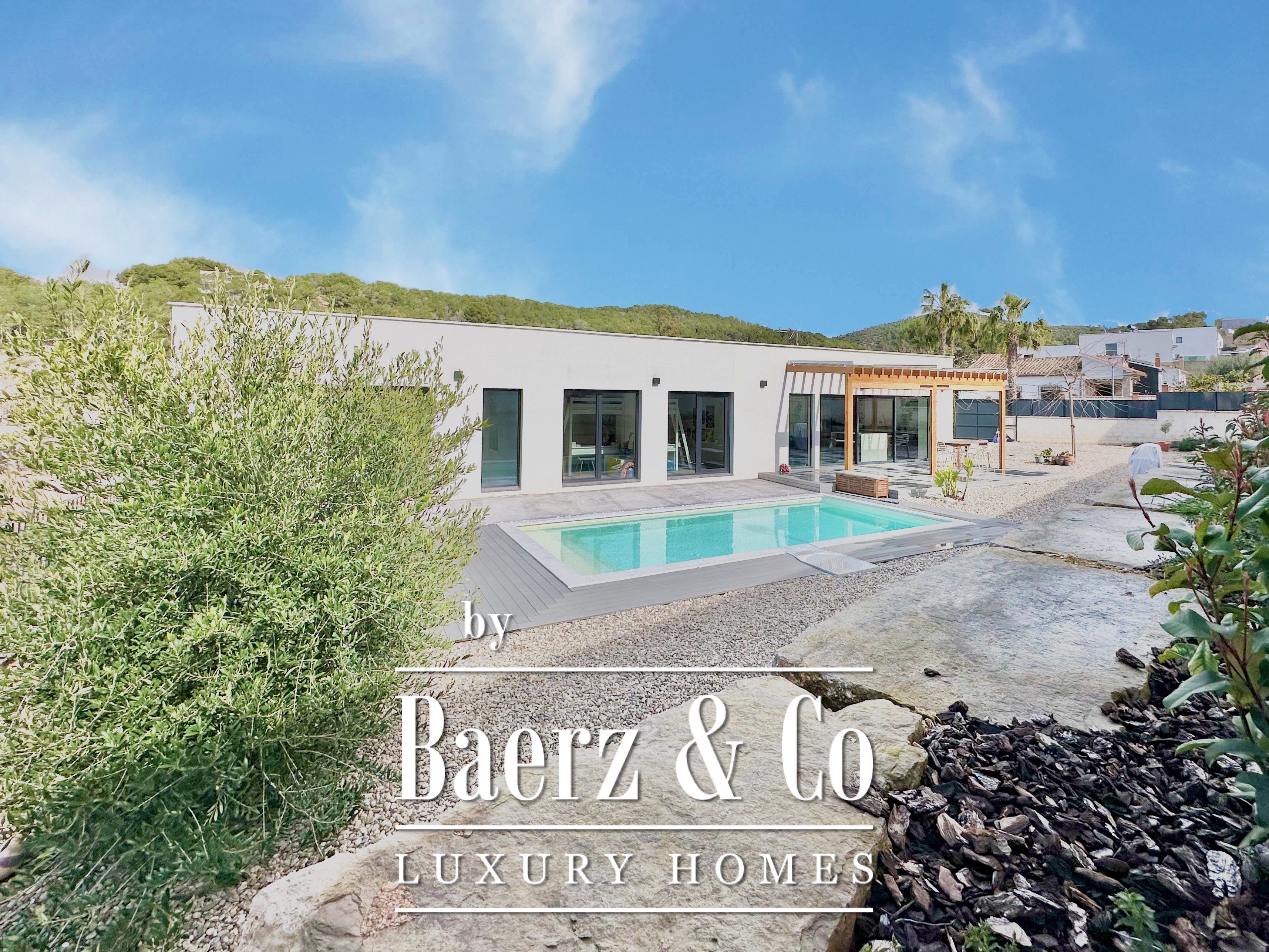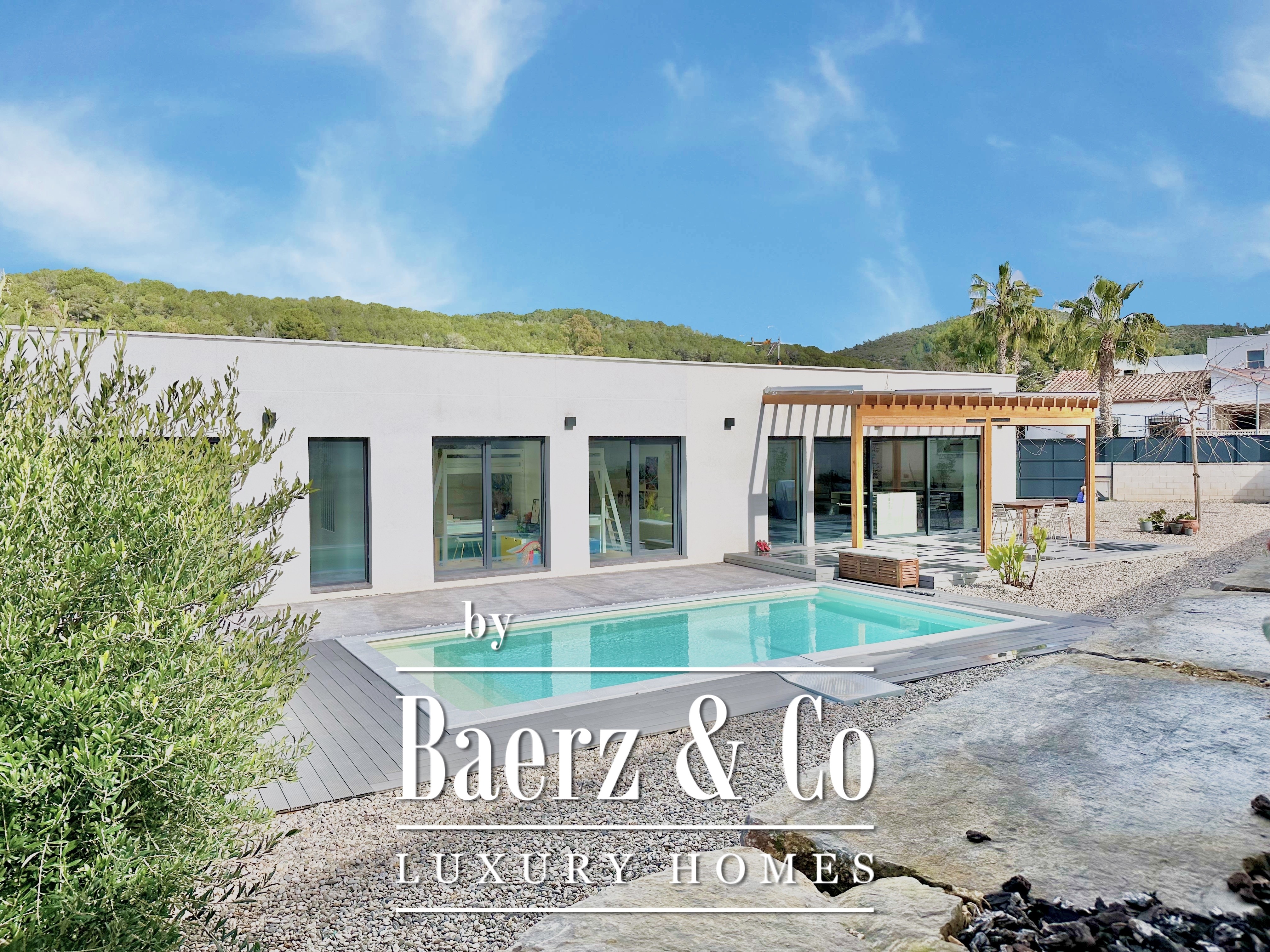 Deze moderne villa in Sitges is een recent gerealiseerde, energiezuinige woning waar duurzaamheid en eigentijdse minimalistische architectuur centraal staan. Gelegen in het rustige Mas Alba, beslaat het perceel 860 m² (dubbele kavel) met 296 m² woonoppervlakte, aangevuld door een privézwembad van 32 m² en uitzicht op de bergen.