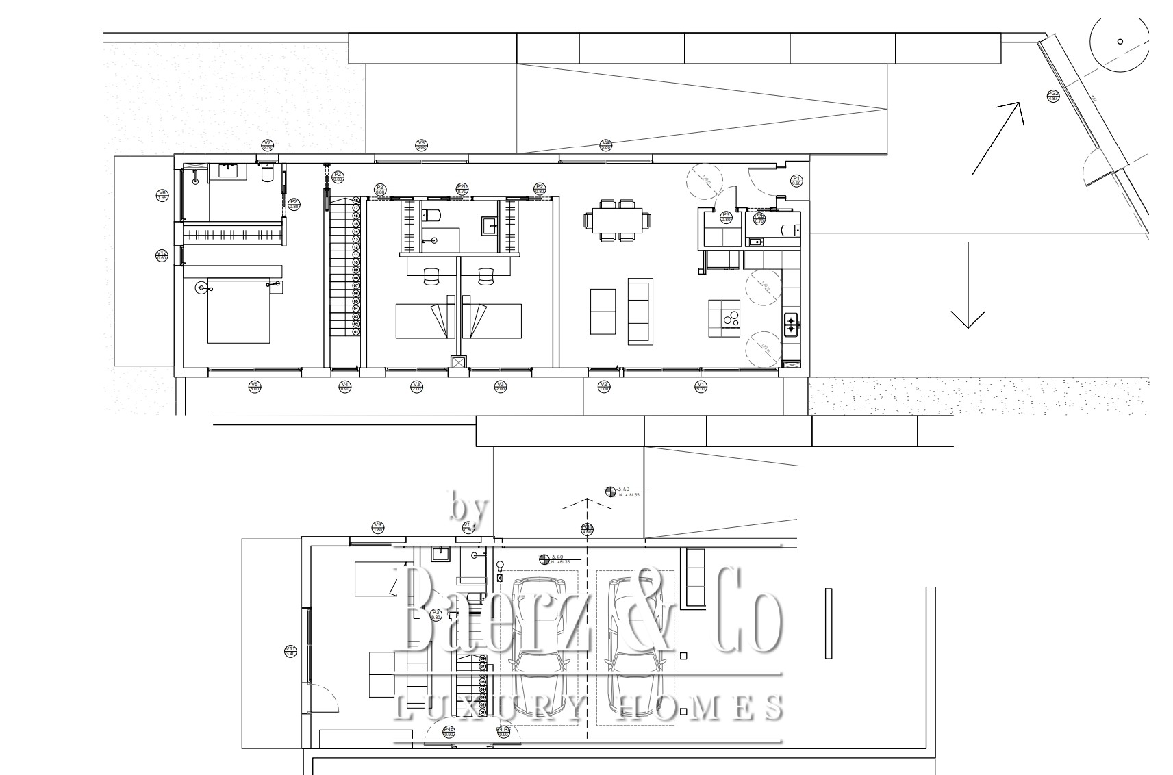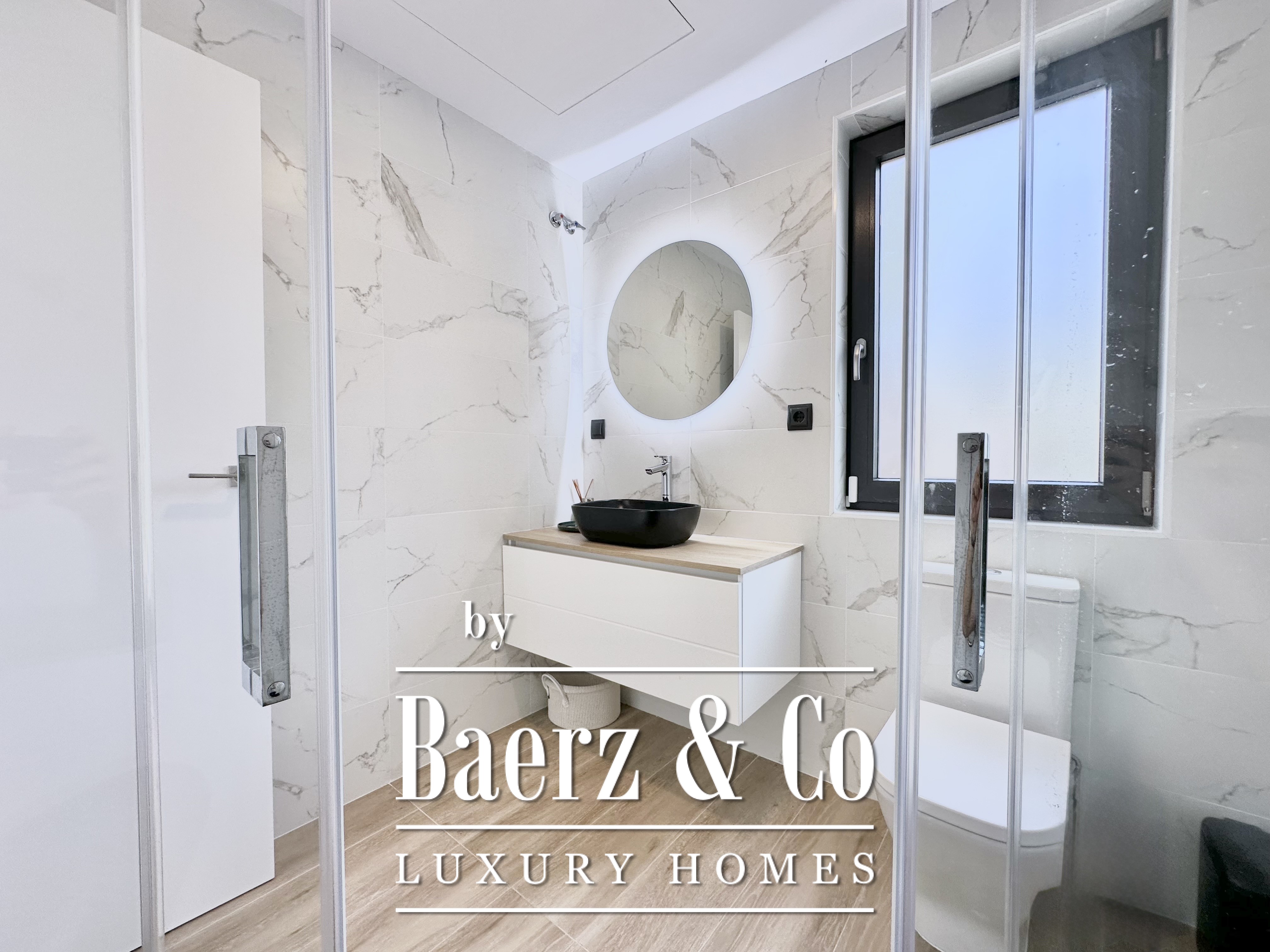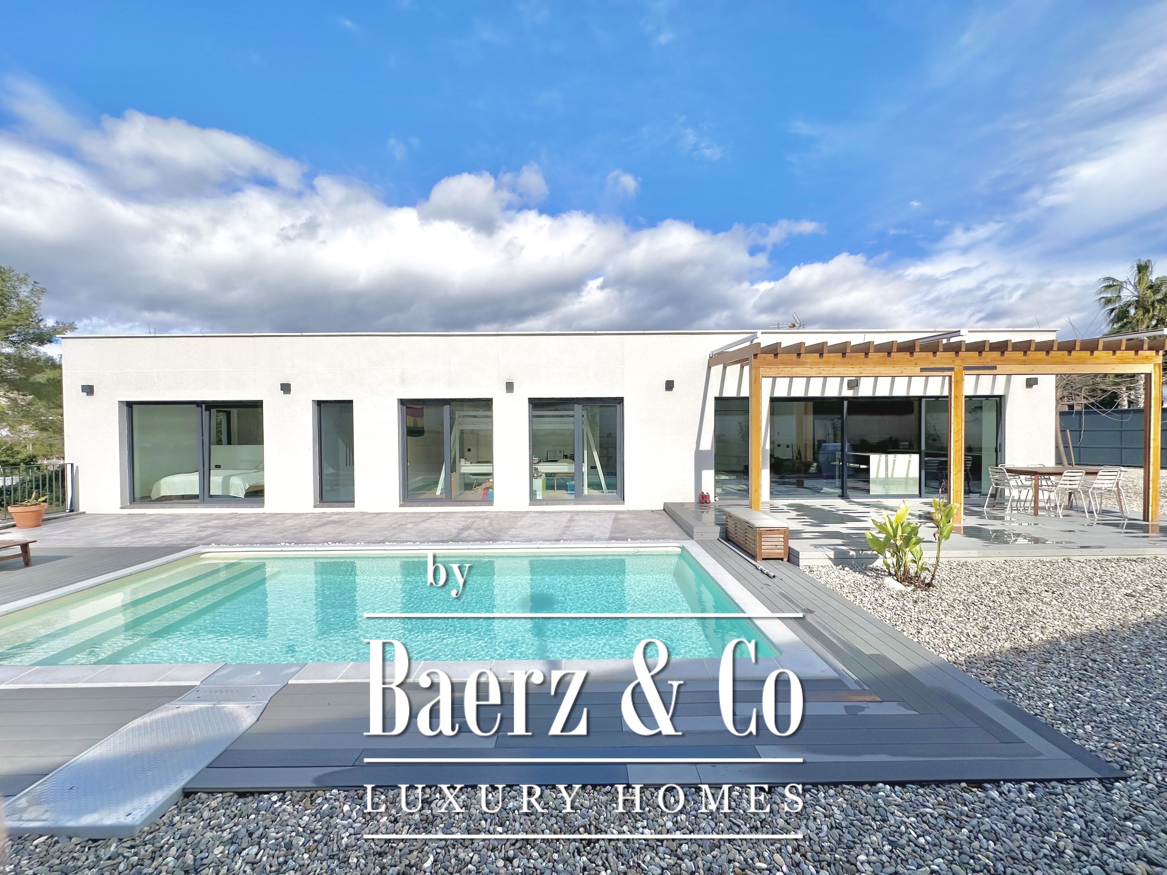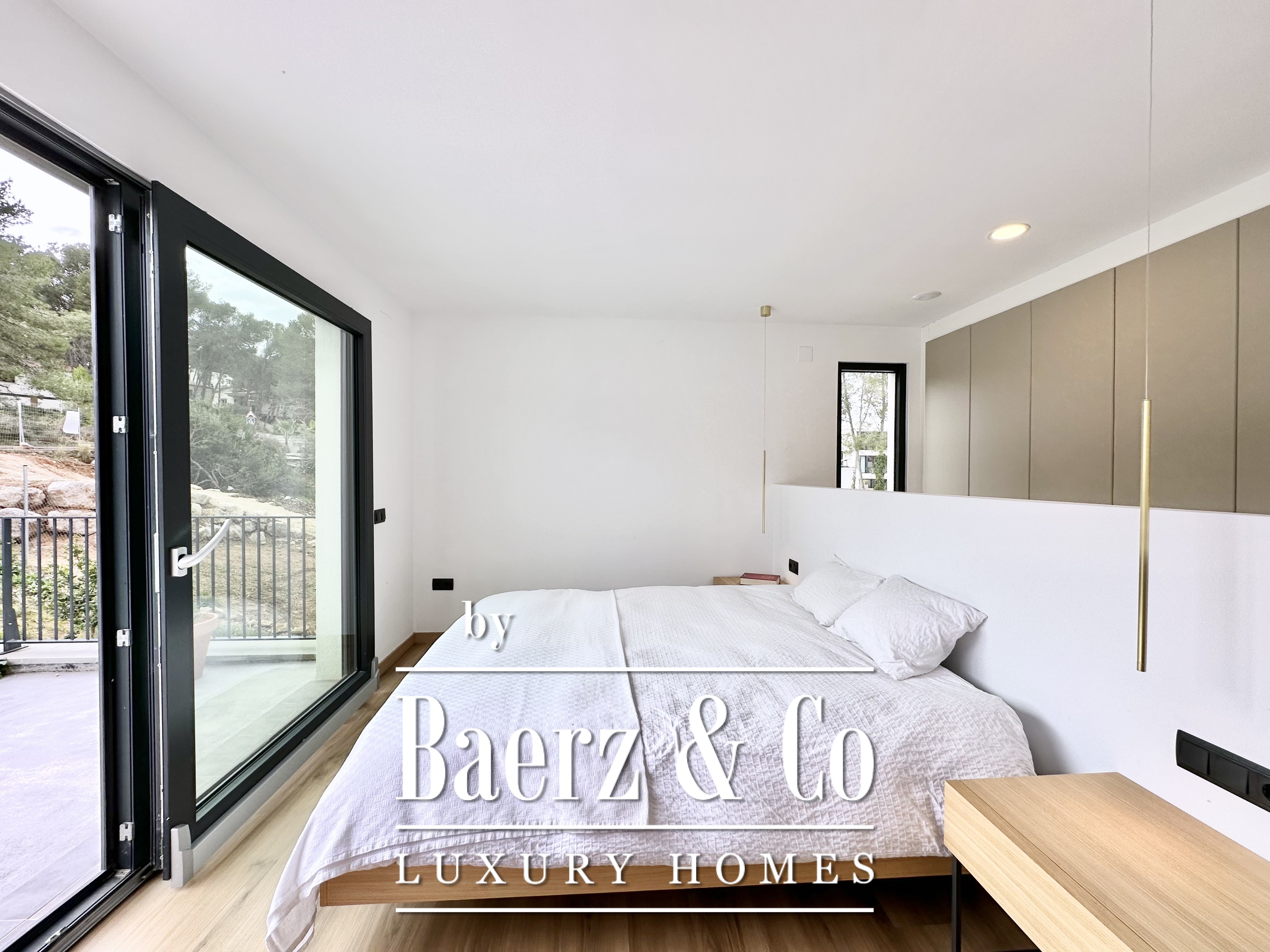 De villa werd in 2023 gebouwd volgens de strenge Passivhaus-normen en behaalt energielabel A. Er is een aerothermisch systeem, zonnepanelen, hoogwaardige muurisolatie met een thermische transmissie van 0,12 W/m²K, evenals dubbele beglazing met argonvulling en volledige verduistering in elke ruimte. Dit resulteert in het hele jaar door thermisch comfort, fluisterstil binnenklimaat en uitzonderlijk laag energieverbruik.