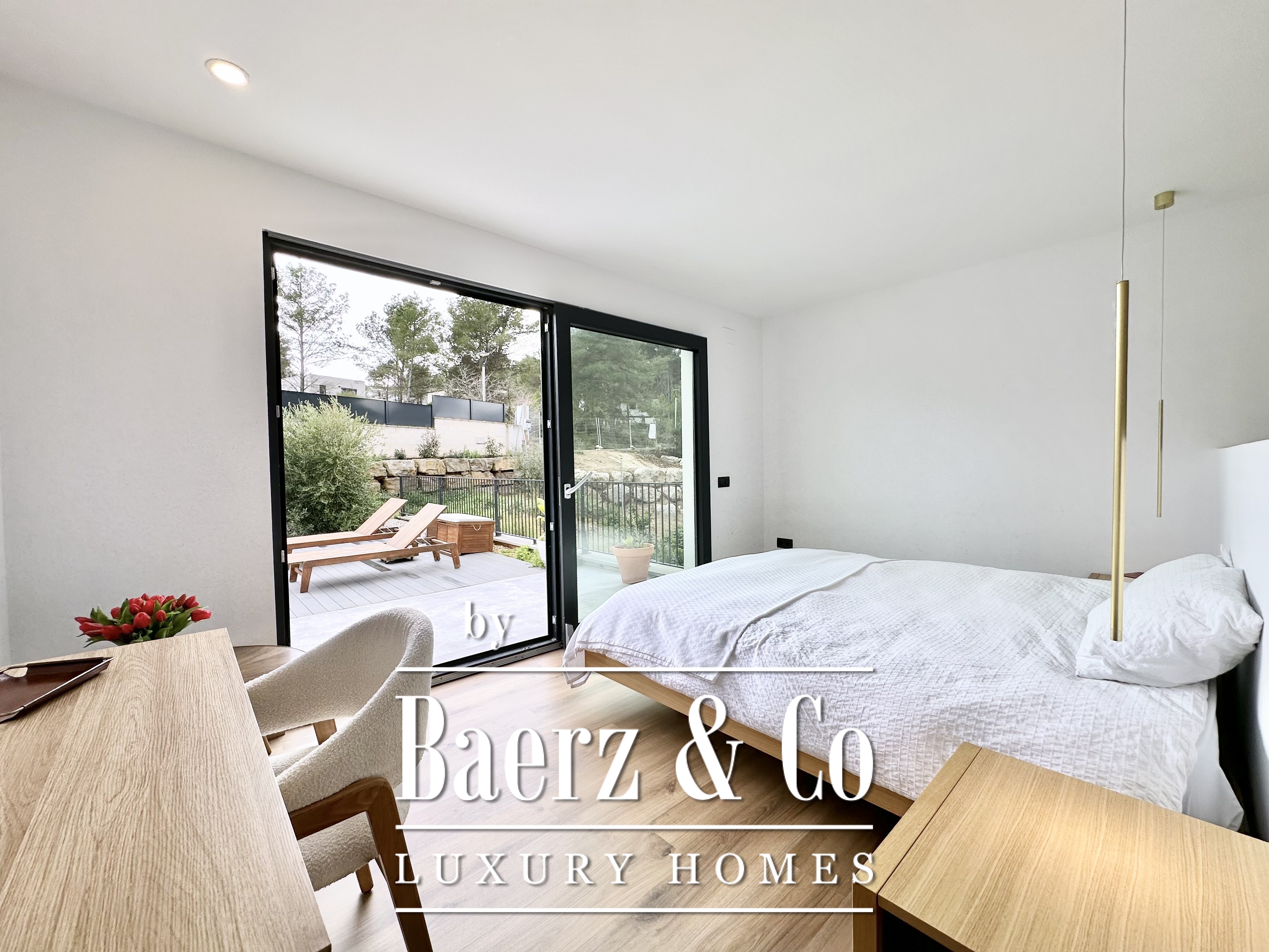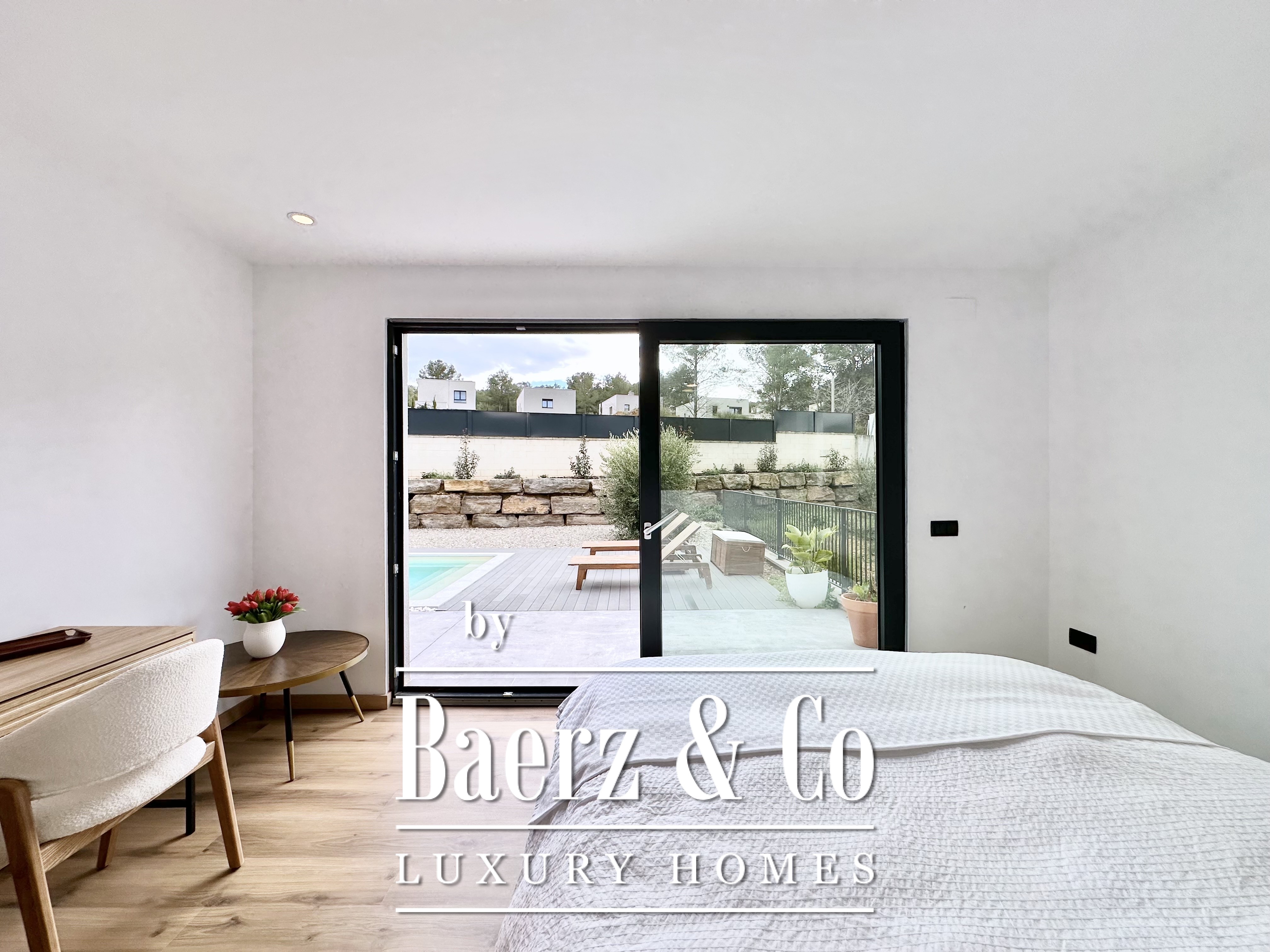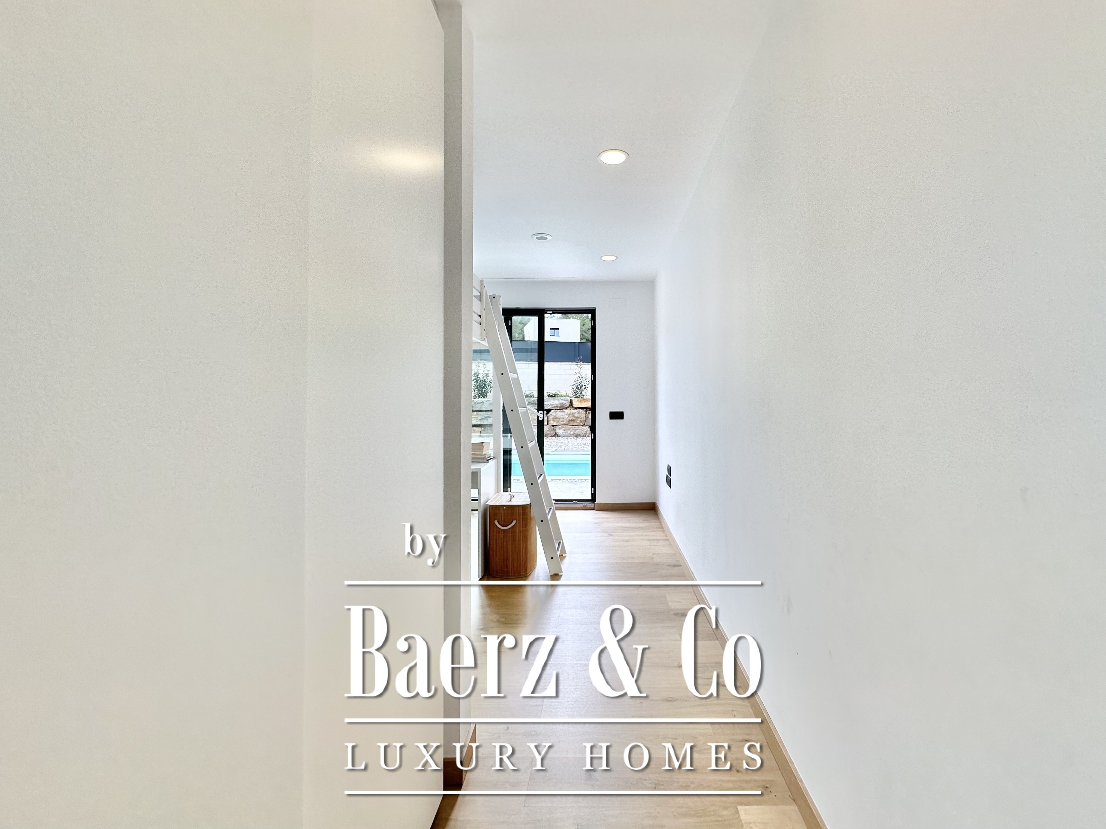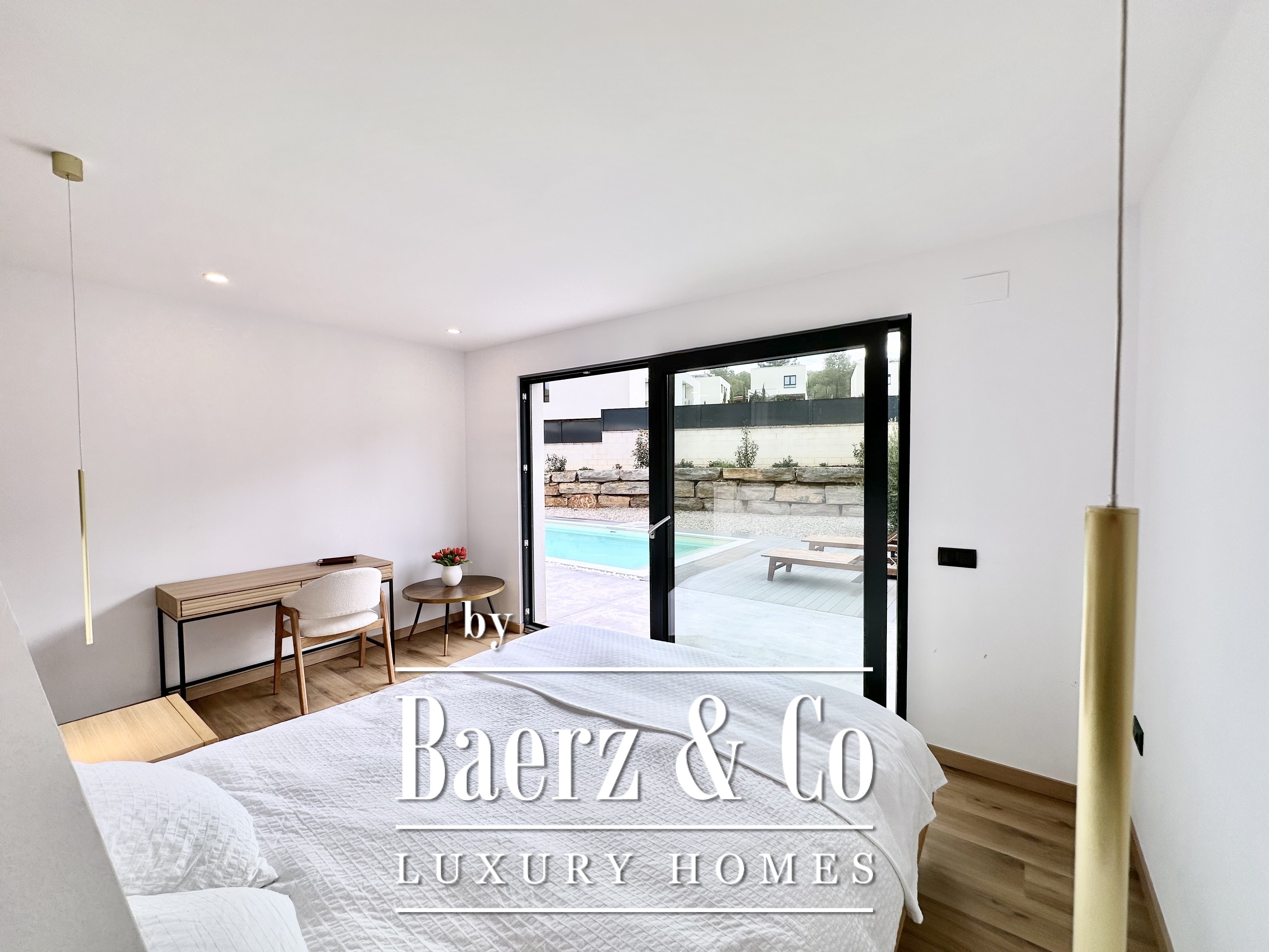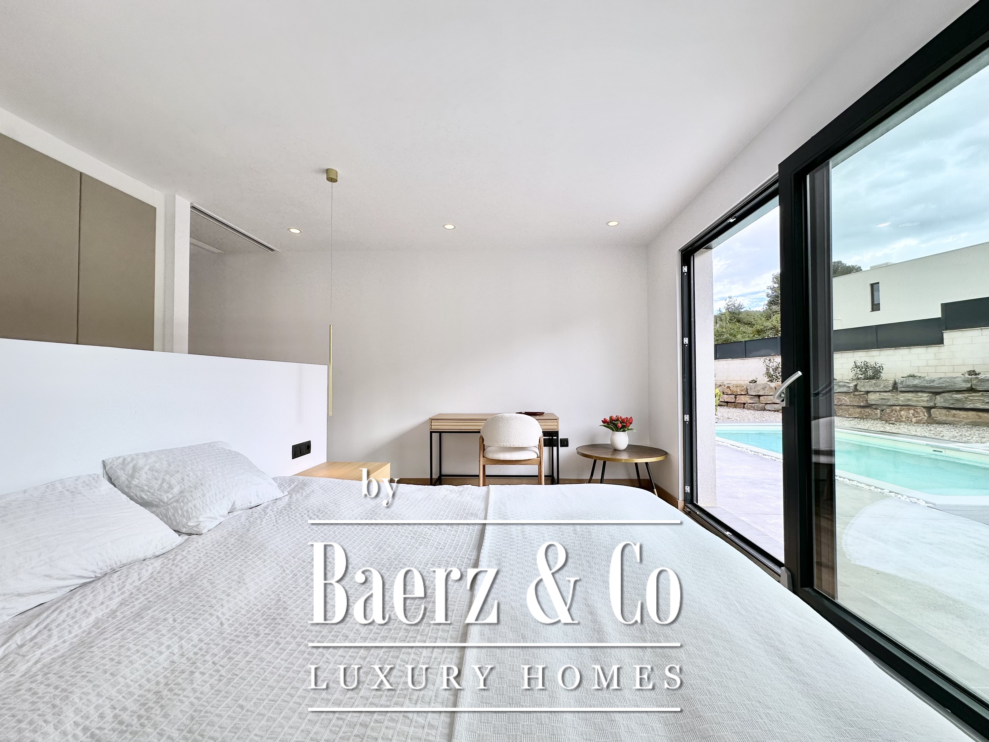 De opzet is bewust open en licht gehouden. De royale woon- en eetkamer opent met vloeiend schuivende glazen deuren van vloer tot plafond naar de tuin en het zwembad, waardoor binnen en buiten naadloos in elkaar overlopen. De moderne, volledig uitgeruste keuken combineert functionaliteit met esthetische helderheid. Er zijn vier slaapkamers, waarvan twee met eigen badkamer, die flexibele mogelijkheden bieden. Op de begane grond delen twee tweepersoonskamers een complete badkamer en geven direct toegang tot het zwembad, terwijl de master suite beschikt over een eigen kleedruimte en privébadkamer met uitzicht op de tuin. Op het souterrain bevindt zich een gastensuite en twee ruime multifunctionele kamers, geschikt voor ontspanning, fitness of werk. Tevens is er plaats voor twee auto's.