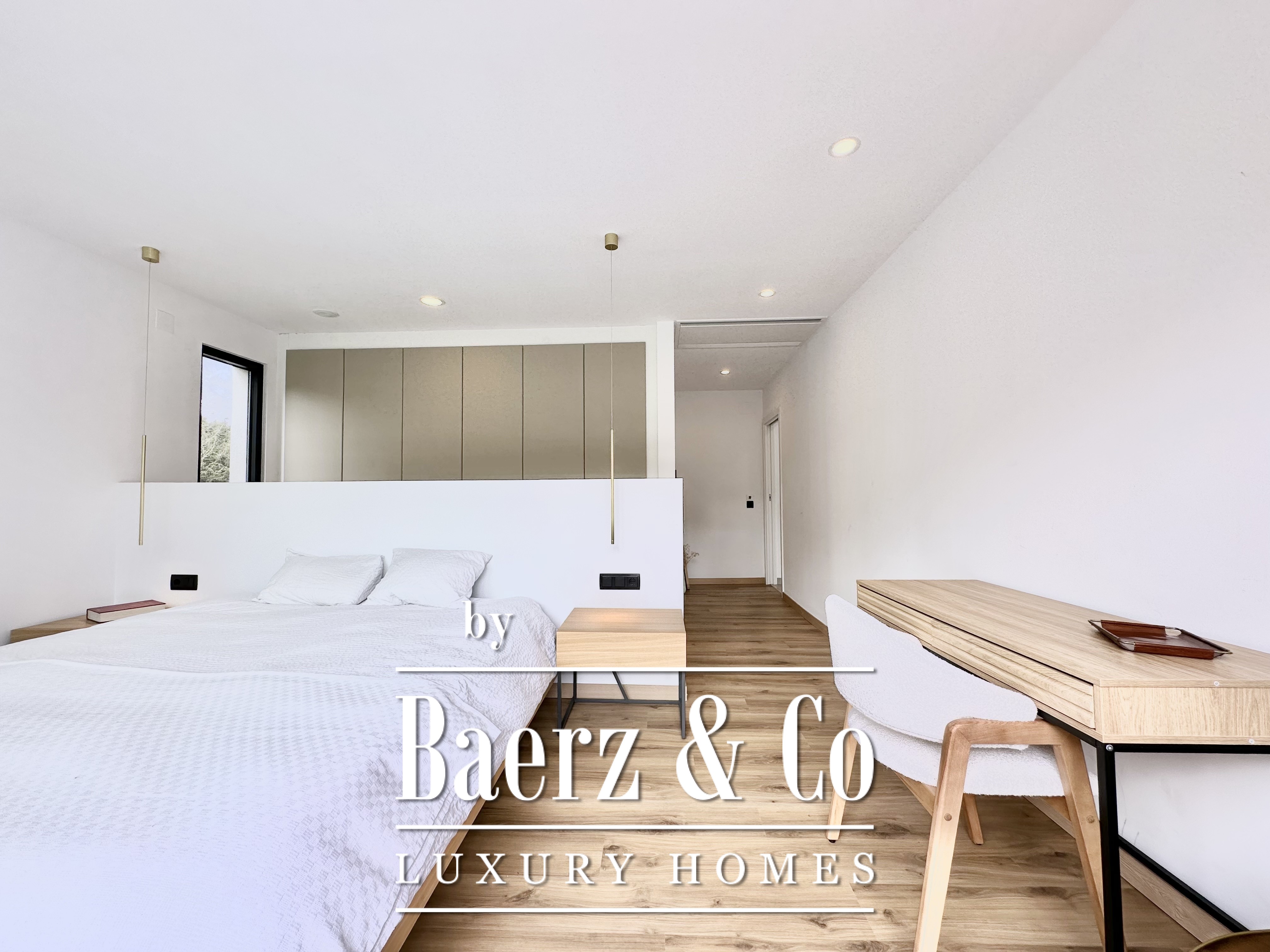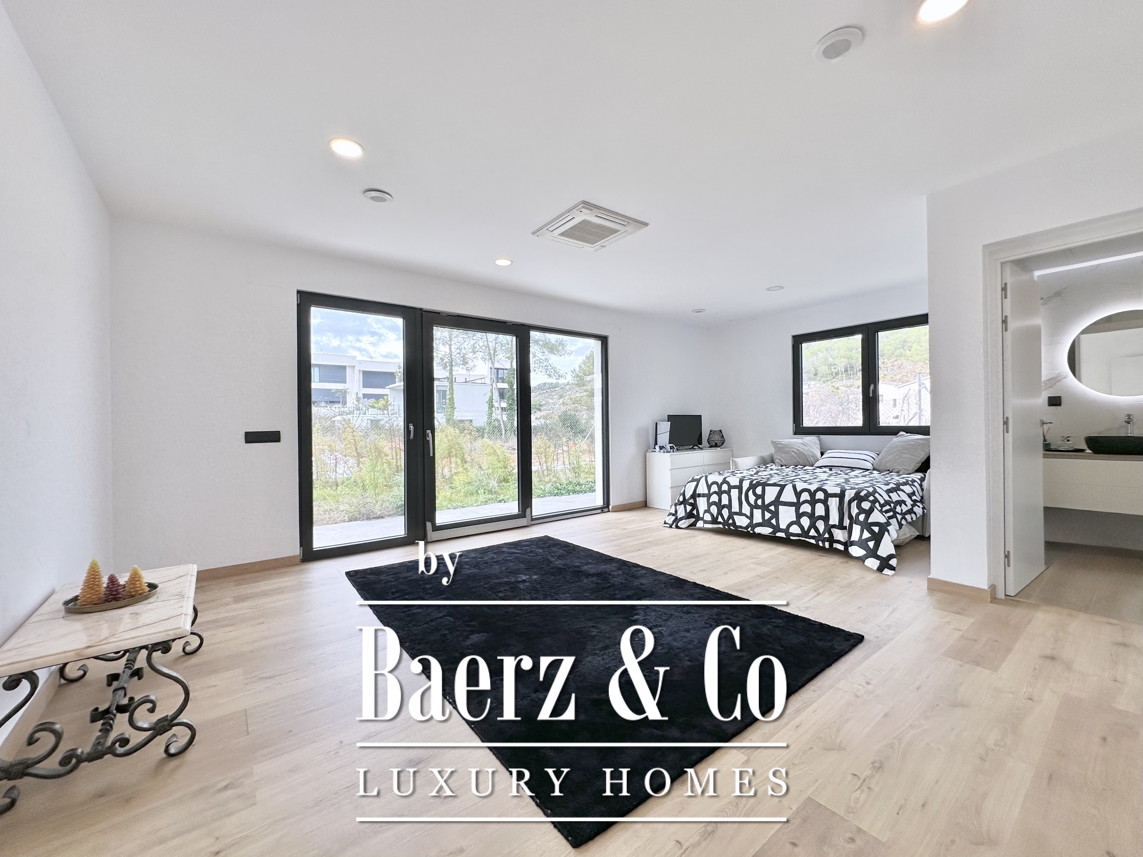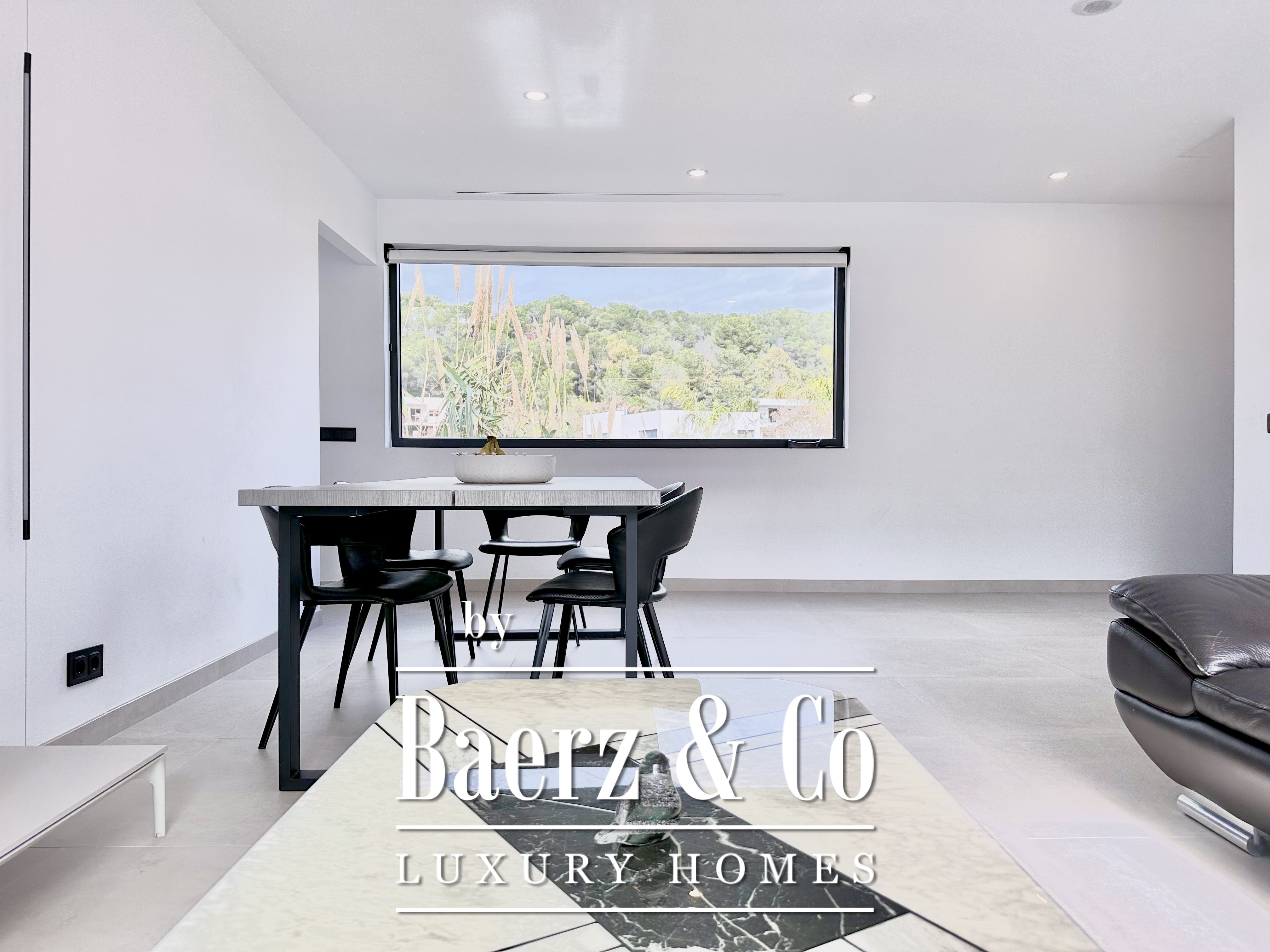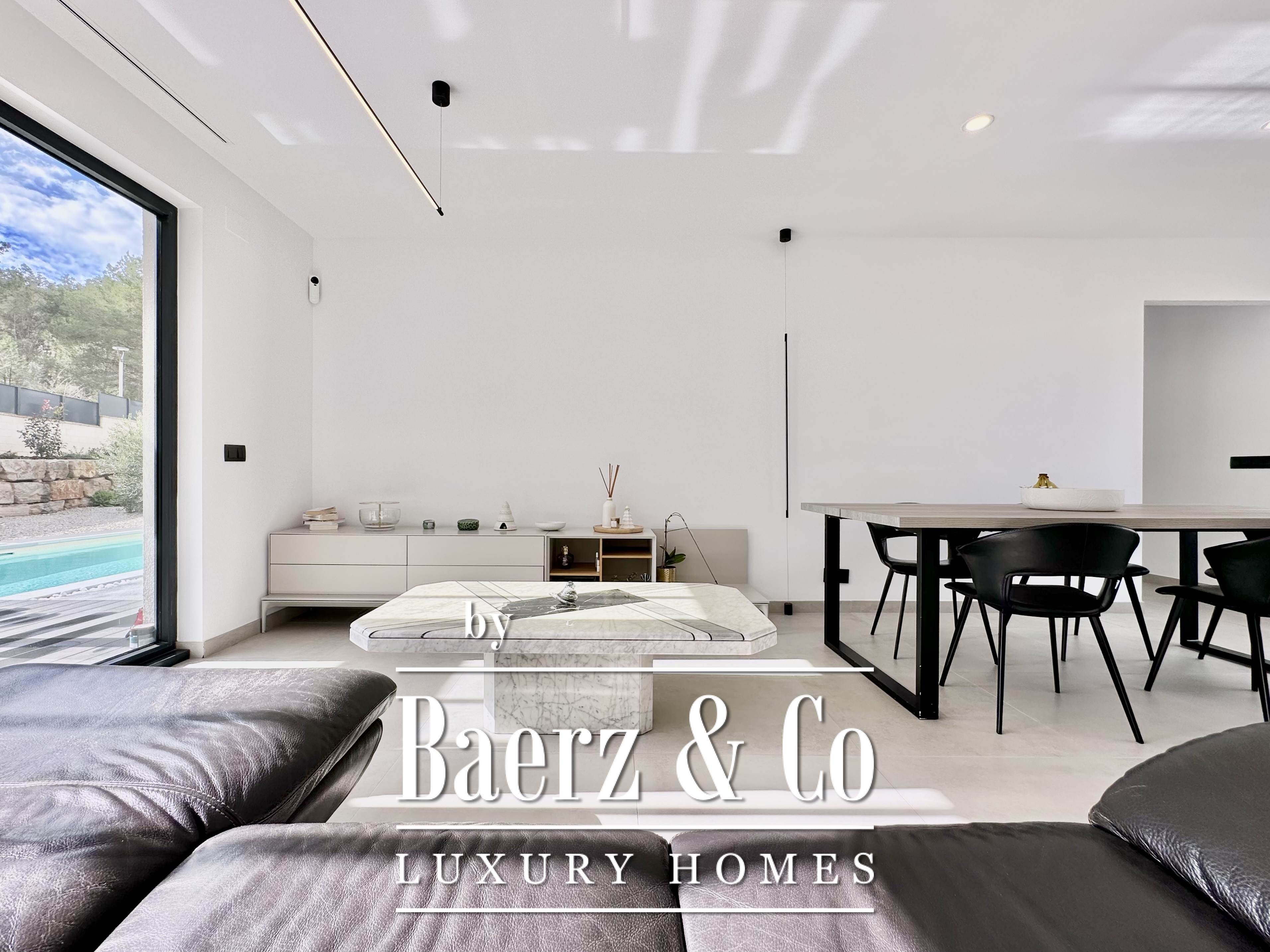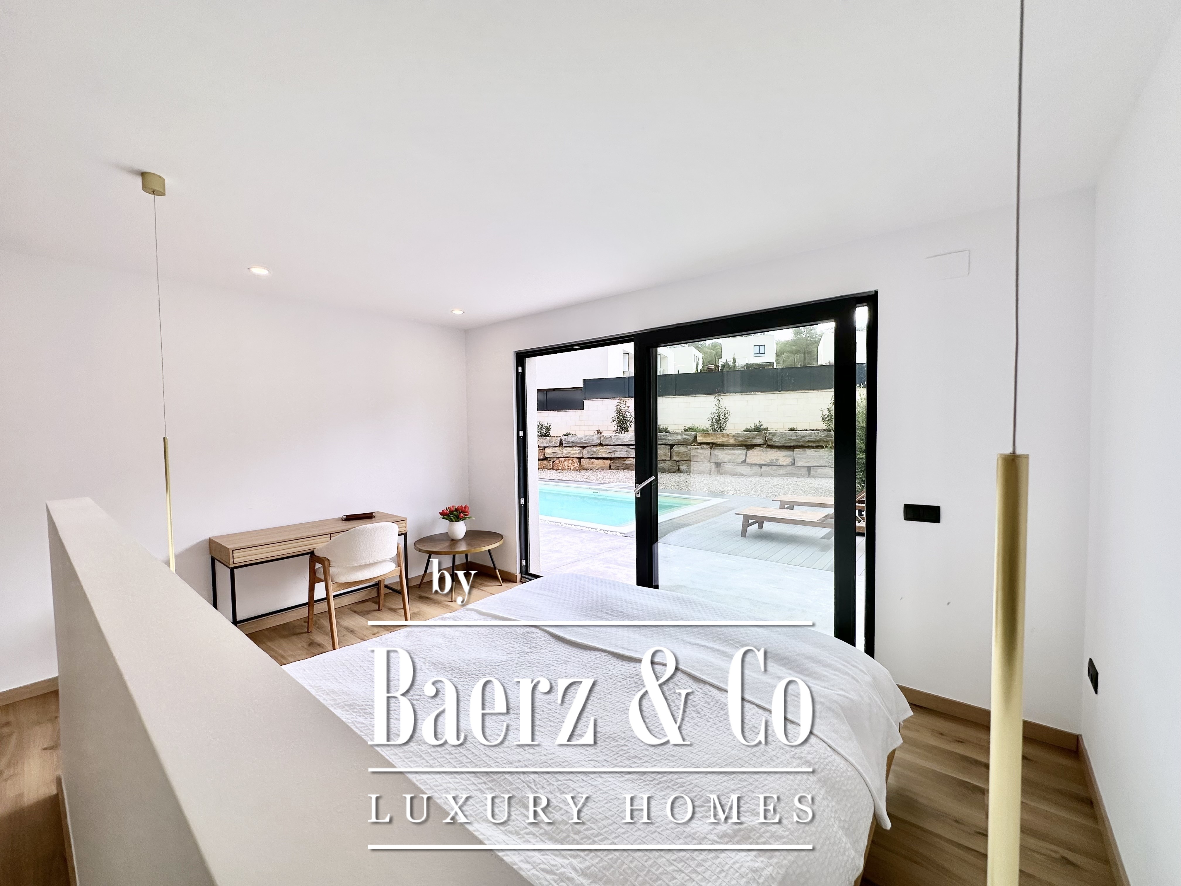 De opzet is bewust open en licht gehouden. De royale woon- en eetkamer opent met vloeiend schuivende glazen deuren van vloer tot plafond naar de tuin en het zwembad, waardoor binnen en buiten naadloos in elkaar overlopen. De moderne, volledig uitgeruste keuken combineert functionaliteit met esthetische helderheid. Er zijn vier slaapkamers, waarvan twee met eigen badkamer, die flexibele mogelijkheden bieden. Op de begane grond delen twee tweepersoonskamers een complete badkamer en geven direct toegang tot het zwembad, terwijl de master suite beschikt over een eigen kleedruimte en privébadkamer met uitzicht op de tuin. Op het souterrain bevindt zich een gastensuite en twee ruime multifunctionele kamers, geschikt voor ontspanning, fitness of werk. Tevens is er plaats voor twee auto's.
