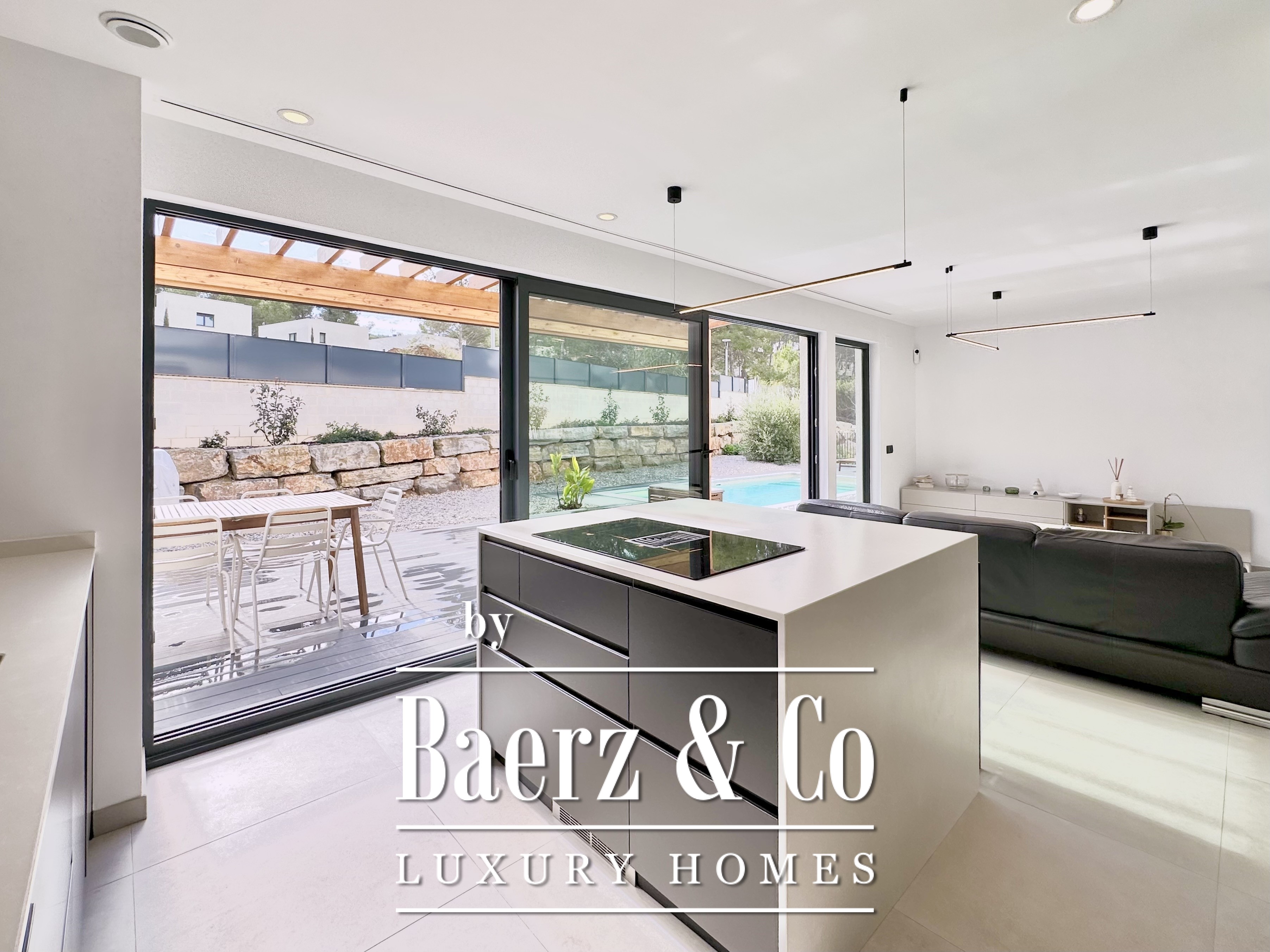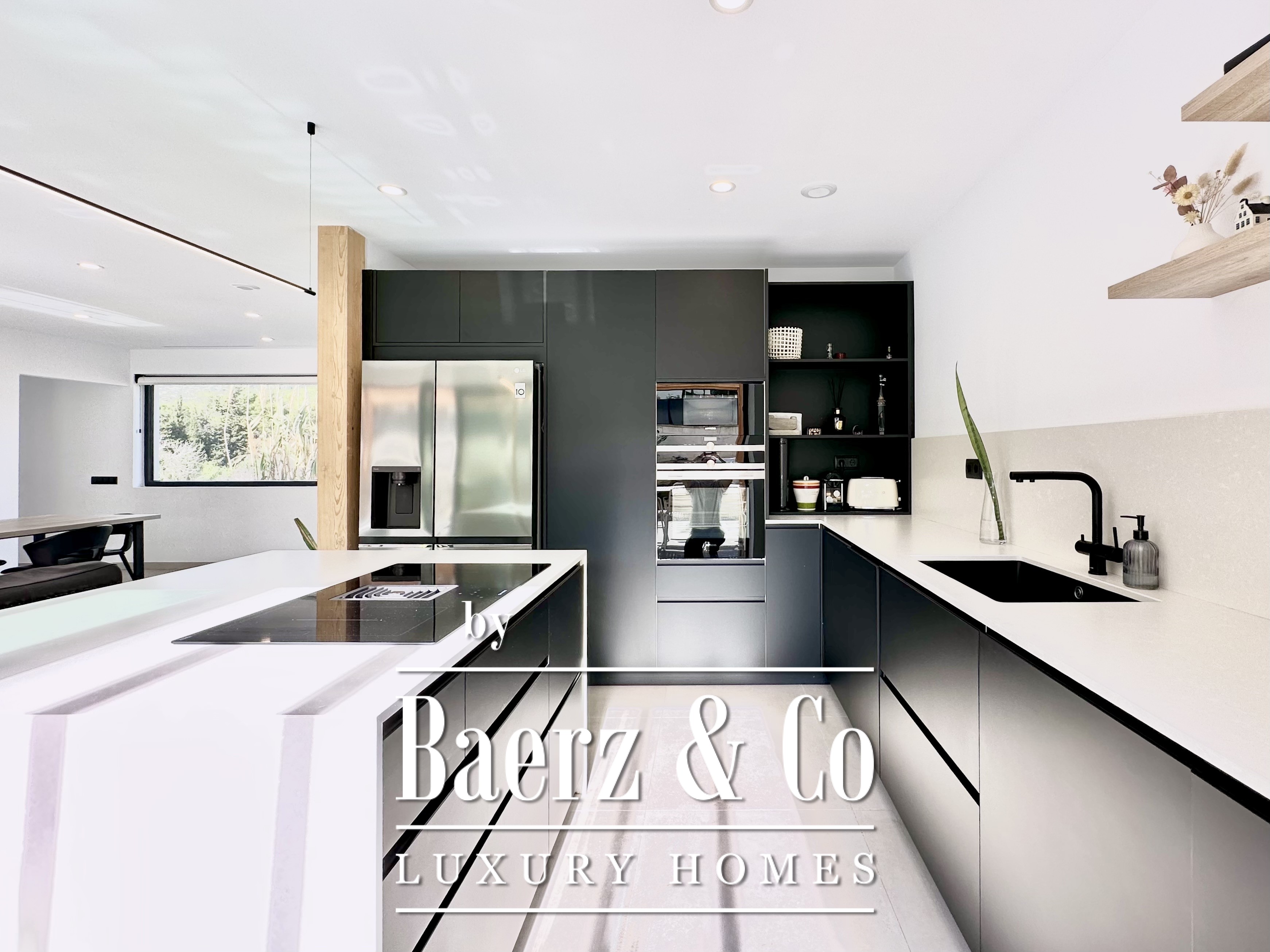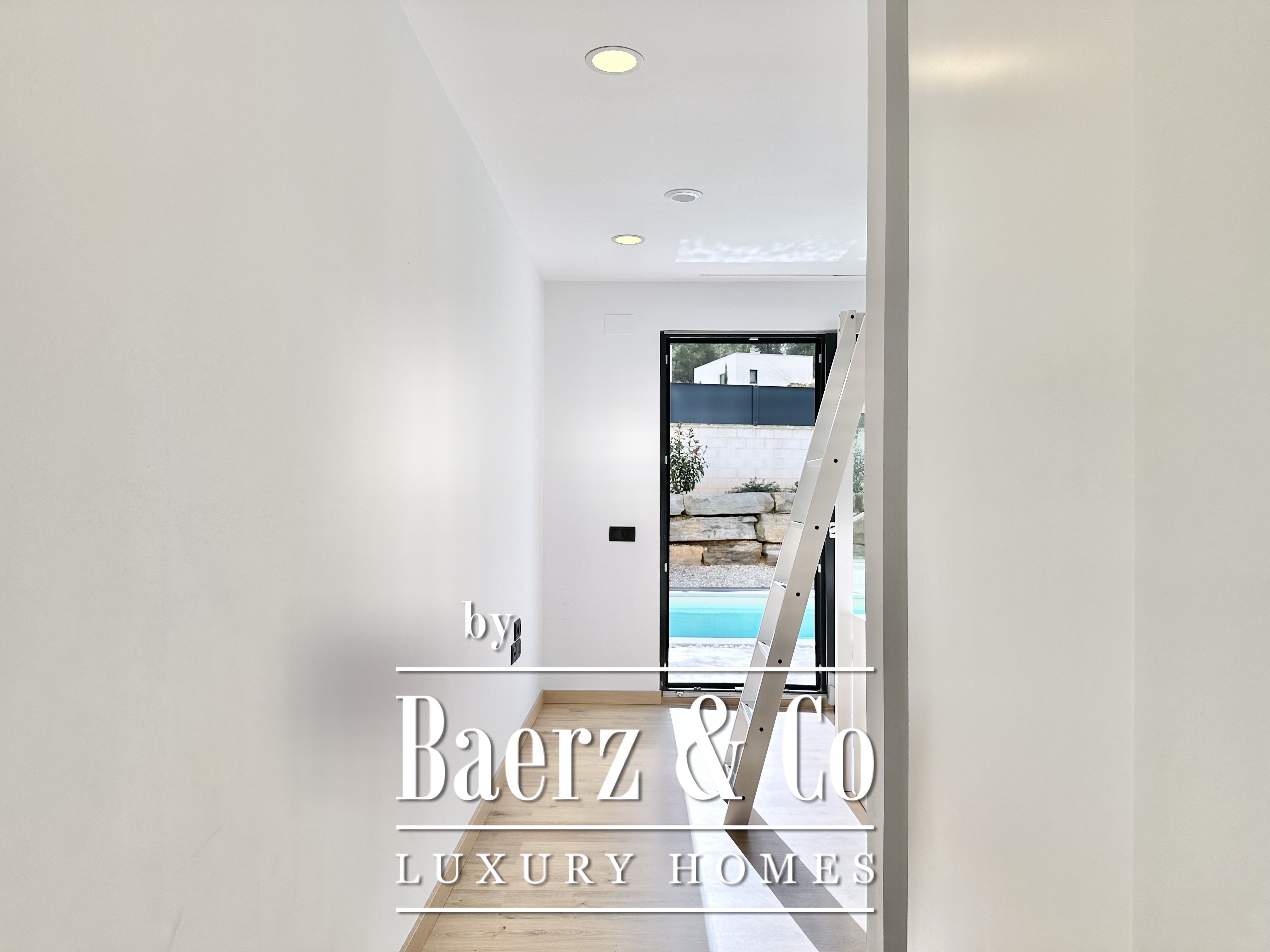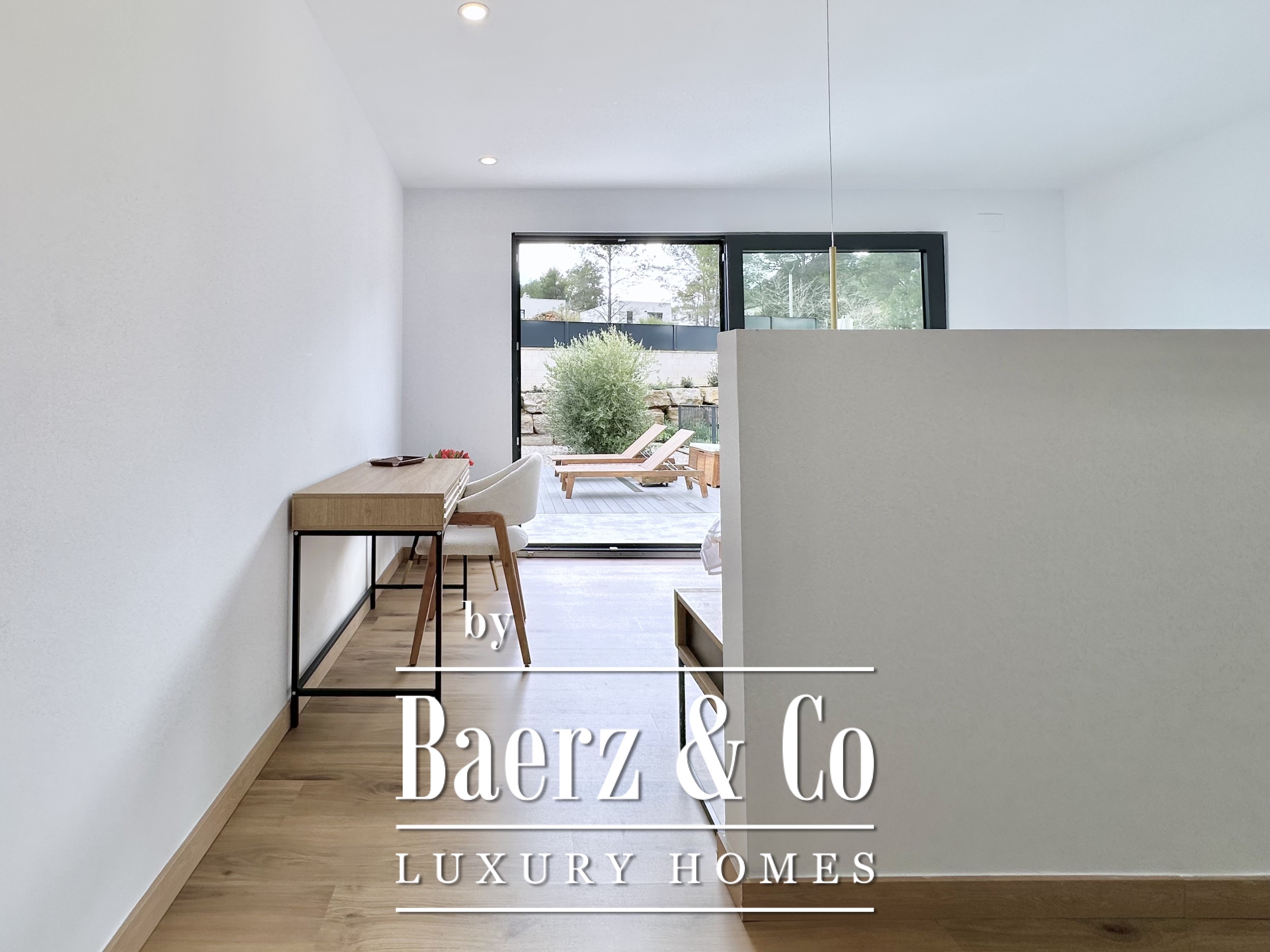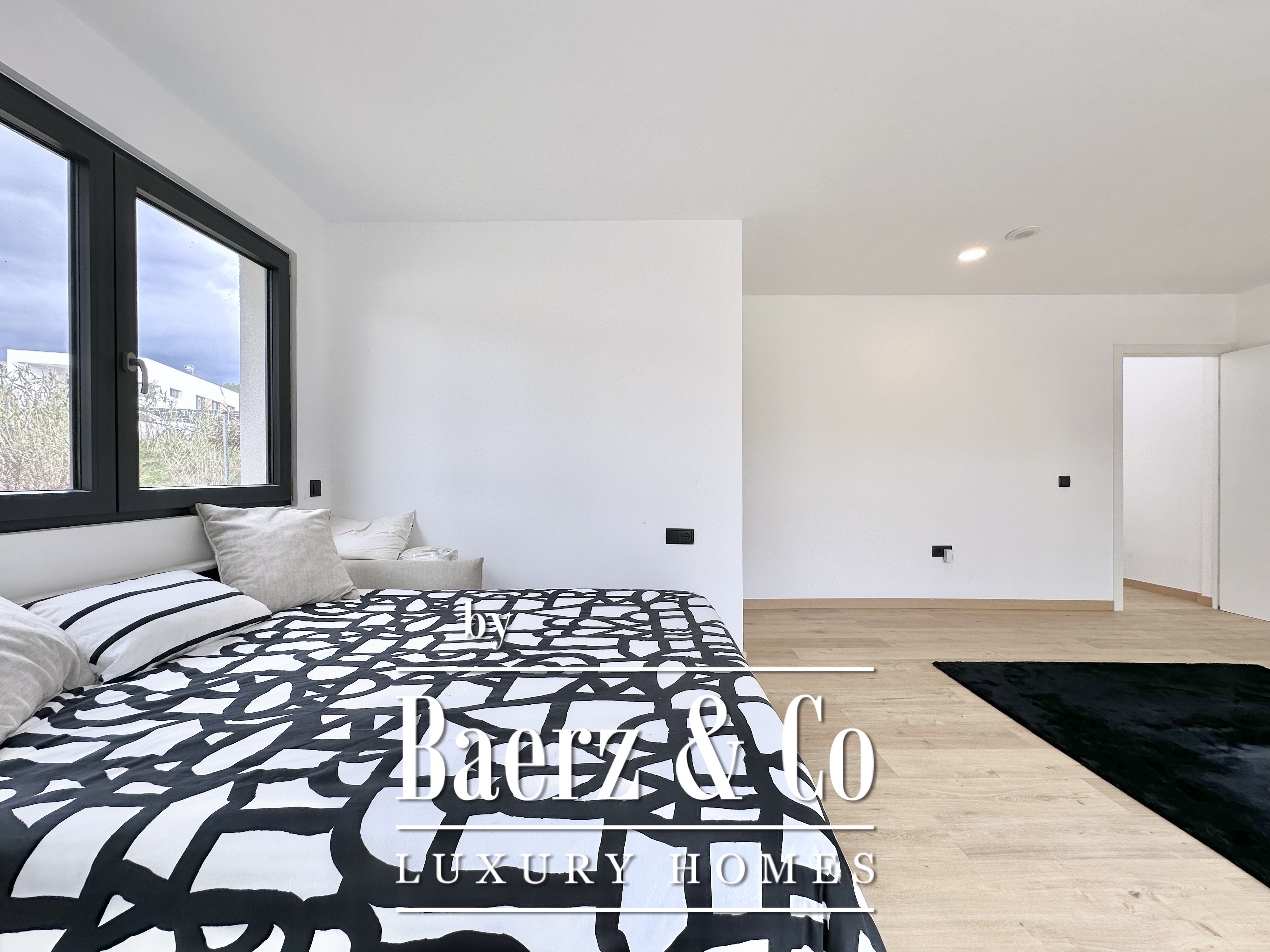 De opzet is bewust open en licht gehouden. De royale woon- en eetkamer opent met vloeiend schuivende glazen deuren van vloer tot plafond naar de tuin en het zwembad, waardoor binnen en buiten naadloos in elkaar overlopen. De moderne, volledig uitgeruste keuken combineert functionaliteit met esthetische helderheid. Er zijn vier slaapkamers, waarvan twee met eigen badkamer, die flexibele mogelijkheden bieden. Op de begane grond delen twee tweepersoonskamers een complete badkamer en geven direct toegang tot het zwembad, terwijl de master suite beschikt over een eigen kleedruimte en privébadkamer met uitzicht op de tuin. Op het souterrain bevindt zich een gastensuite en twee ruime multifunctionele kamers, geschikt voor ontspanning, fitness of werk. Tevens is er plaats voor twee auto's.