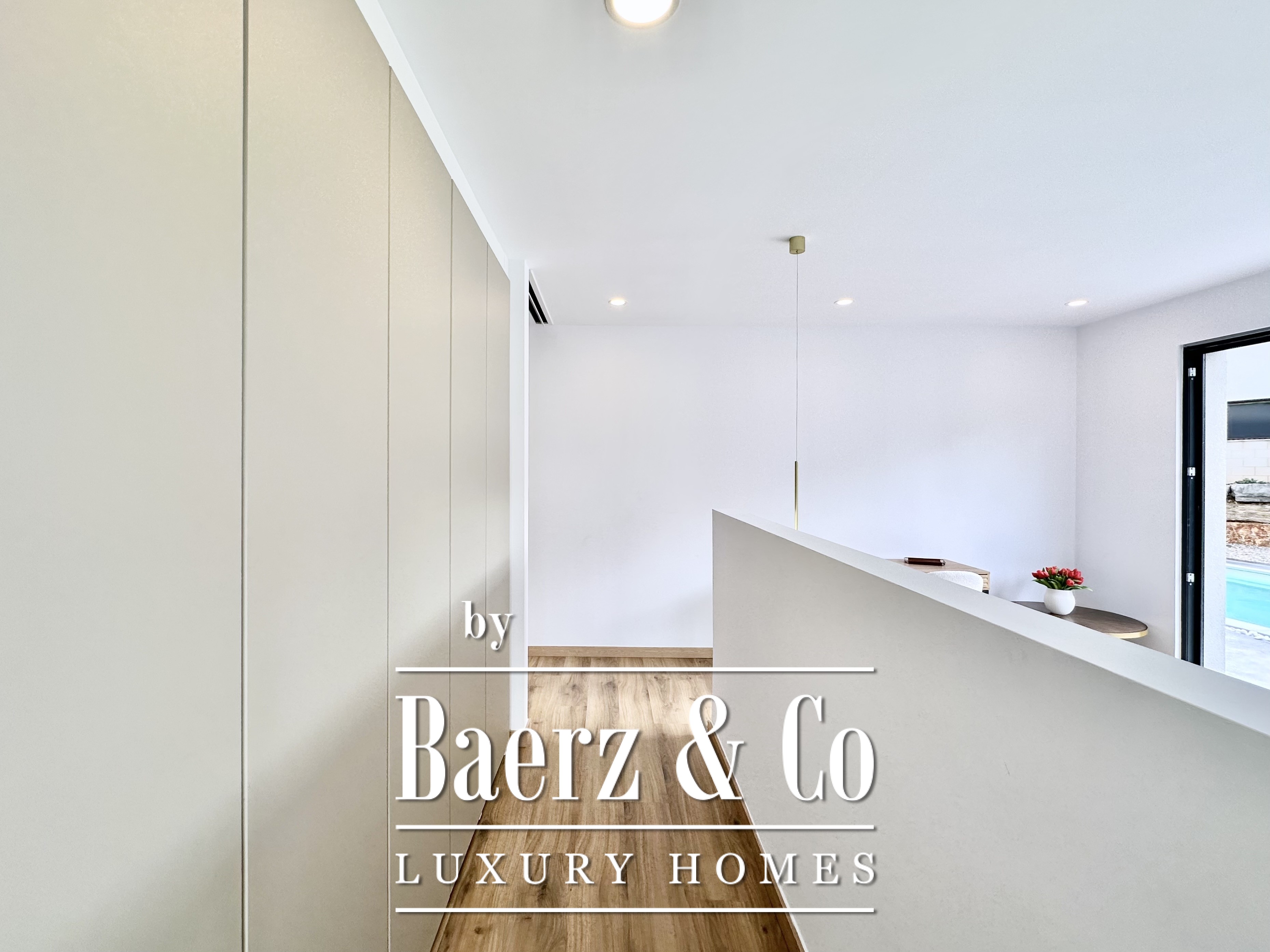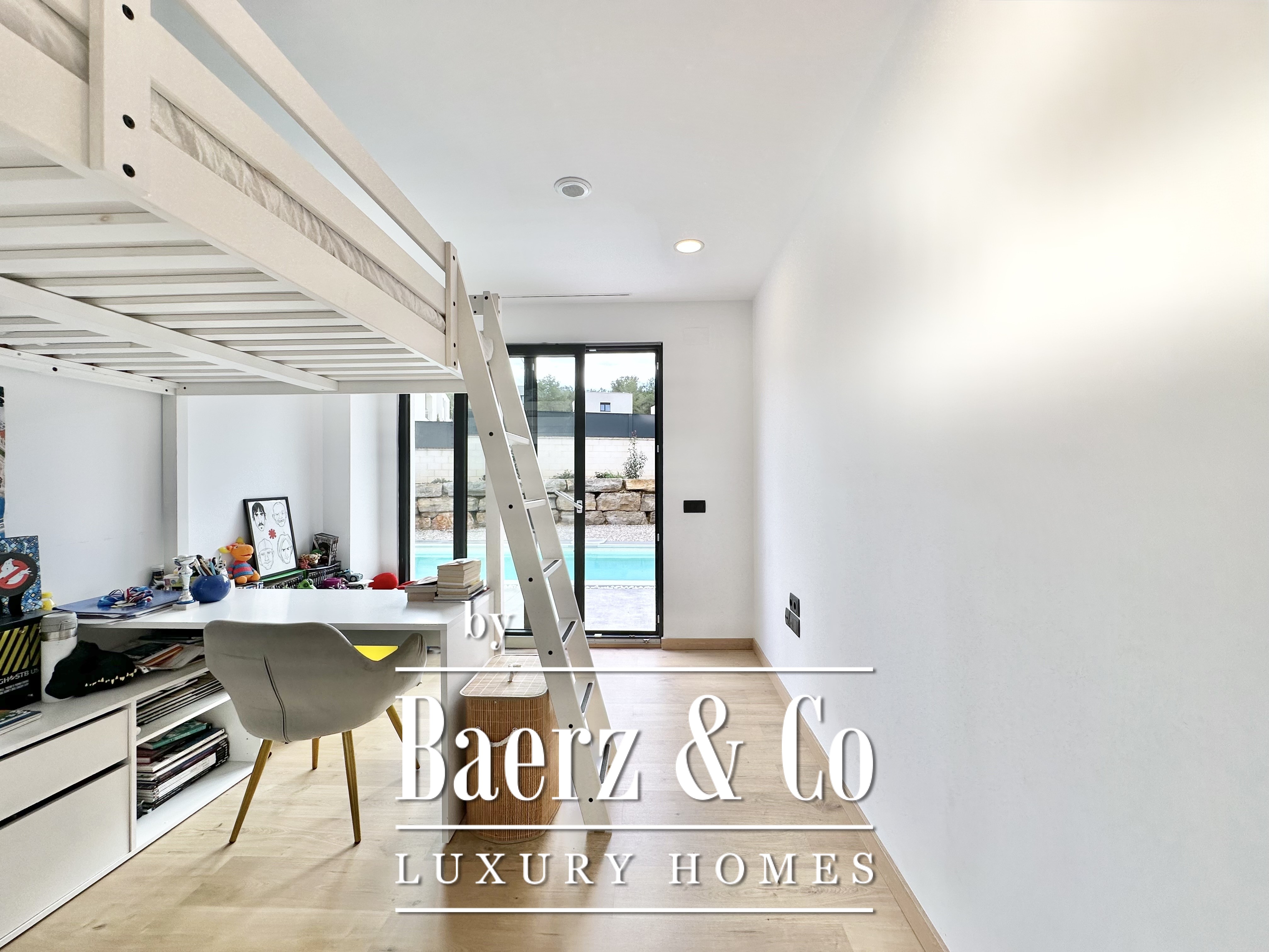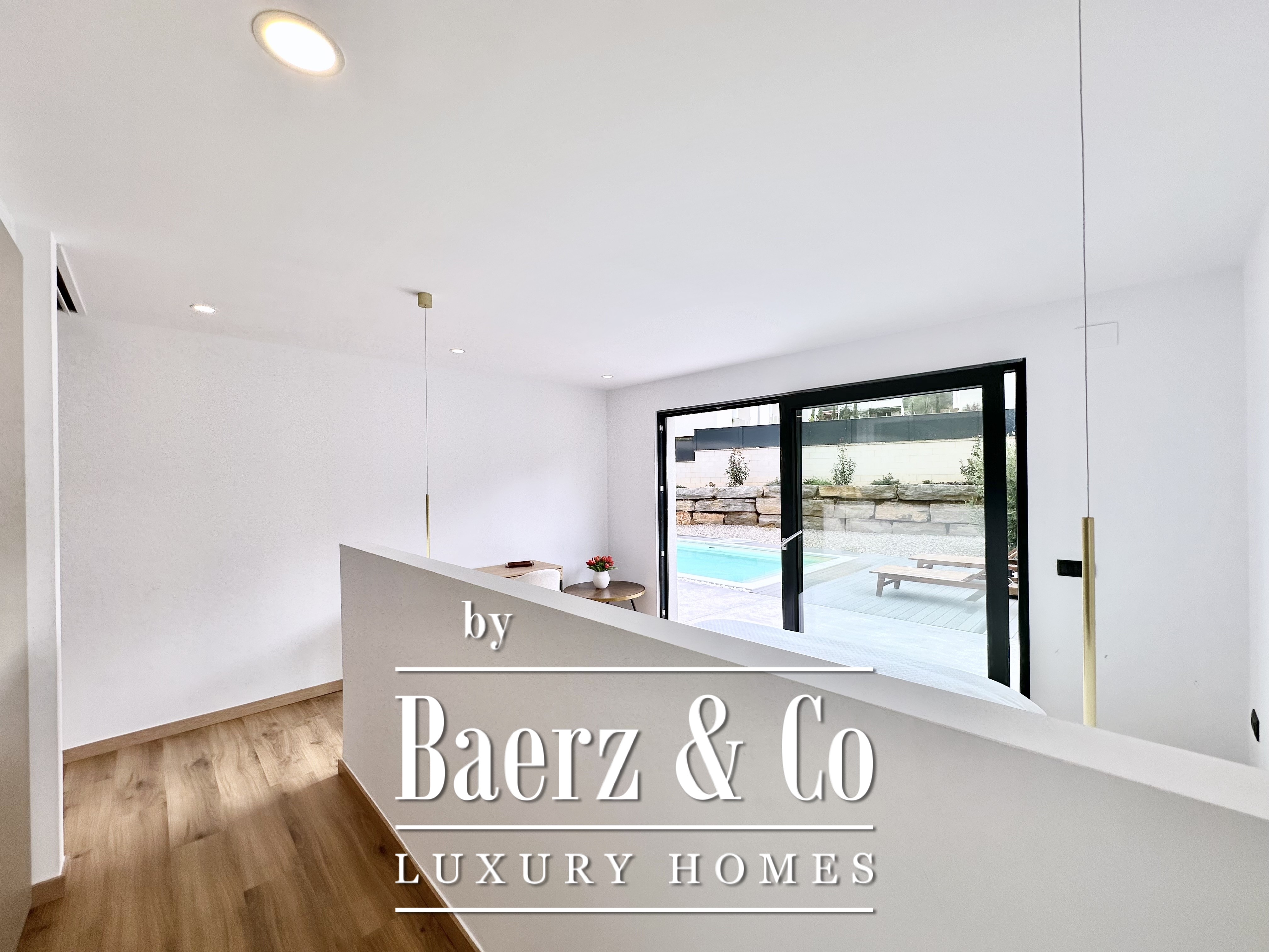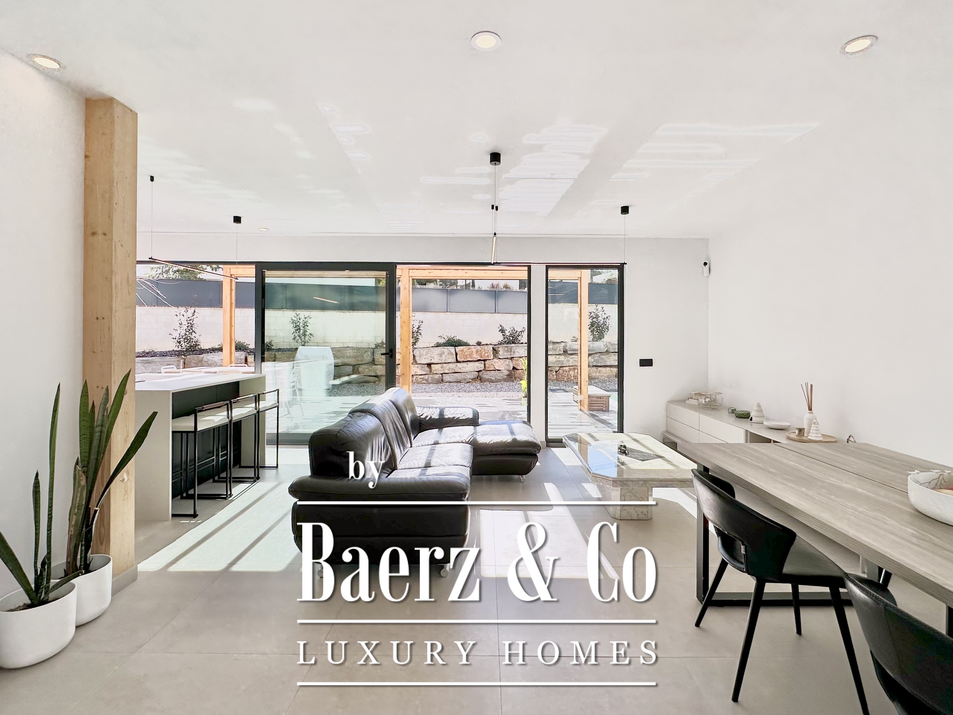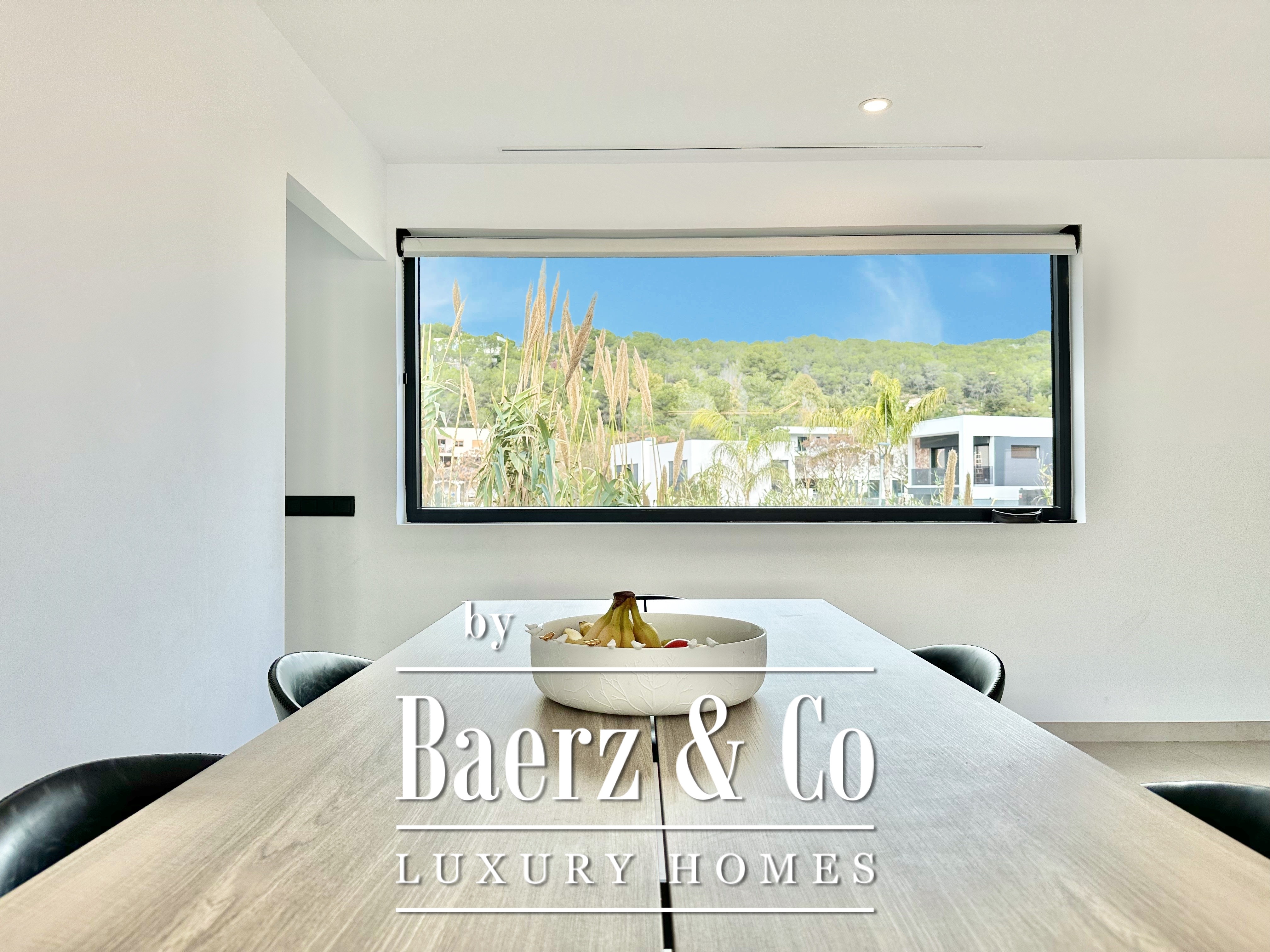 De opzet is bewust open en licht gehouden. De royale woon- en eetkamer opent met vloeiend schuivende glazen deuren van vloer tot plafond naar de tuin en het zwembad, waardoor binnen en buiten naadloos in elkaar overlopen. De moderne, volledig uitgeruste keuken combineert functionaliteit met esthetische helderheid. Er zijn vier slaapkamers, waarvan twee met eigen badkamer, die flexibele mogelijkheden bieden. Op de begane grond delen twee tweepersoonskamers een complete badkamer en geven direct toegang tot het zwembad, terwijl de master suite beschikt over een eigen kleedruimte en privébadkamer met uitzicht op de tuin. Op het souterrain bevindt zich een gastensuite en twee ruime multifunctionele kamers, geschikt voor ontspanning, fitness of werk. Tevens is er plaats voor twee auto's.