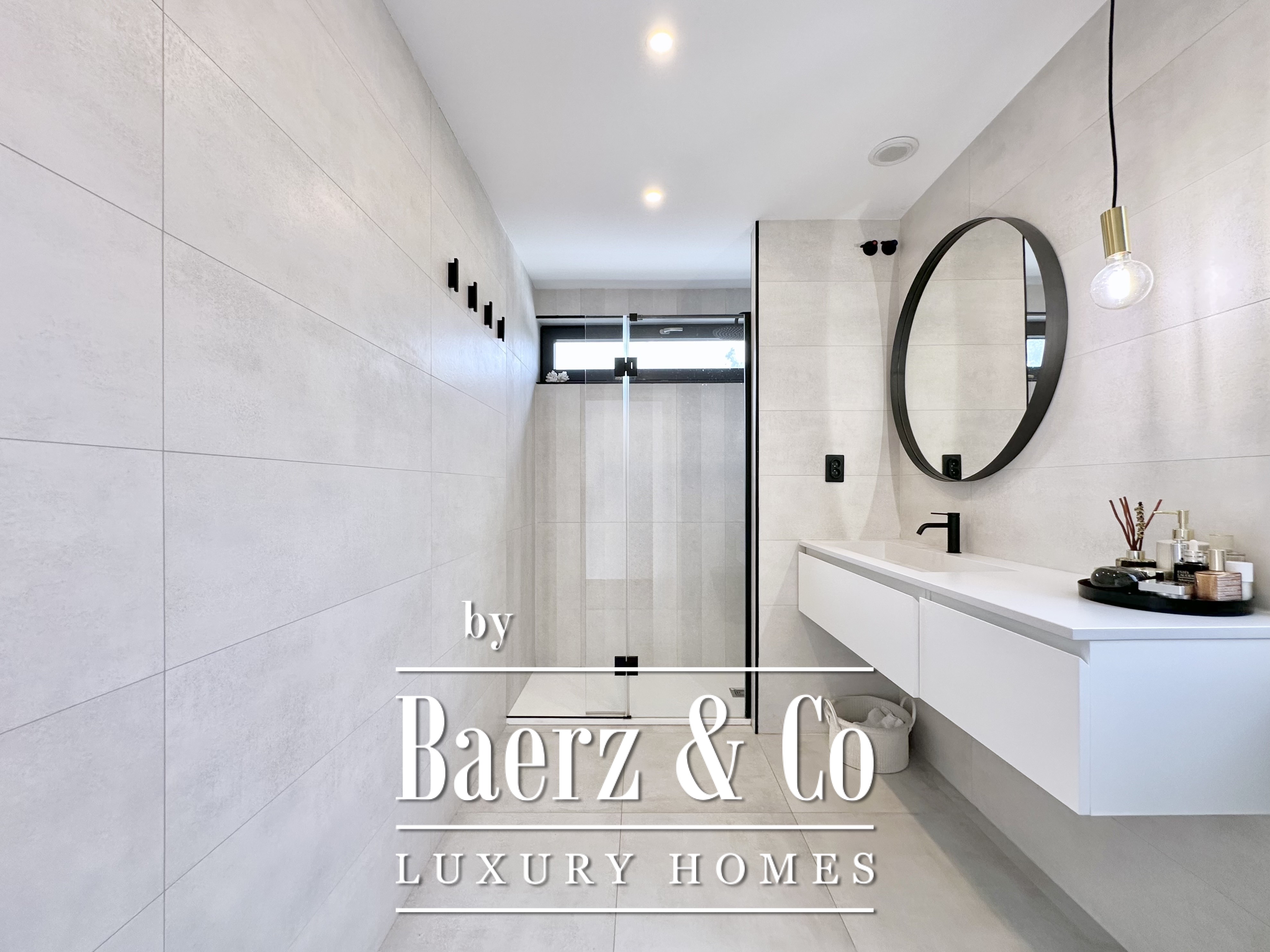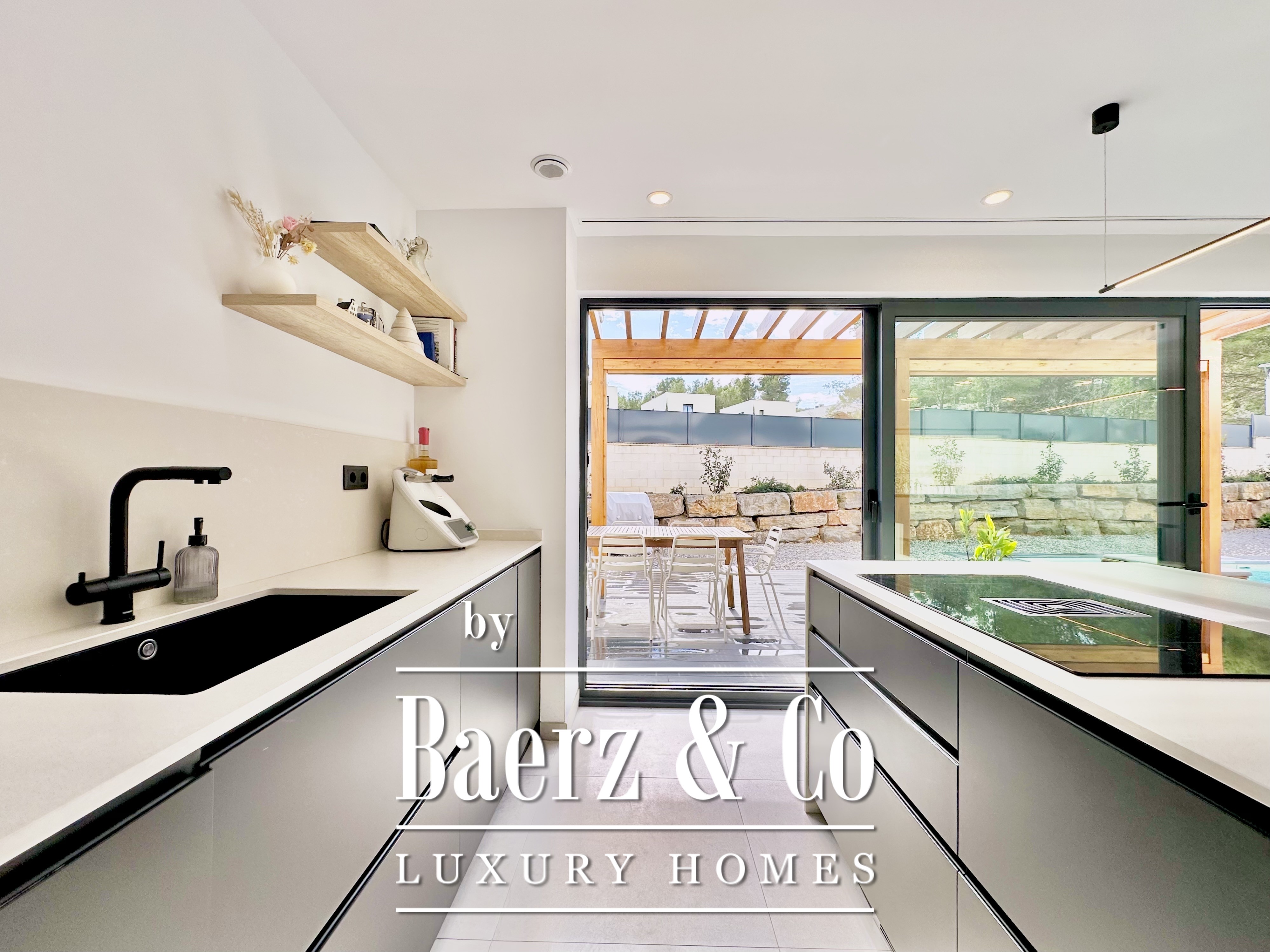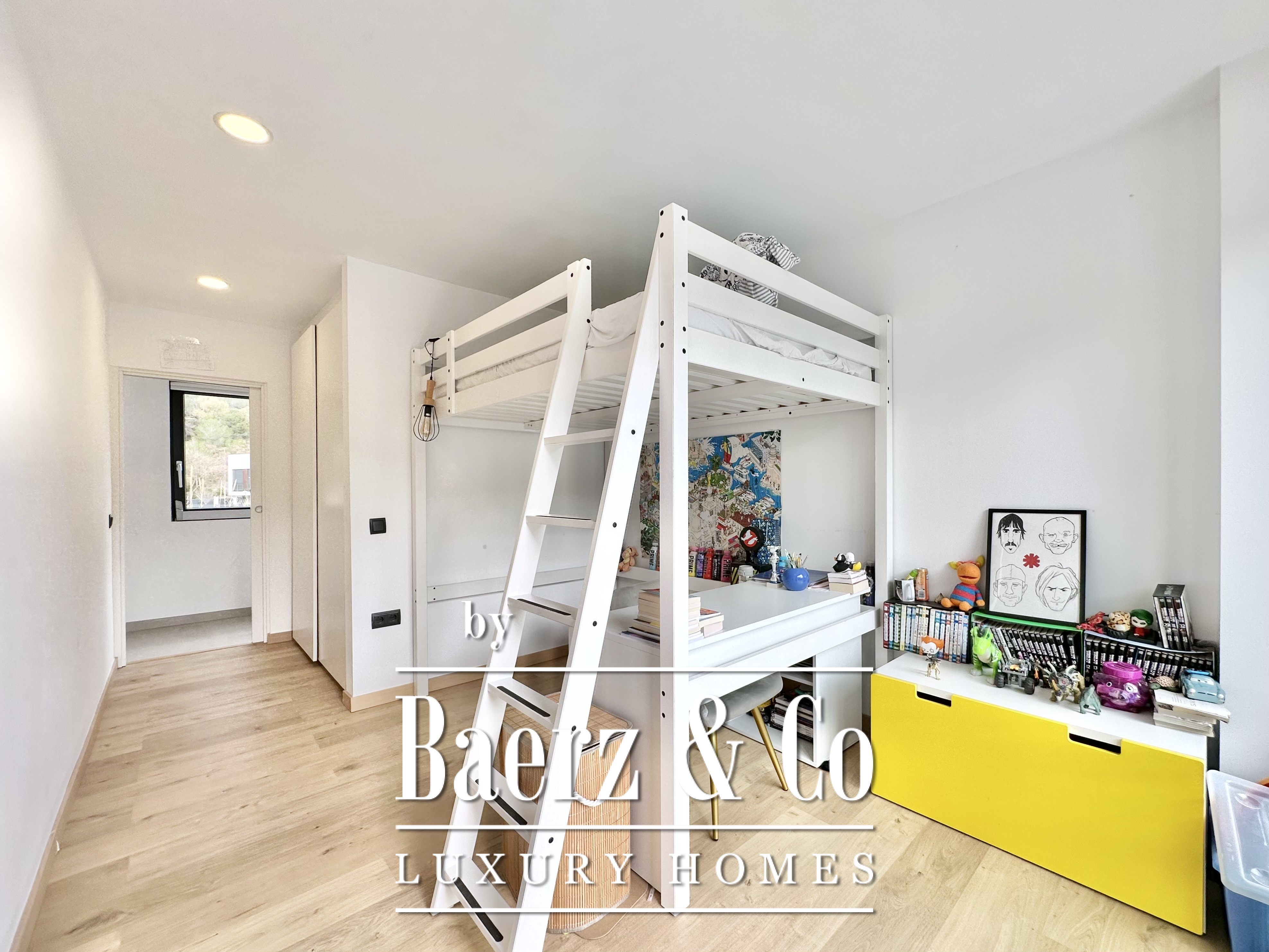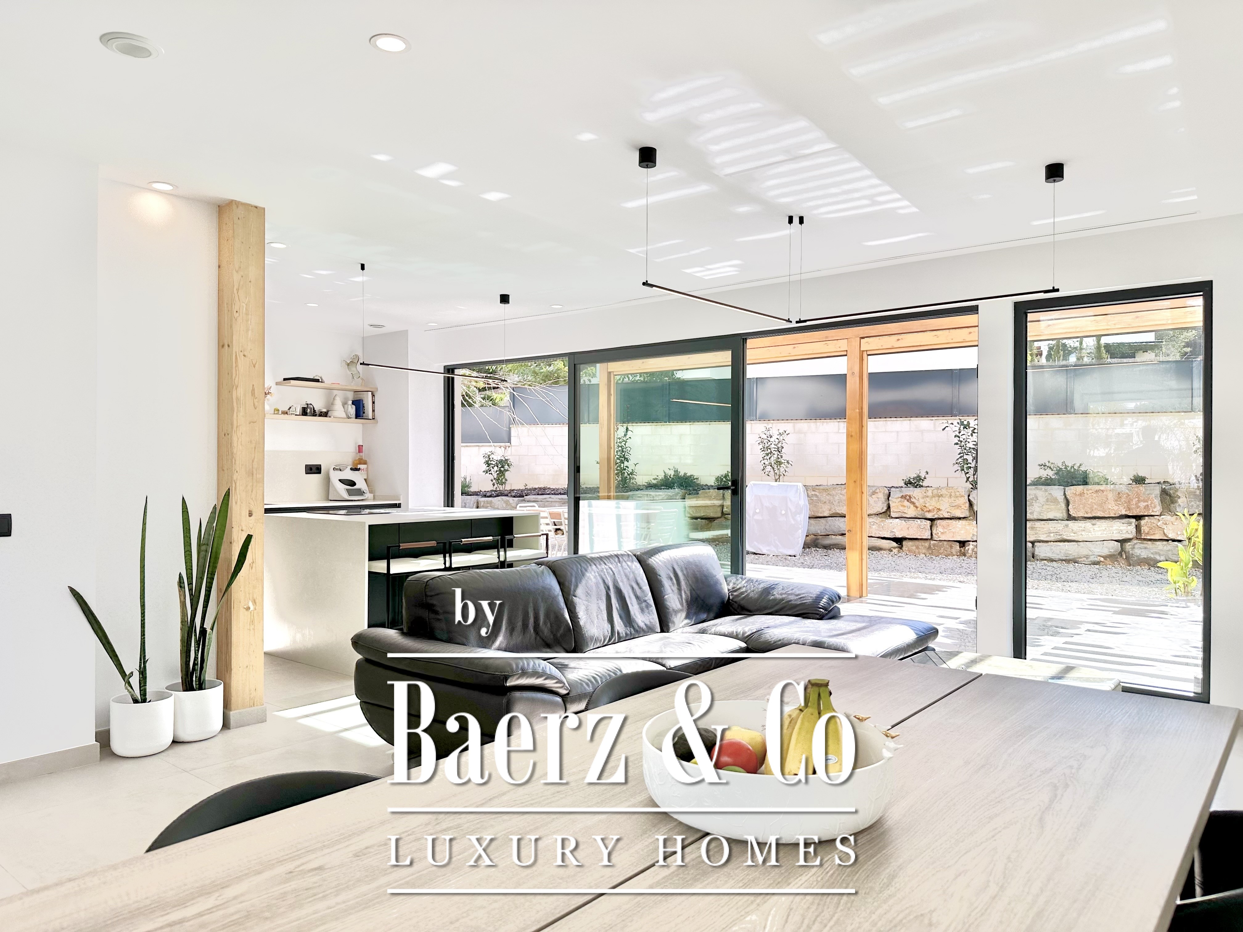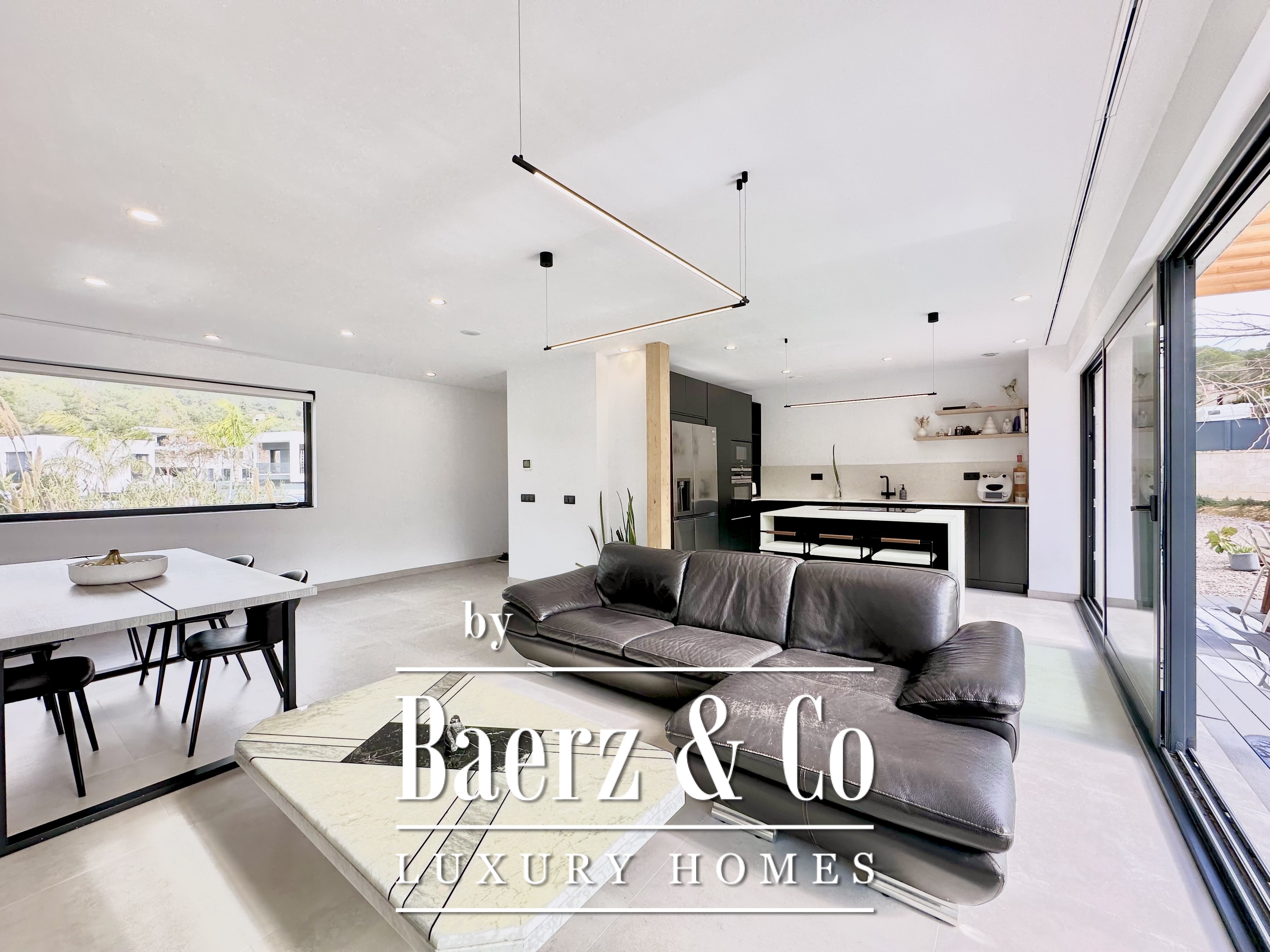 De opzet is bewust open en licht gehouden. De royale woon- en eetkamer opent met vloeiend schuivende glazen deuren van vloer tot plafond naar de tuin en het zwembad, waardoor binnen en buiten naadloos in elkaar overlopen. De moderne, volledig uitgeruste keuken combineert functionaliteit met esthetische helderheid. Er zijn vier slaapkamers, waarvan twee met eigen badkamer, die flexibele mogelijkheden bieden. Op de begane grond delen twee tweepersoonskamers een complete badkamer en geven direct toegang tot het zwembad, terwijl de master suite beschikt over een eigen kleedruimte en privébadkamer met uitzicht op de tuin. Op het souterrain bevindt zich een gastensuite en twee ruime multifunctionele kamers, geschikt voor ontspanning, fitness of werk. Tevens is er plaats voor twee auto's.