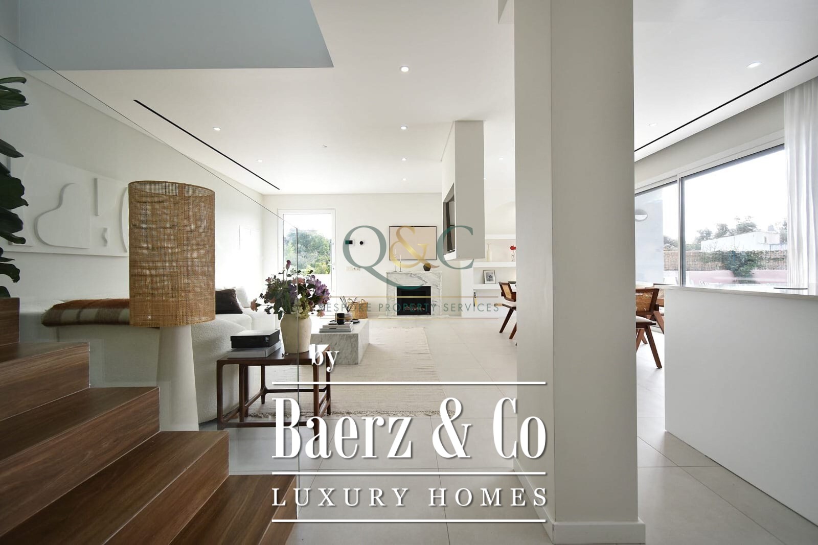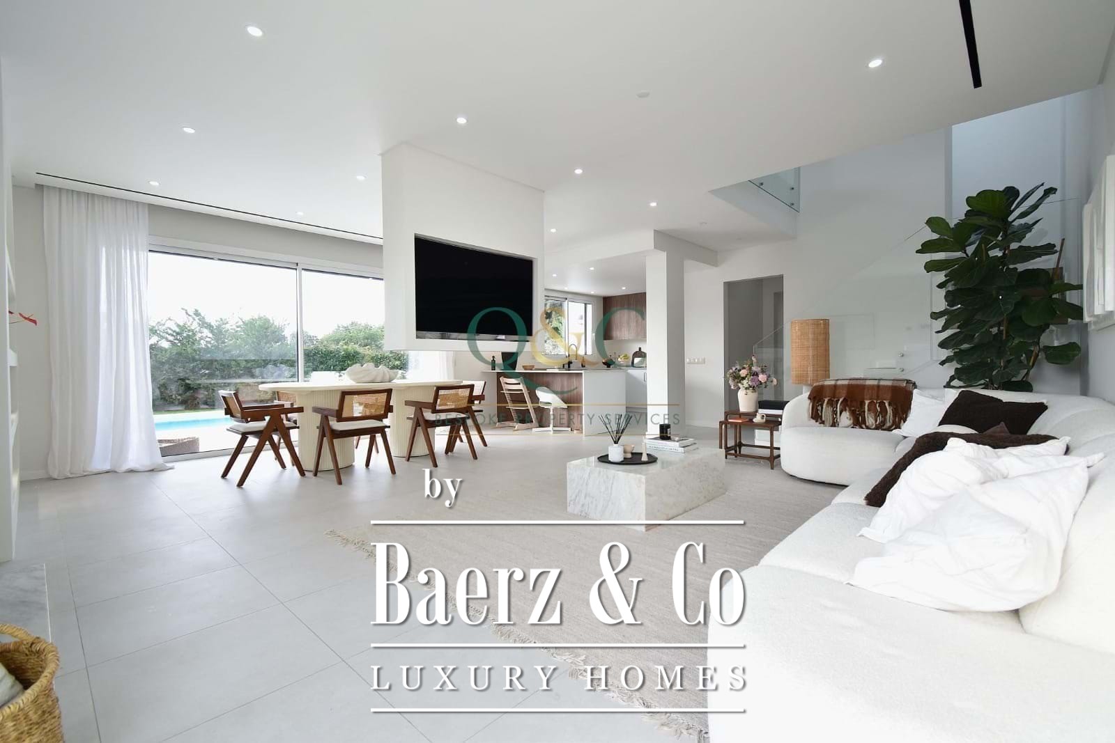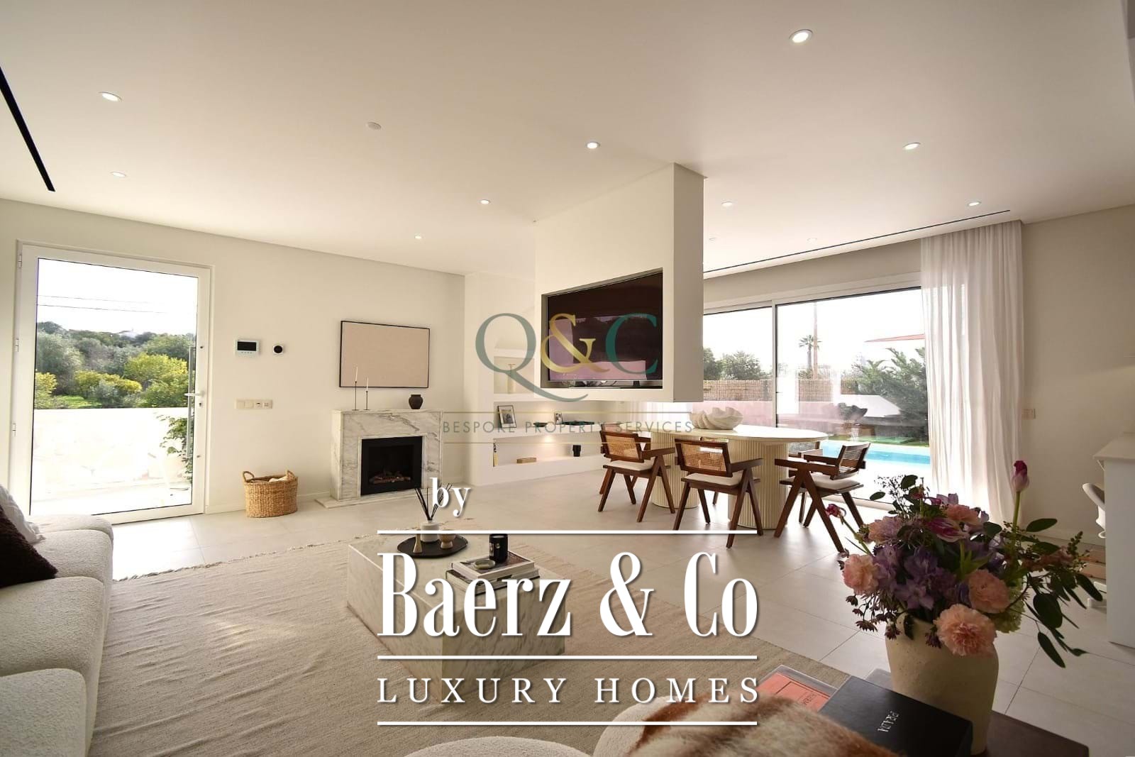 Op de begane grond zorgen de open woon- en eetkamer met marmeren ethanolhaard voor een subtiele balans tussen het binnenleven en zonlicht, ondersteund door centrale airconditioning. De open keuken, wasruimte en bijkeuken ondersteunen het dagelijks comfort, terwijl het terras uitnodigt tot ontspanning aan het chloorzwembad en de tuin, ontworpen voor stilte en rust. Vrijwel elke kamer is op het zuiden georiënteerd en baadt in overvloedig natuurlijk licht.