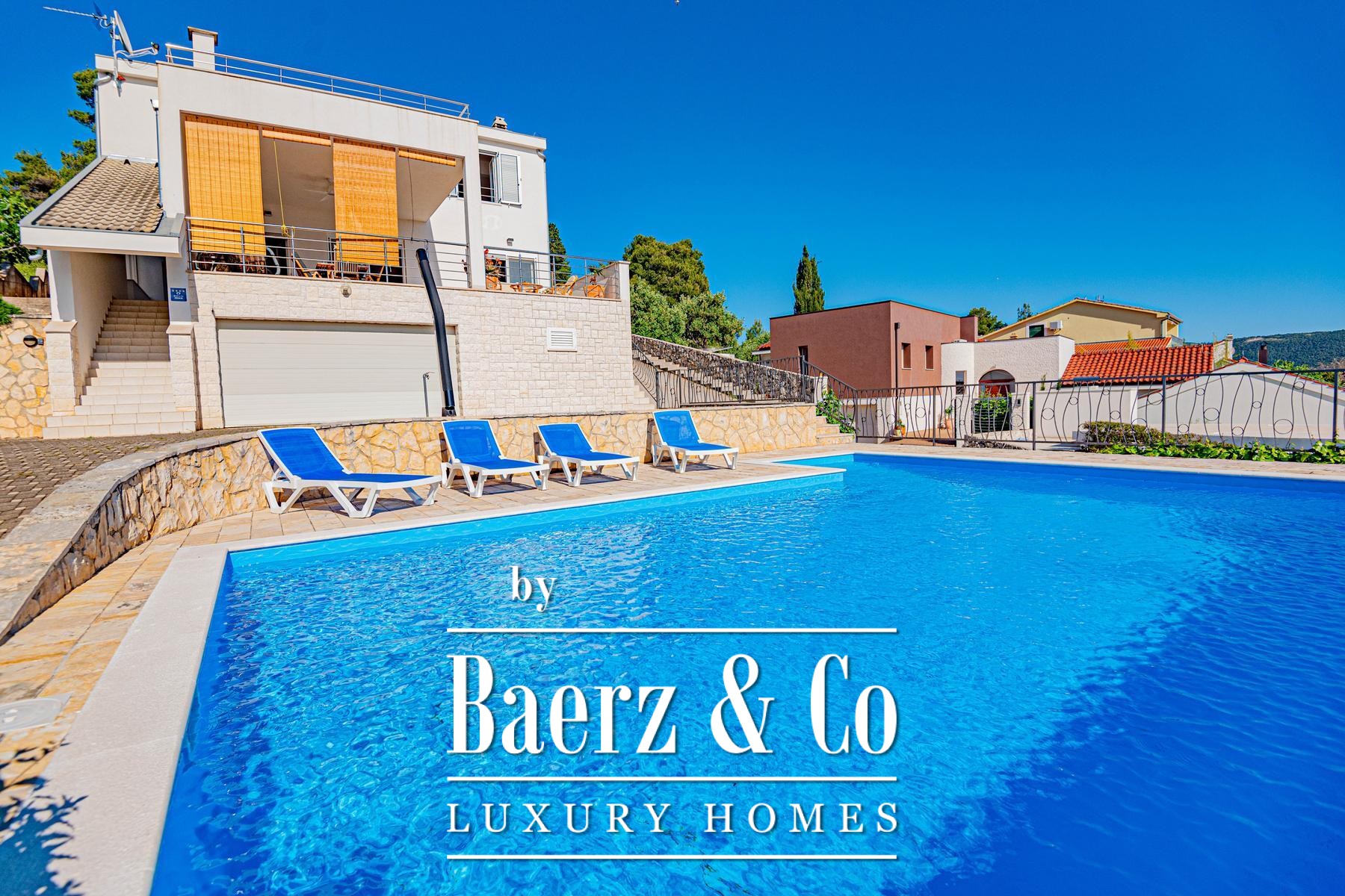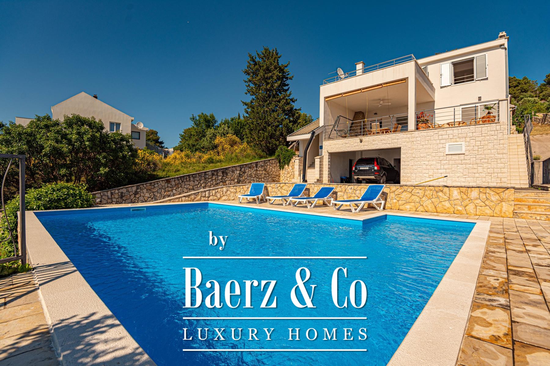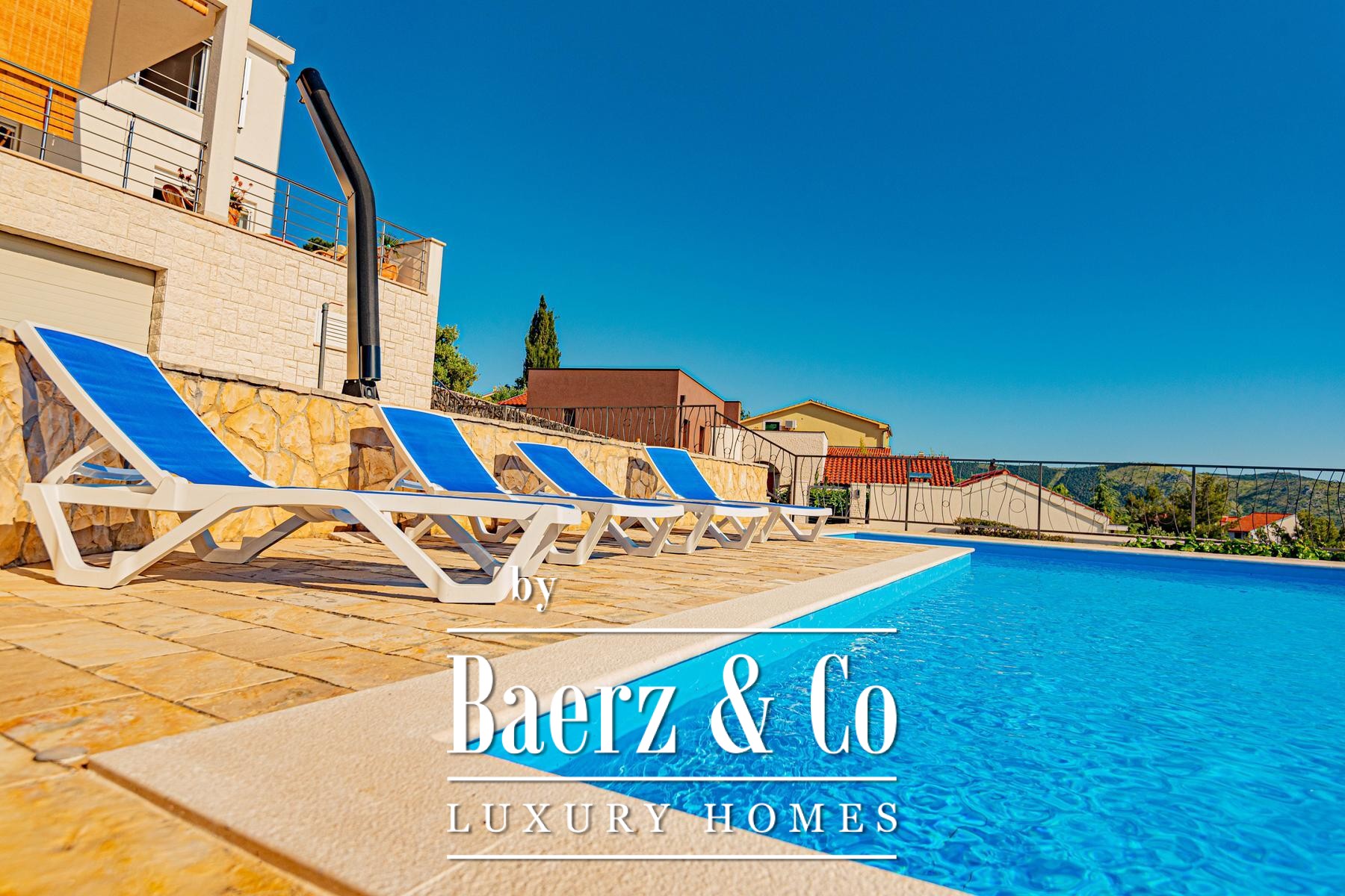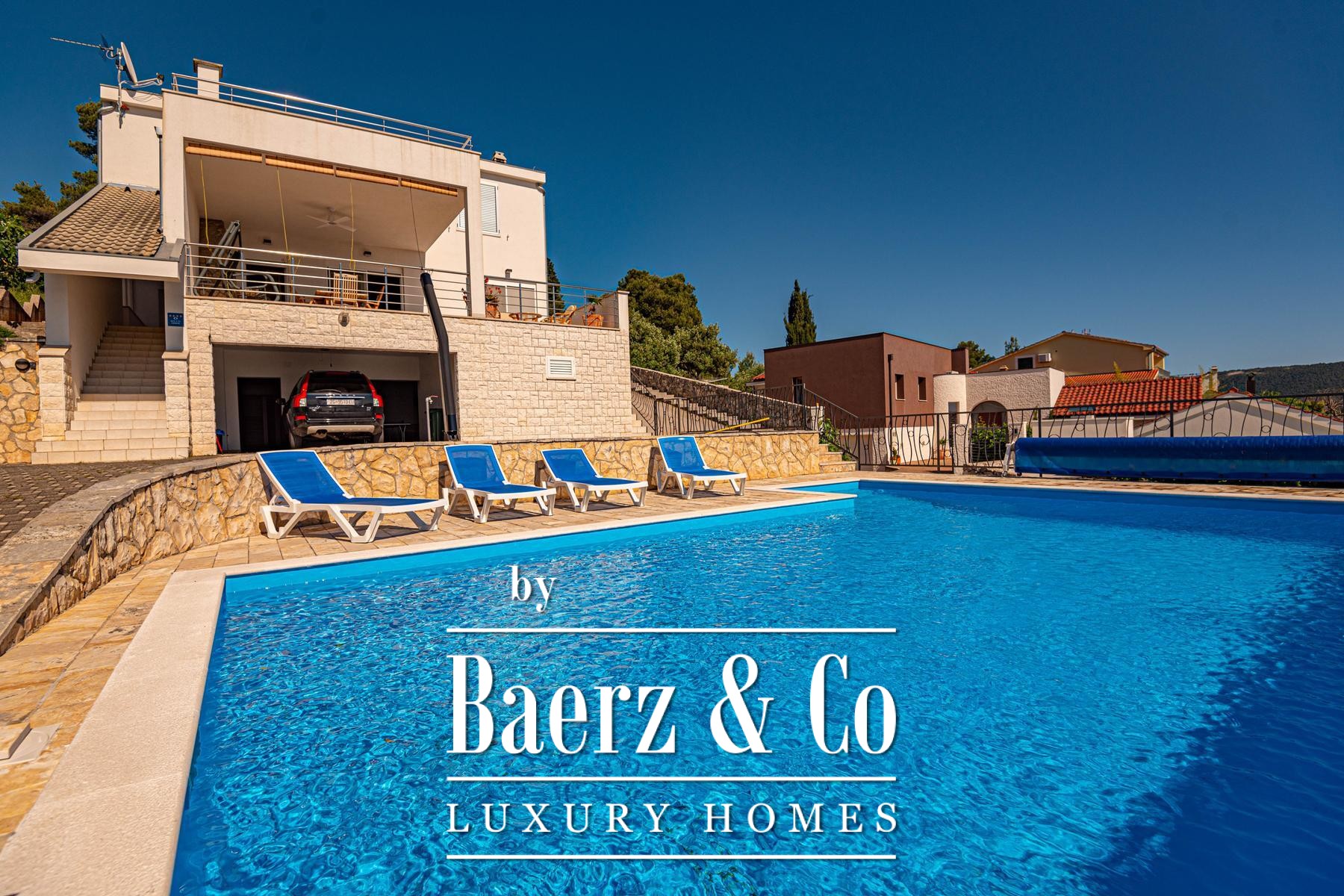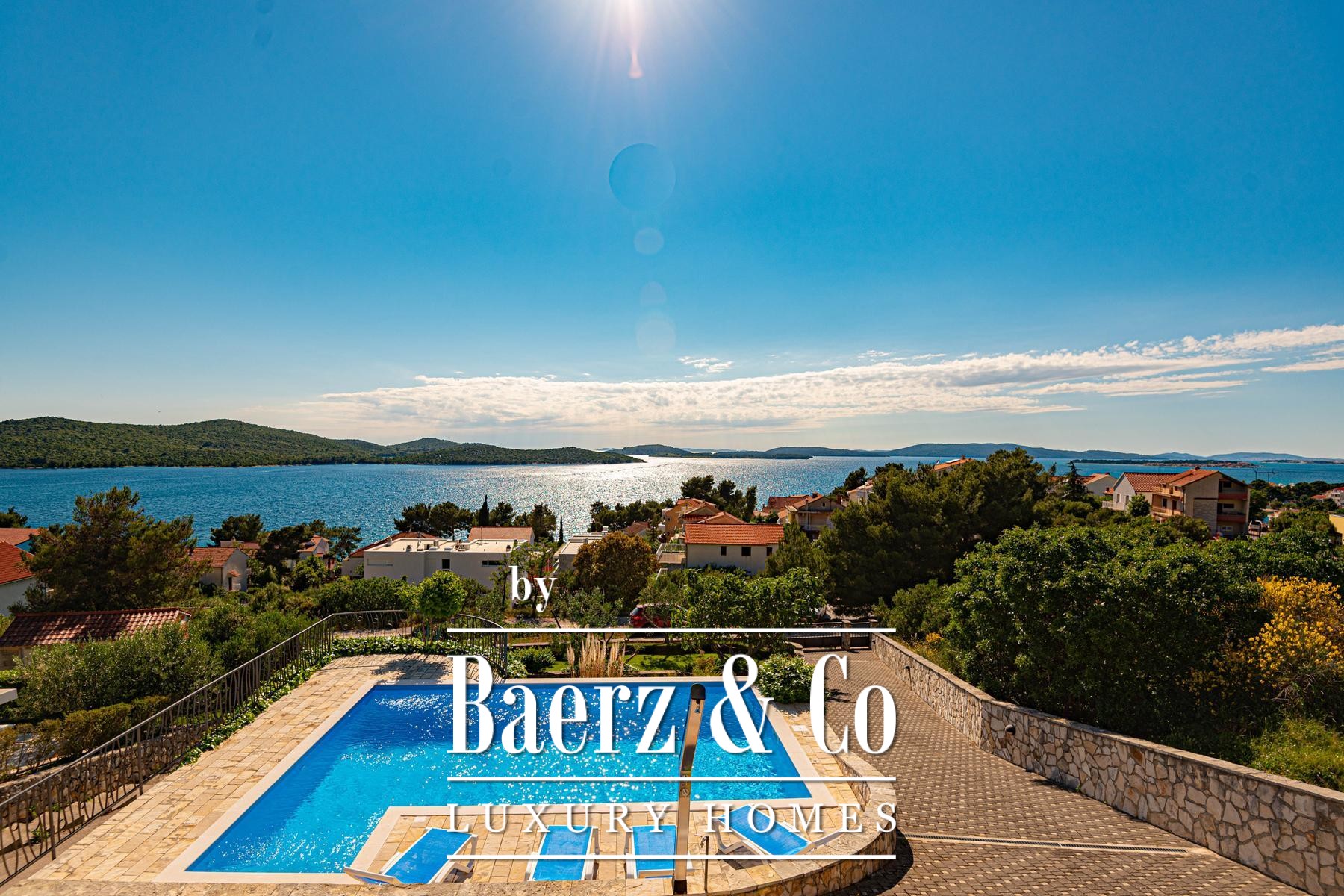 Šibenik, Žaborić, beautiful house with a swimming pool and panoramic sea views, total area 438 m² built in 2004. It is being sold fully furnished and equipped, and ideal for a vacation or tourist rental.Built on a plot of 1215 m², it consists of a basement with a garage for two cars, a machine room, a tavern, and two storage rooms. On the ground floor there is a spacious living room with a kitchen and a dining room, a storage room, laundry room and a toilet. The living room opens onto